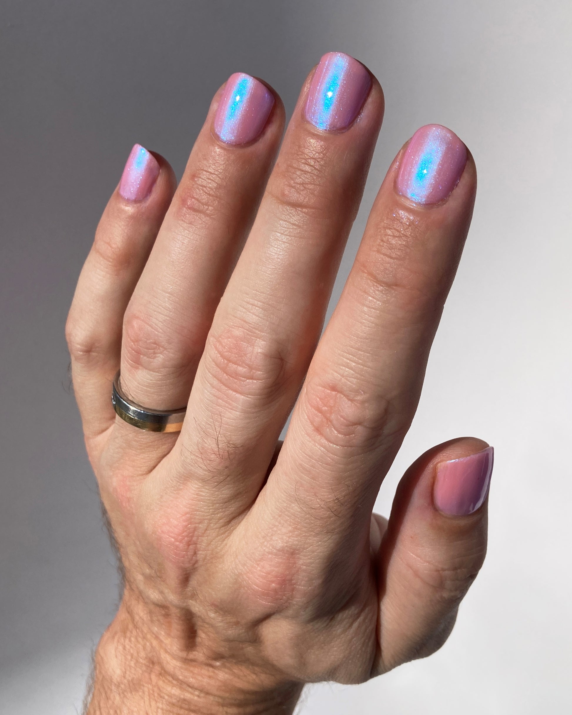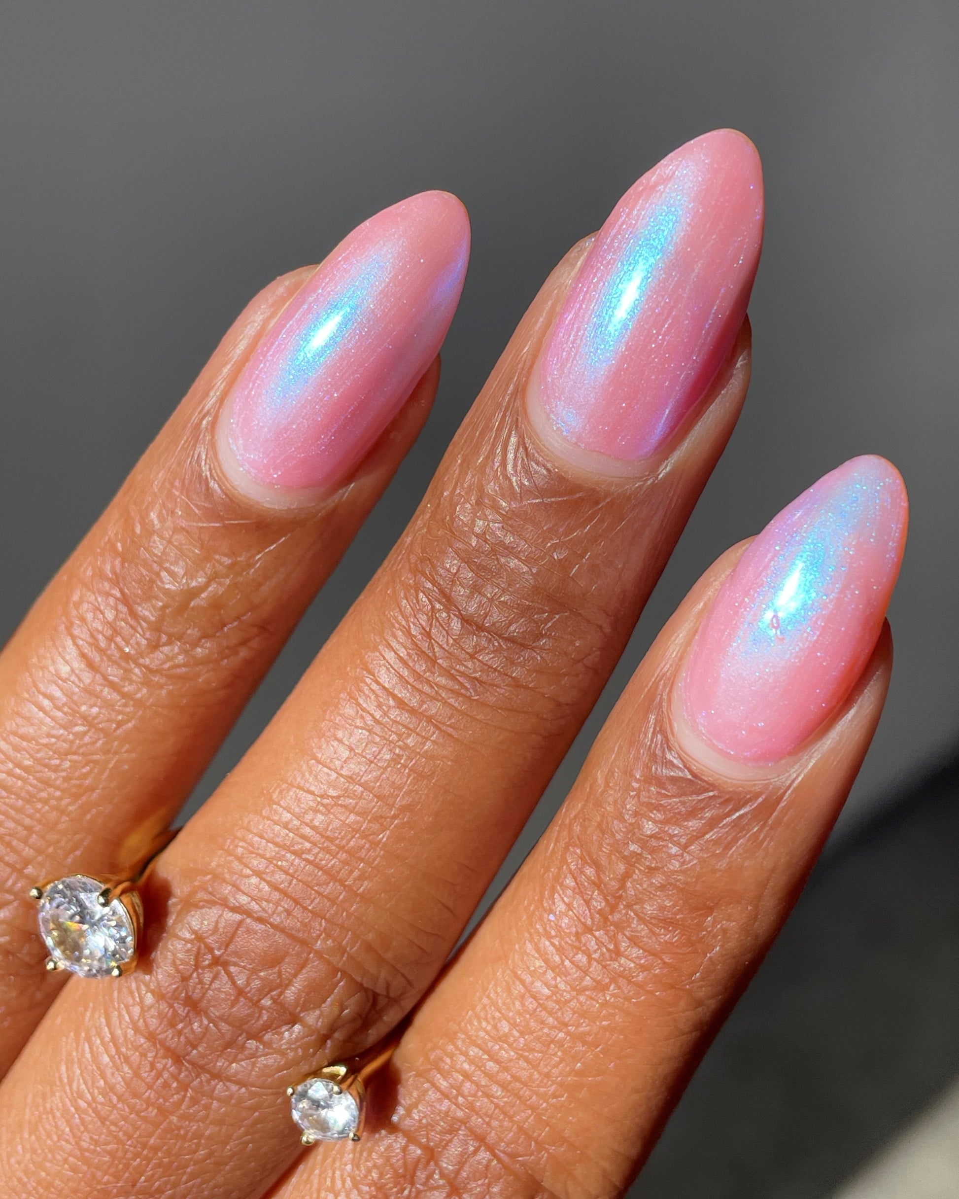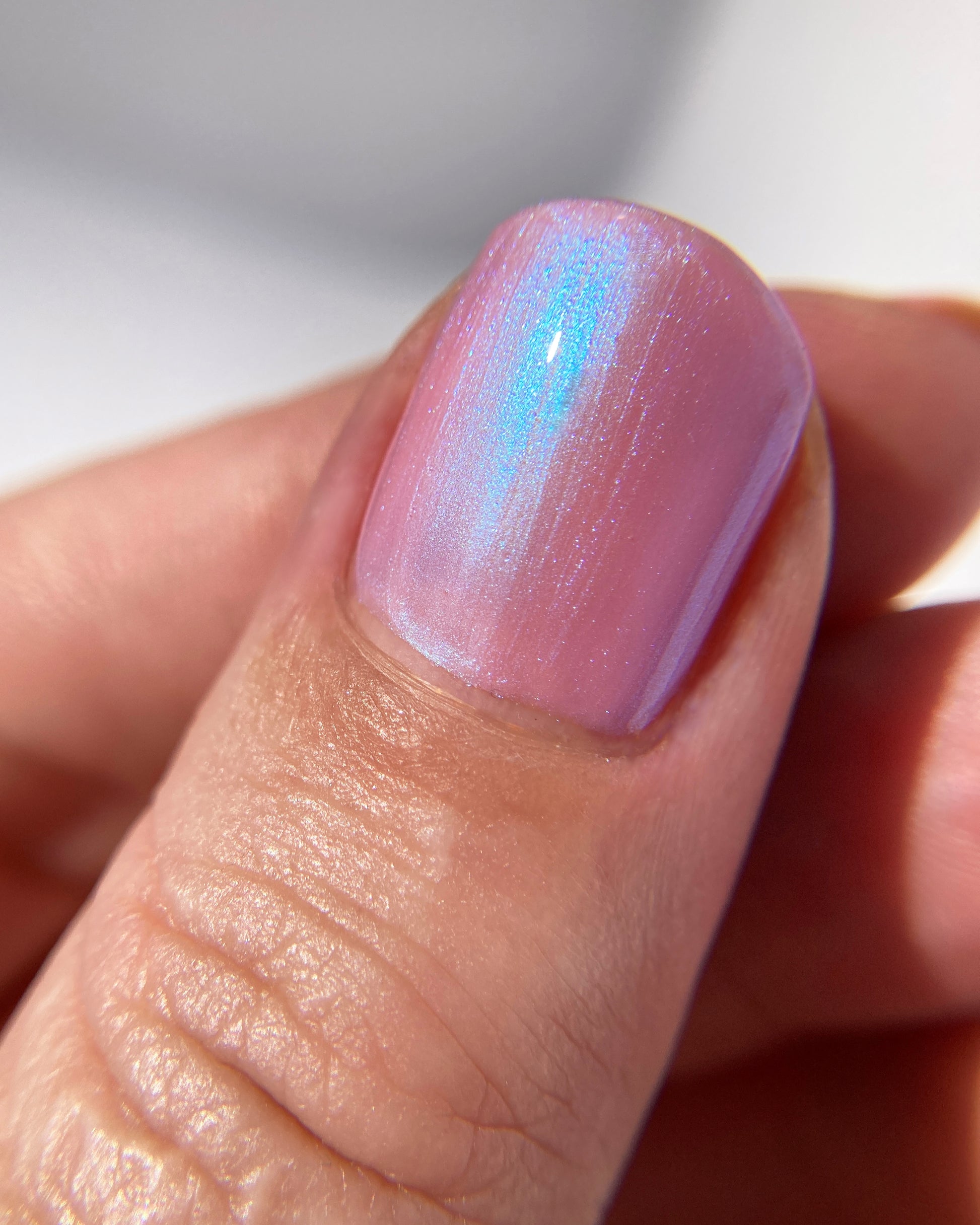 you’ve been hit by cupid’s arrow. fan the moonbeams from your sleeping eyes, as you coast through a romantic, rose-colored haze that’s shimmering with a blushing blue wink of midday magic. though this lacquer be but little, it is fierce, with an intoxicating iridescent sheen that’ll leave you utterly lovestruck.