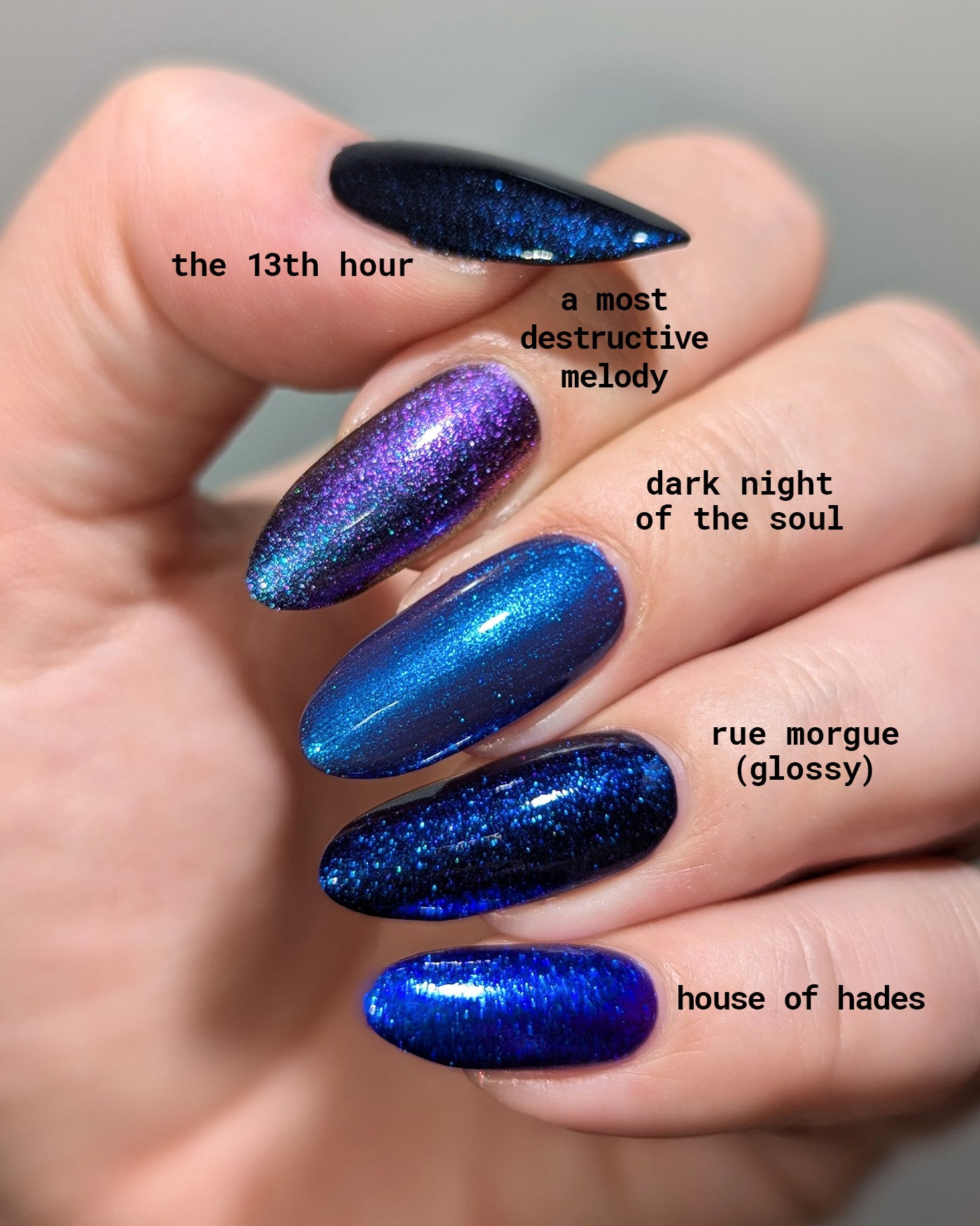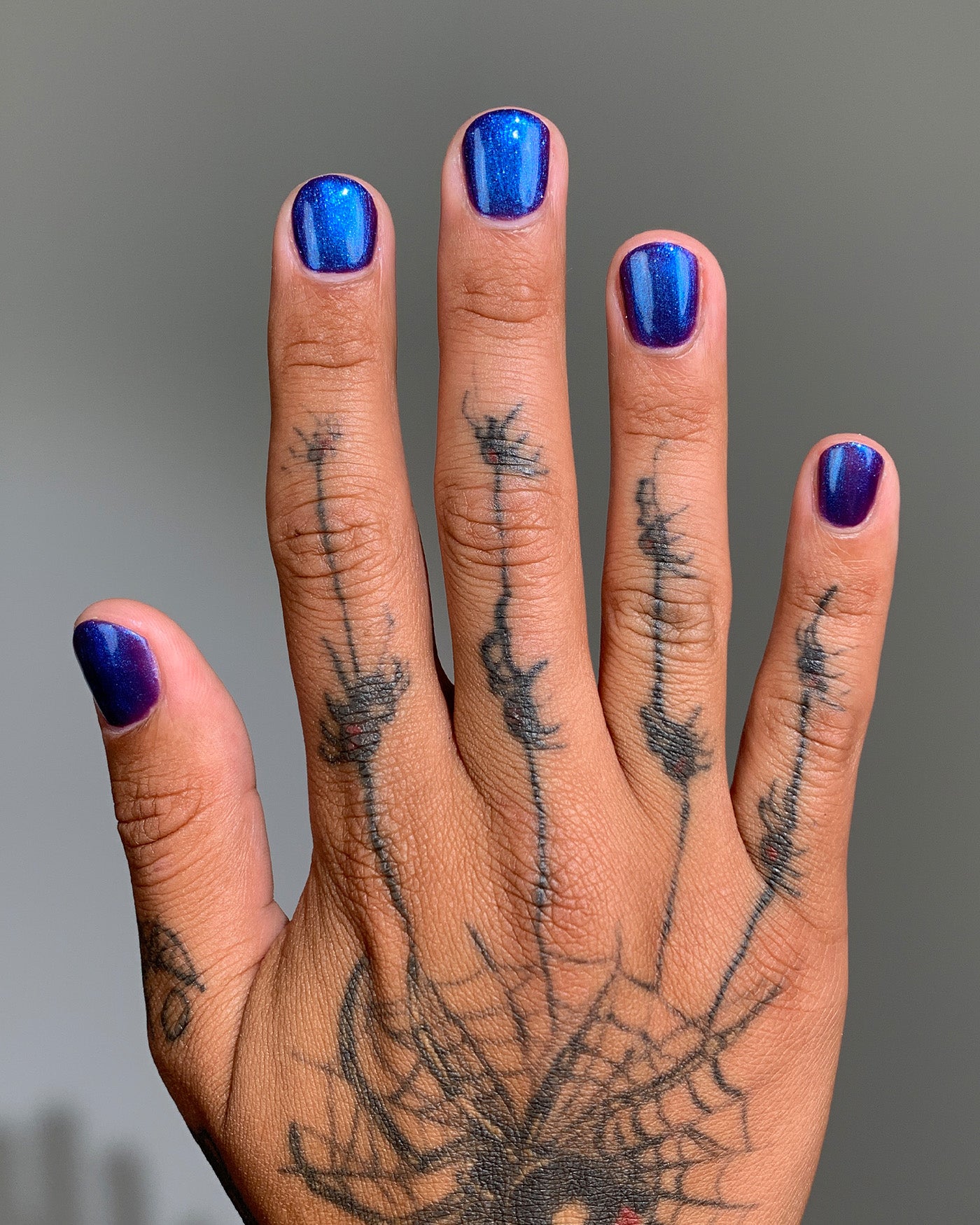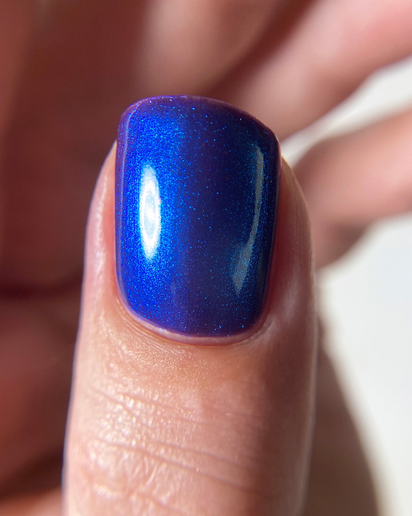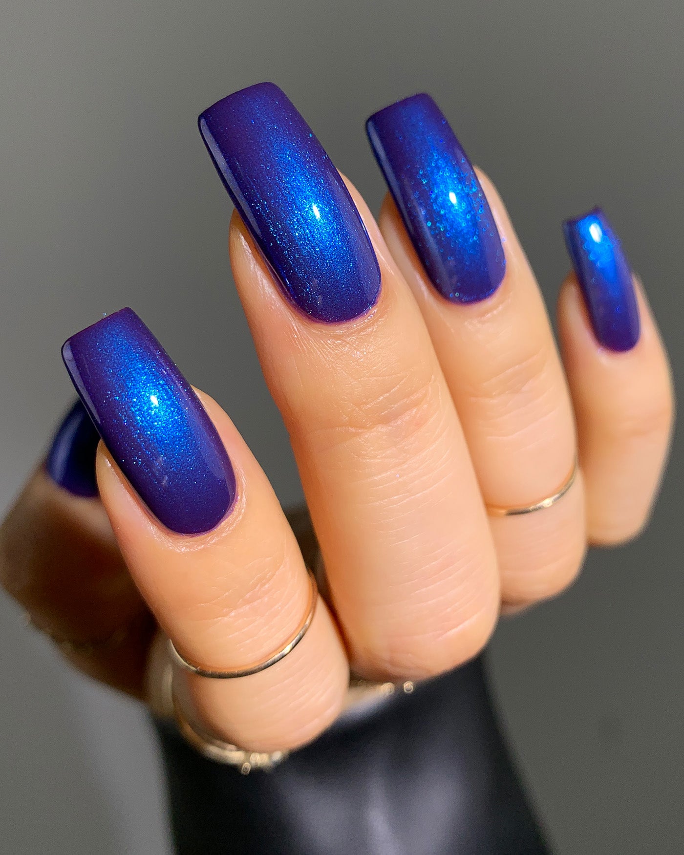 DARK NIGHT OF THE SOUL is a bright purple lacquer filled with blue shimmer. from the FALLEN SET.