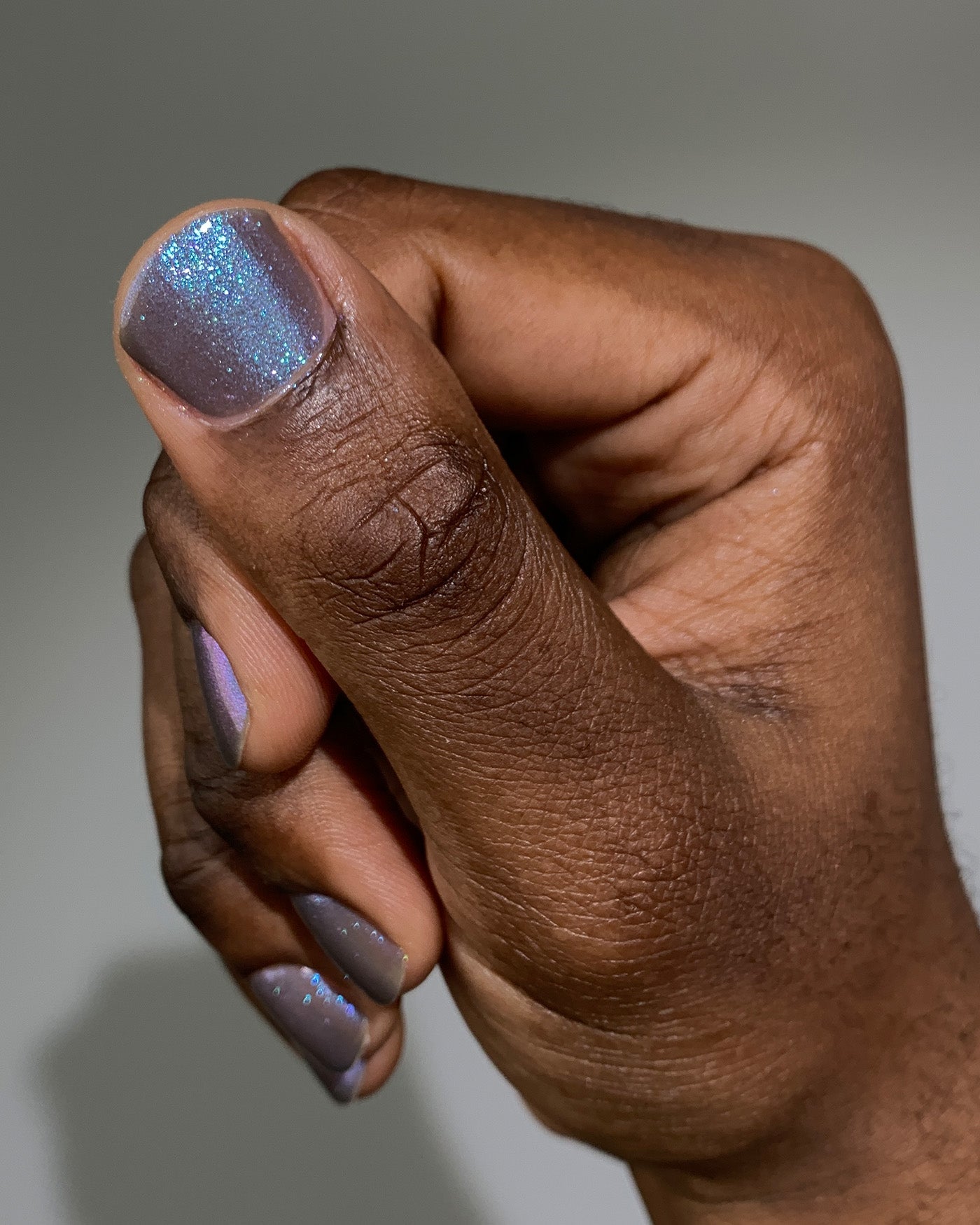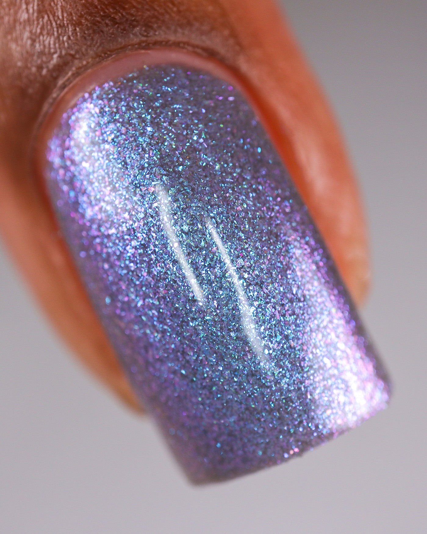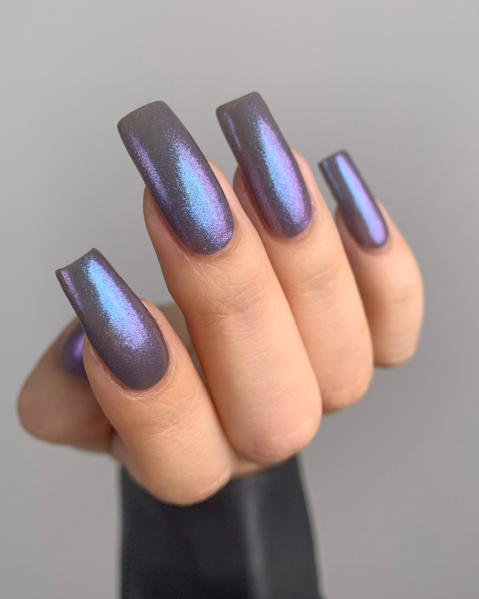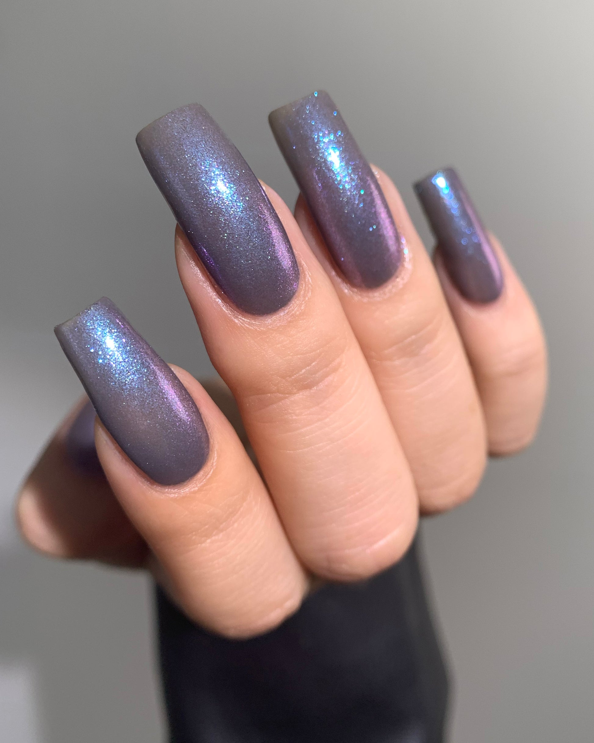 FALLEN ANGELS is a smokey gray lacquer filled with blue and purple shimmer.