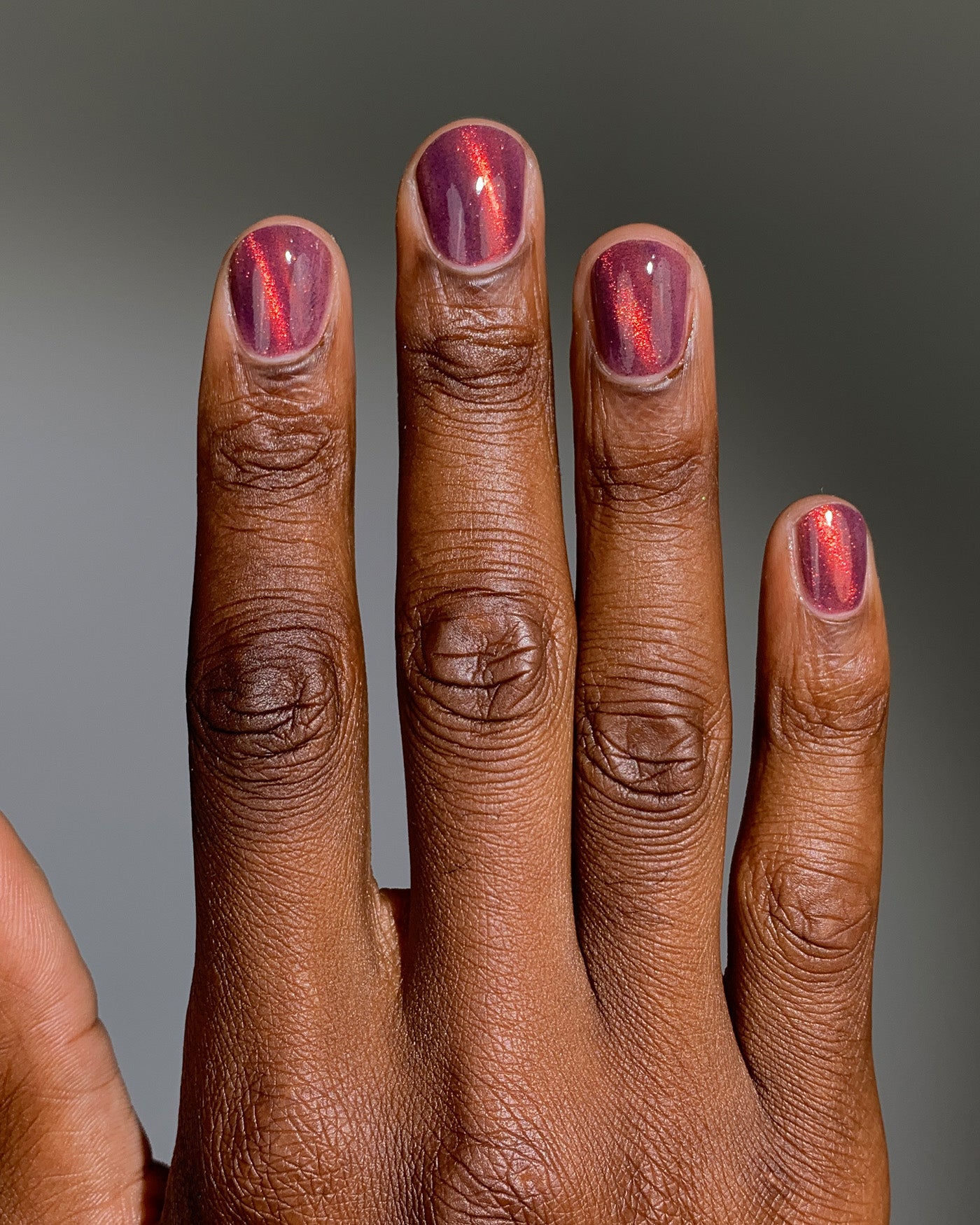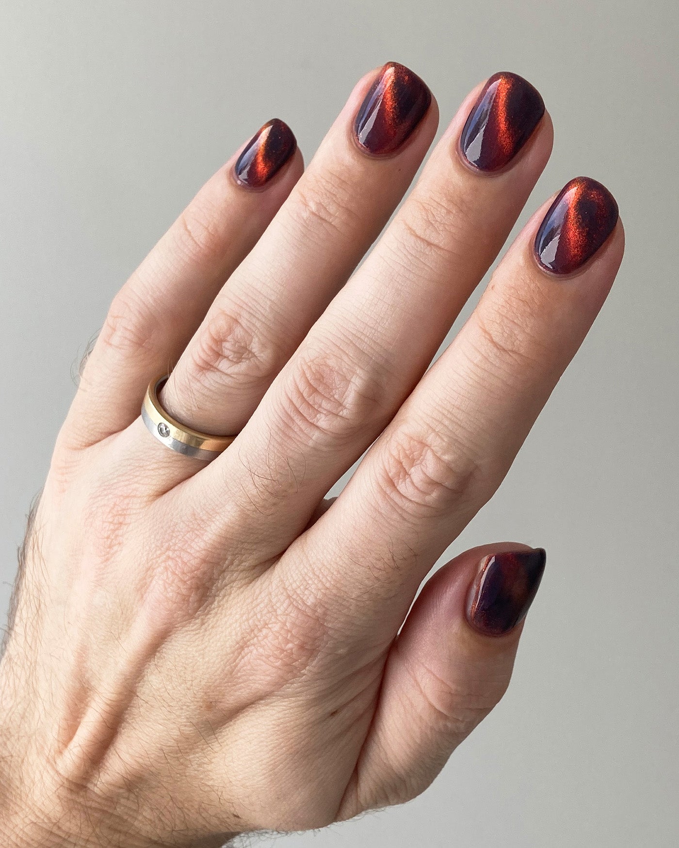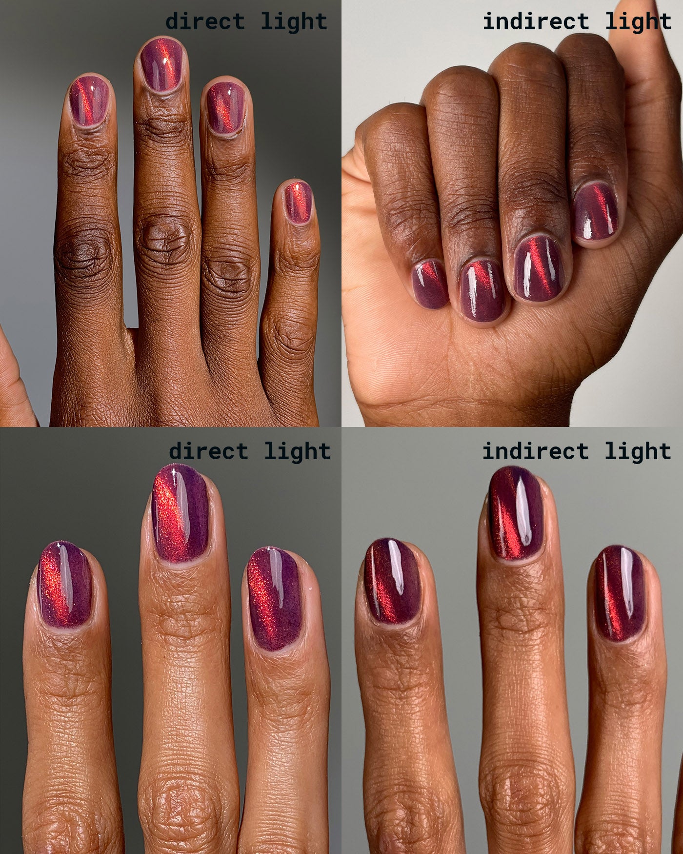 take your claws for a stroll through this perennial pick-me-up. once magnetized, its lush purple backdrop will come aglow with an energizing burst of red-orange beams, like the fiercest rush of setting sunlight. whether you harness the red-orange rays into a fierce cat-eye or a more abstract, velvety bloom, may it help you create a most-mindful, personal wonderland – even just for a little while.