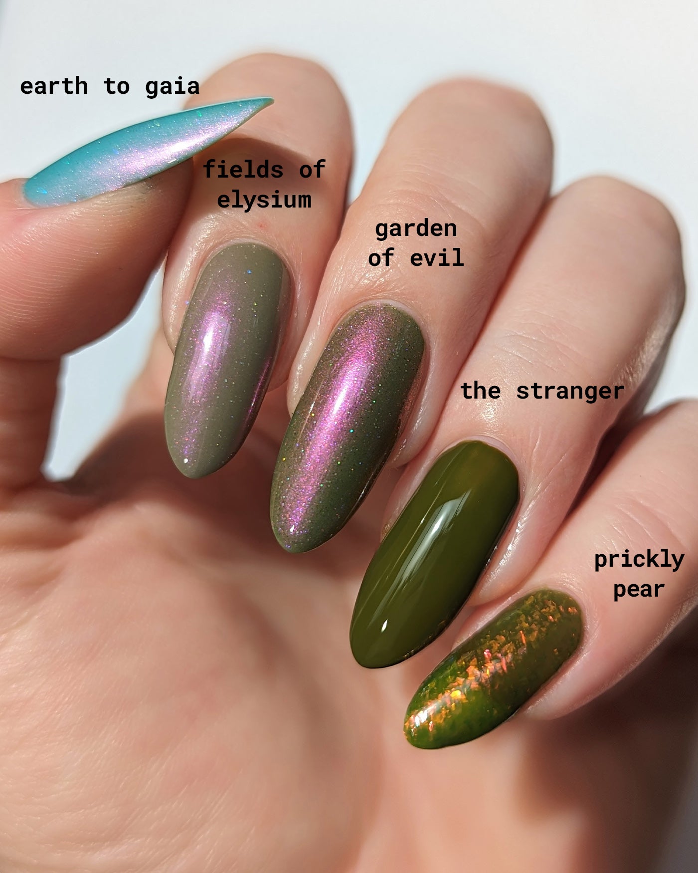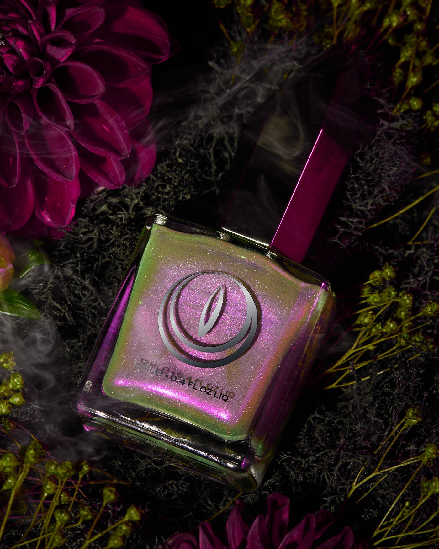 I purchased the entire Seasons collection and was blown away by this color. It is truly a mesmerizing color...be prepared to stare at your digits all day! Formula was smooth with an easy application. Two to three coats needed (depending if you are a shorty or have long nails). Green with purple and red shimmers. Just completely blown away by this color. If you want something unique and fun from this collection I highly recommend Garden of Evil.