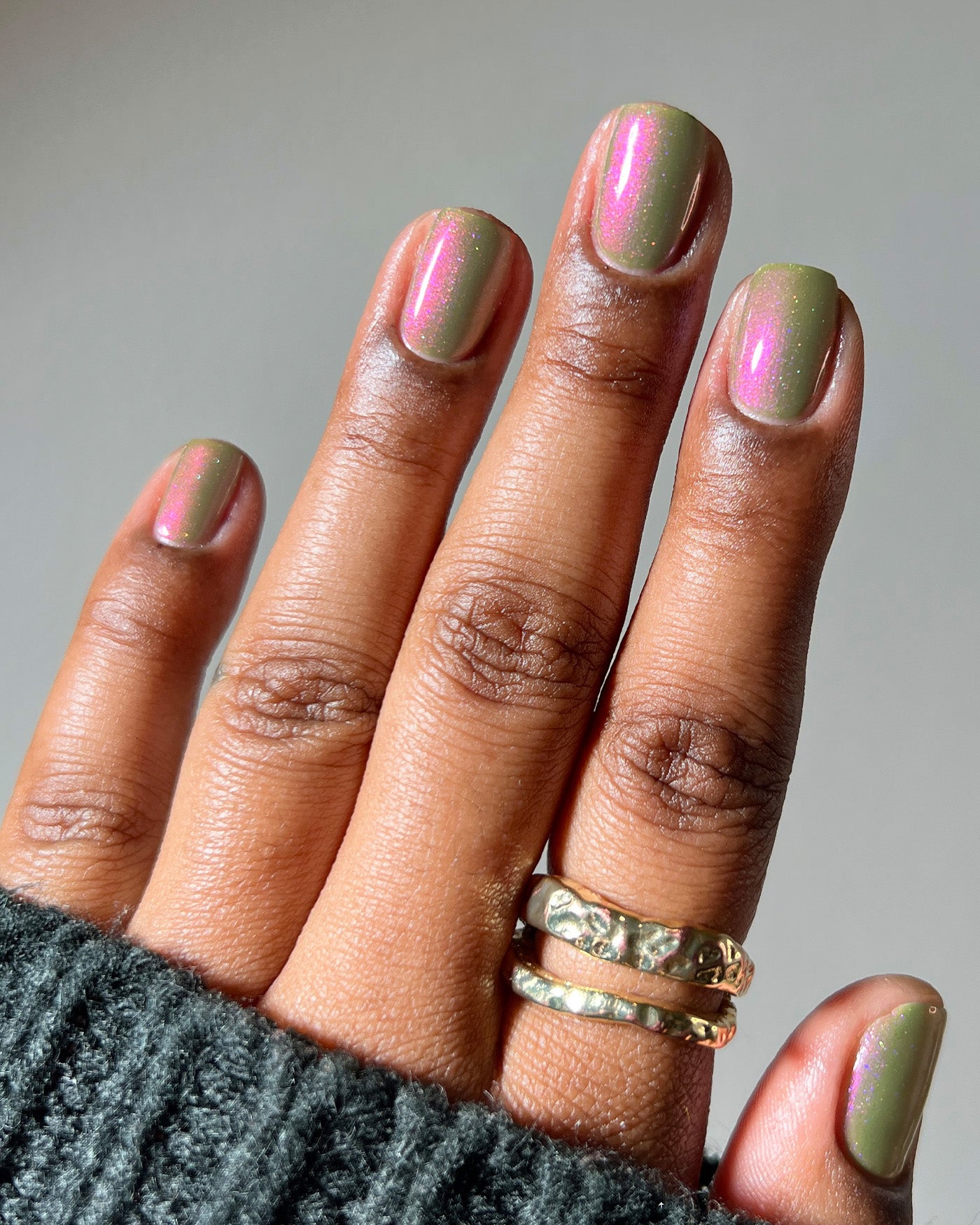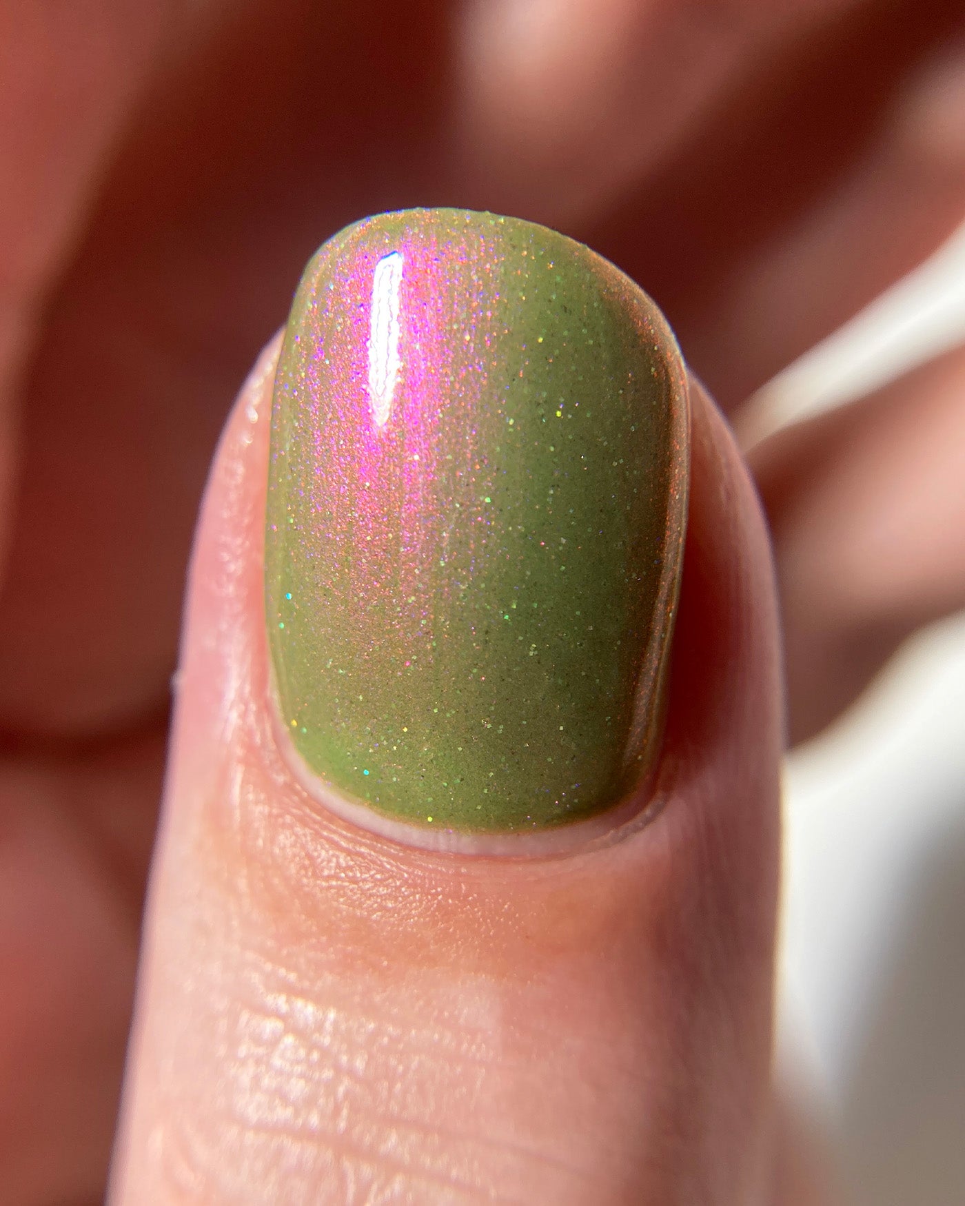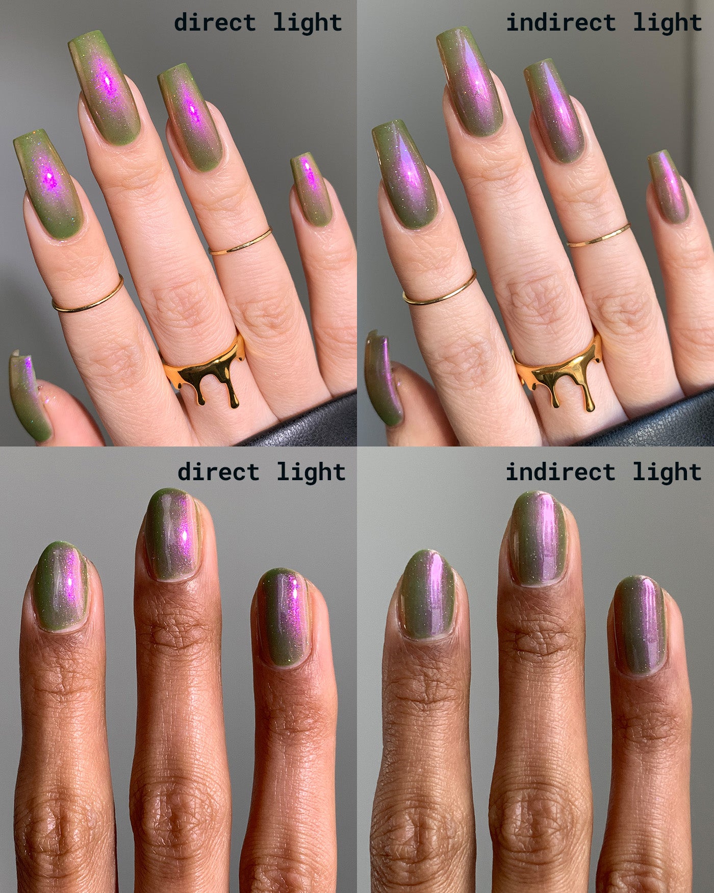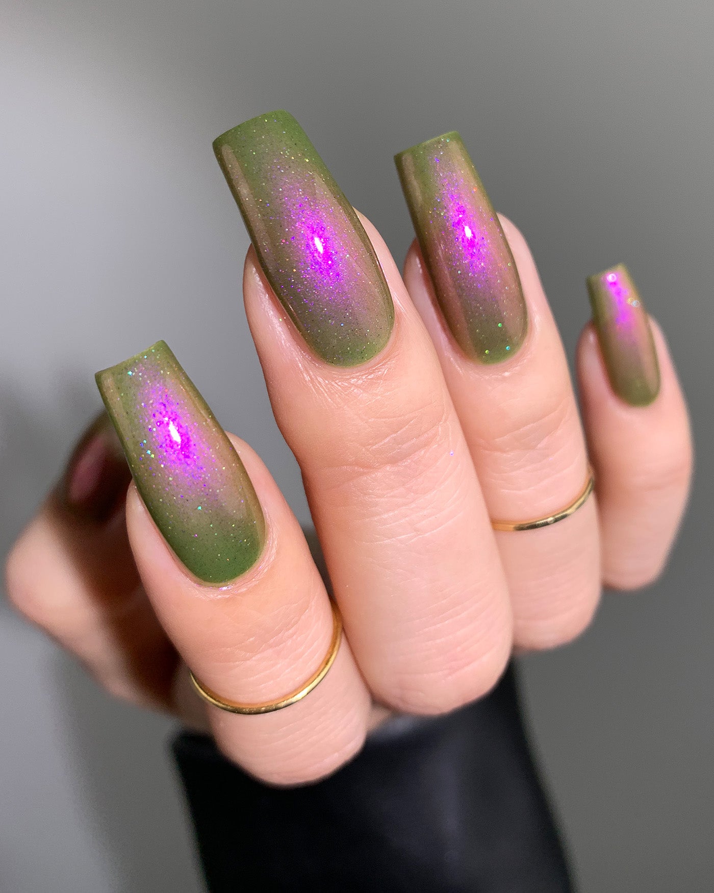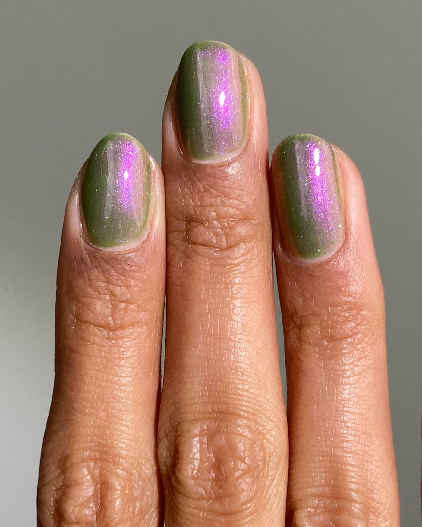 I think of this as a quintessential Mooncat lacquer: unexpected color combination and a beautiful mesmerizing effect! What a gorgeous addition for our collections!! Love the purple shimmer and fresh green color.