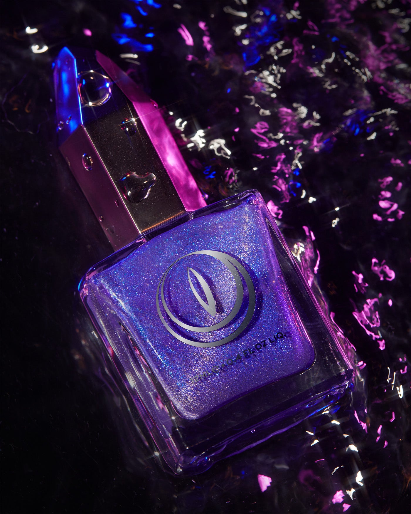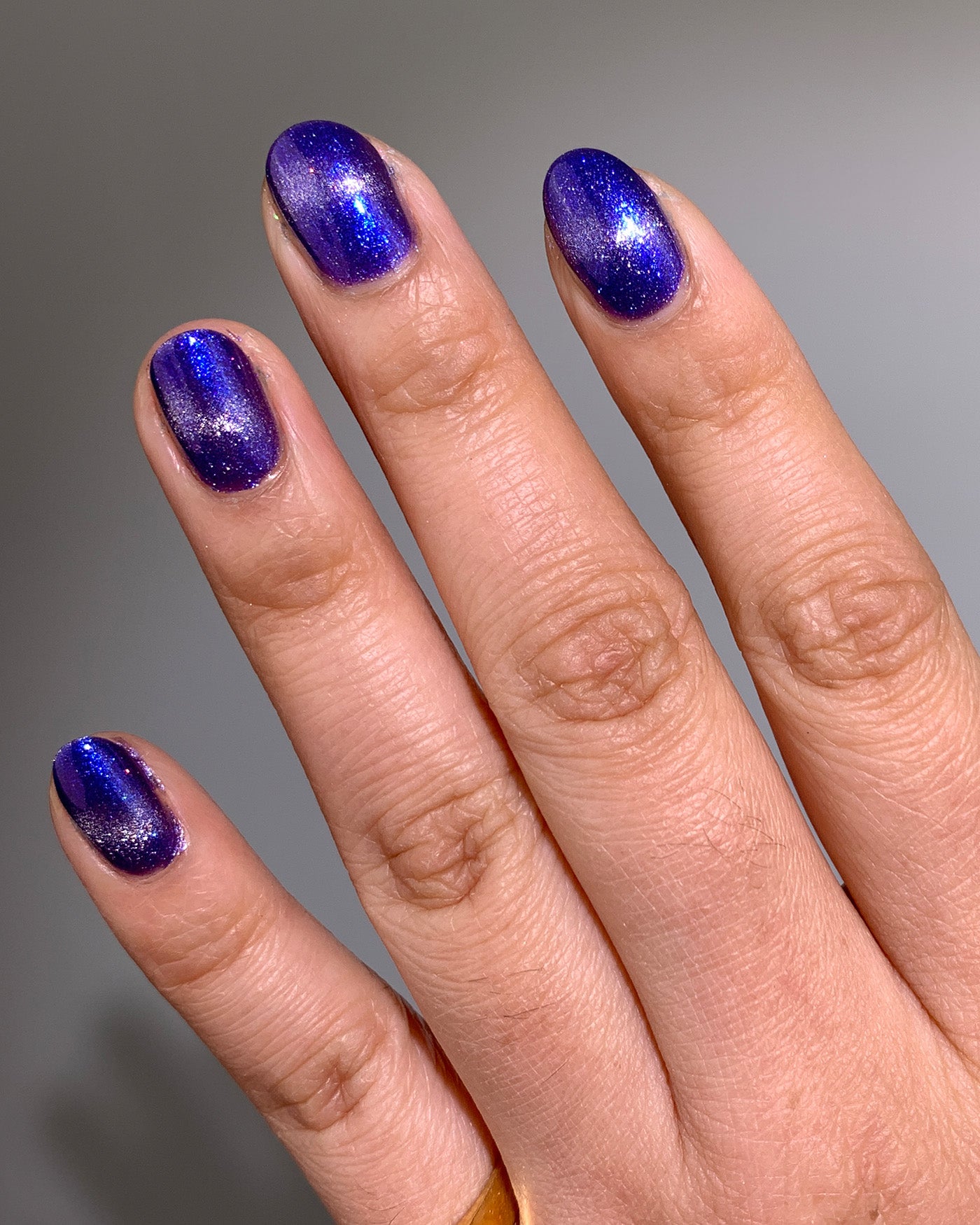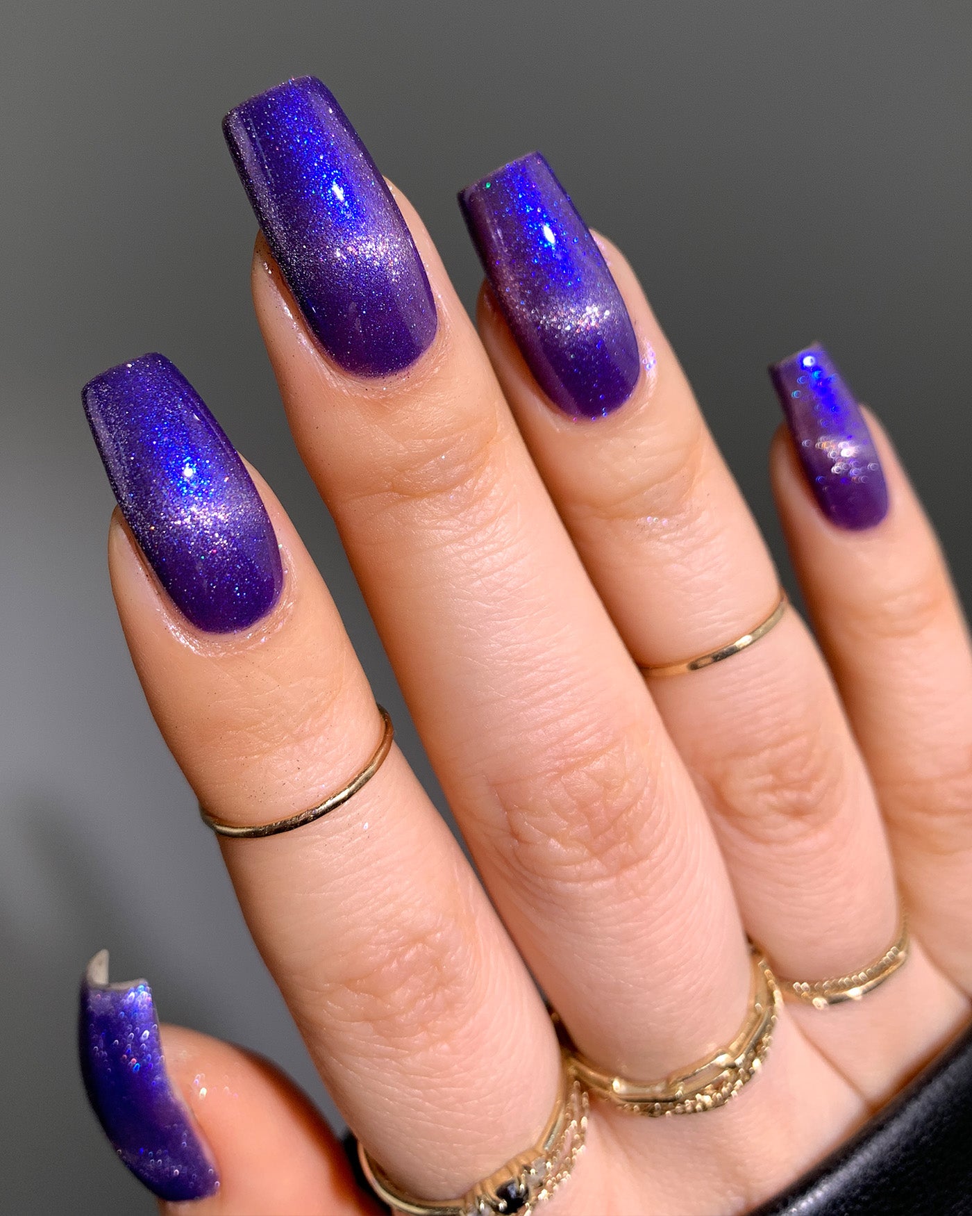 GHOST SHIP is a royal purple magnetic lacquer filled with blue shimmer and micro holographic glitter that reveals a bright silver magnetic stripe. from the SONGS OF SIRENS SET.