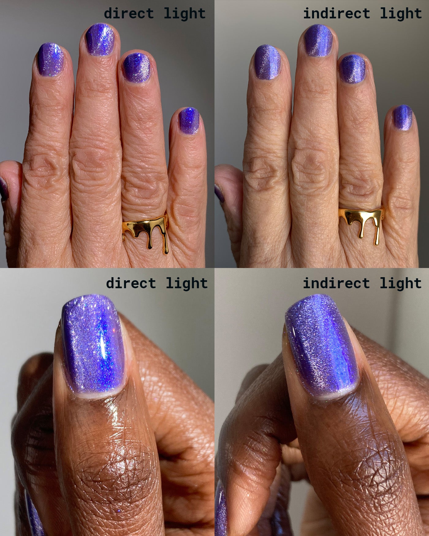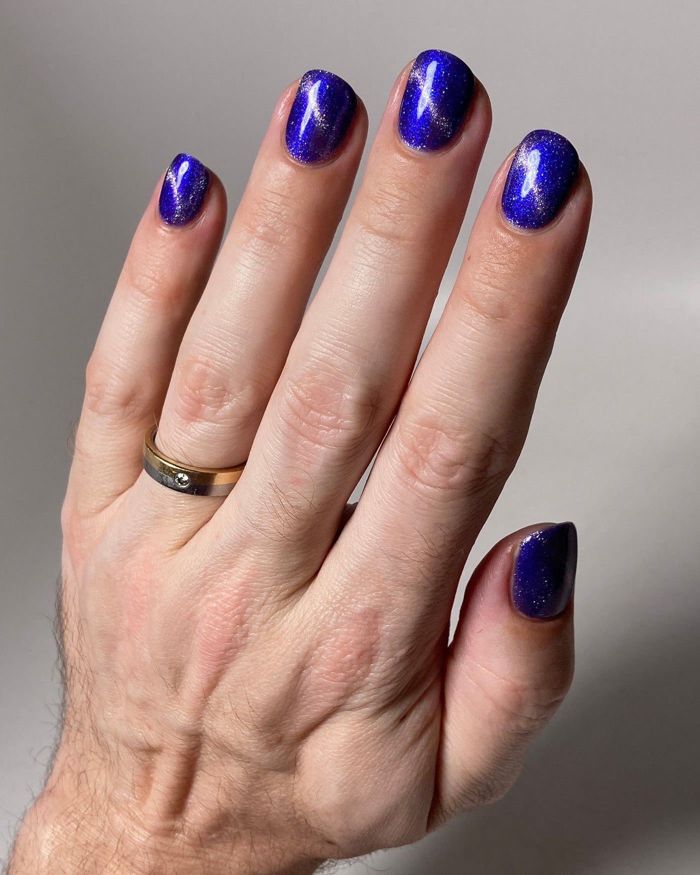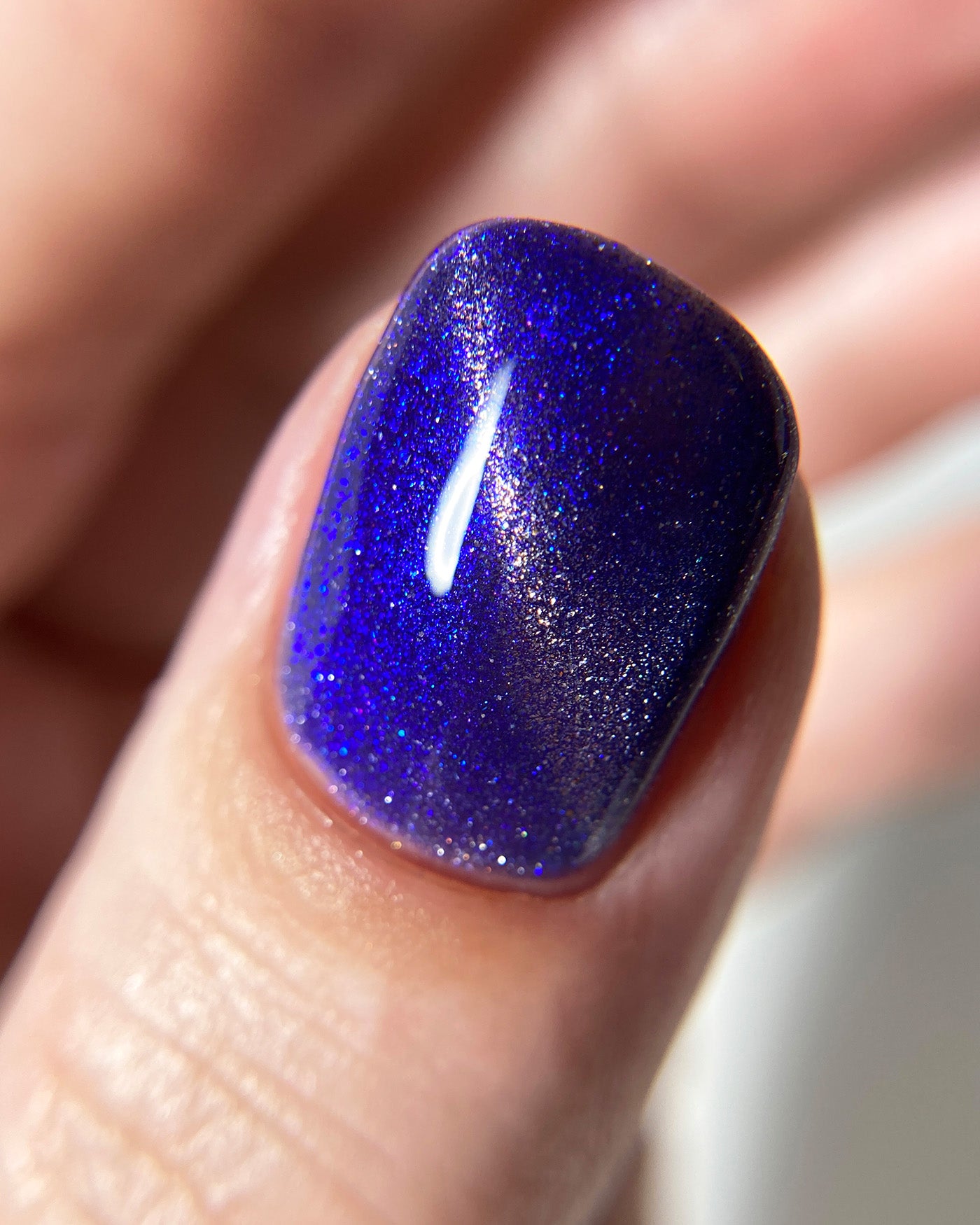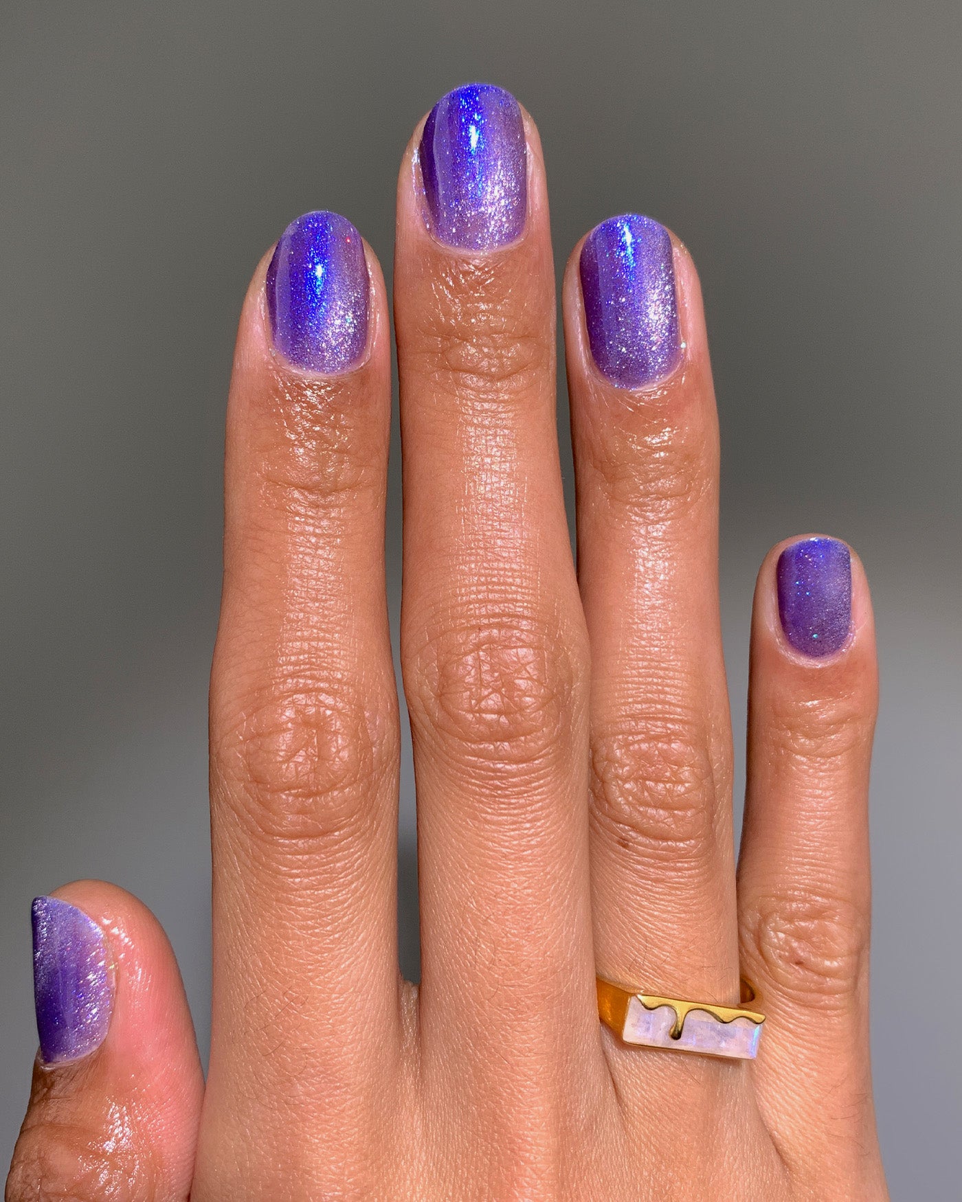 GHOST SHIP is a royal purple magnetic lacquer filled with blue shimmer and micro holographic glitter that reveals a bright silver magnetic stripe. from the SONGS OF SIRENS SET.