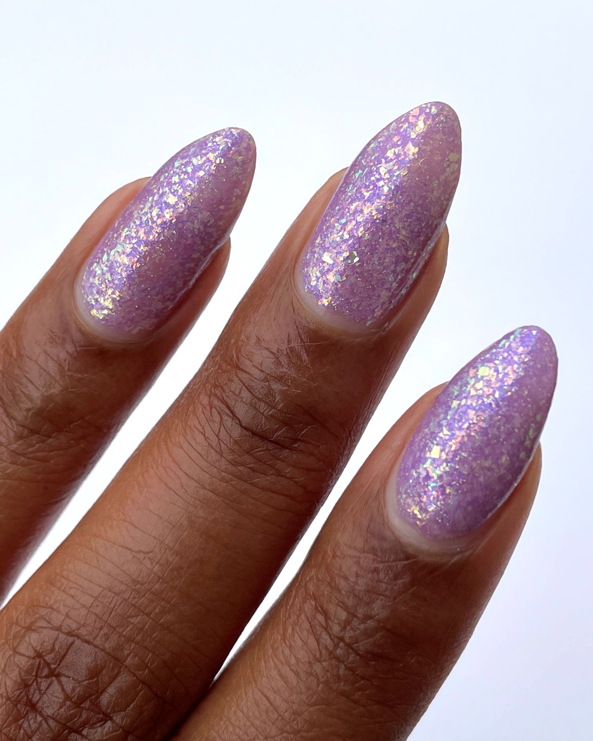 I dont have any polish like this and I own hundreds of polishes.. this is just so unique and a staple in this collection. Its a light lavender base color loaded with unicorn skin flakes that shift from gold to green to pink, along with a duochrome shimmer in the base and subtle holographic flecks. Such a beautiful shade, one of my new absolute favorite polishes. In different lighting this changes to different colors and its so mesmerizing!