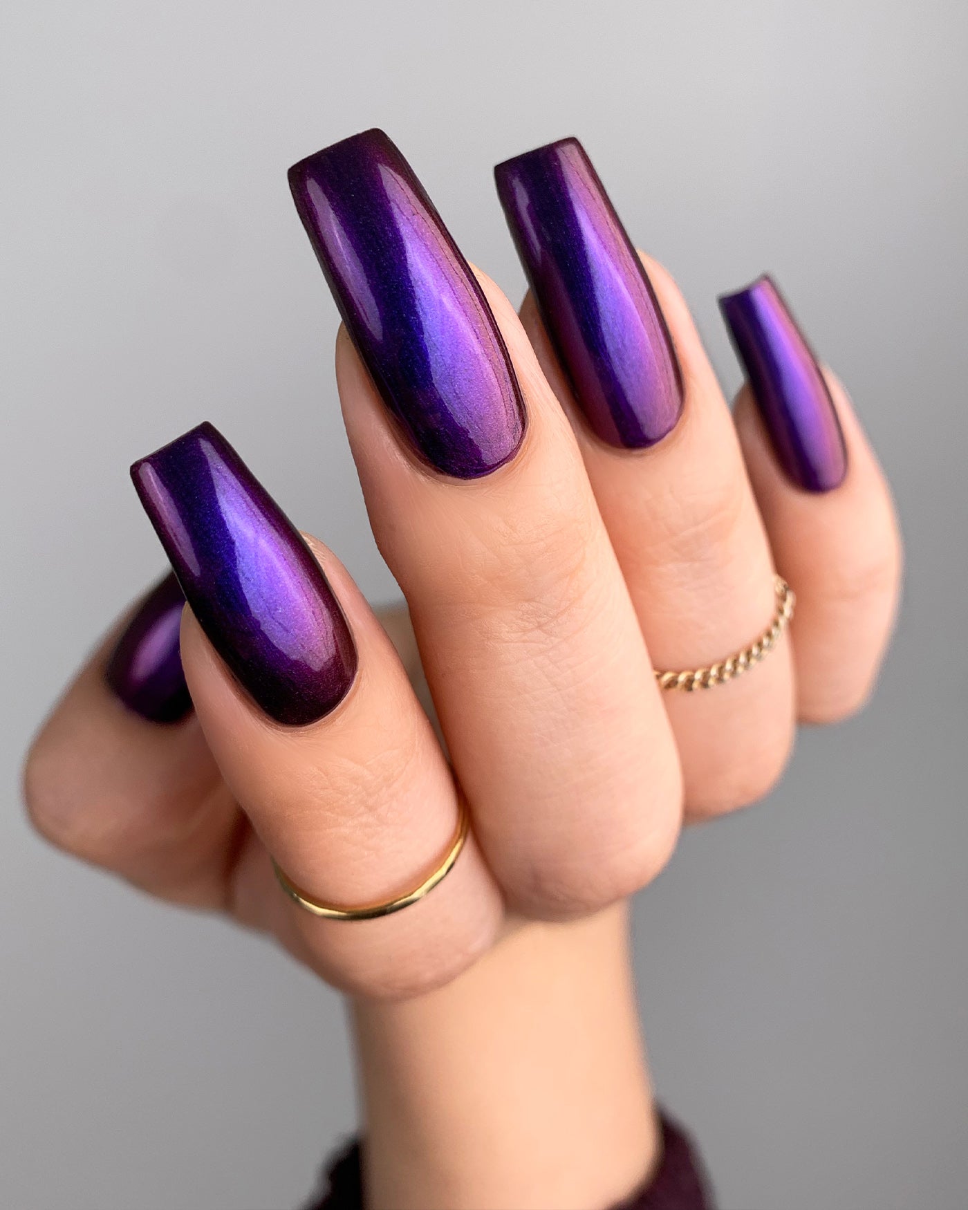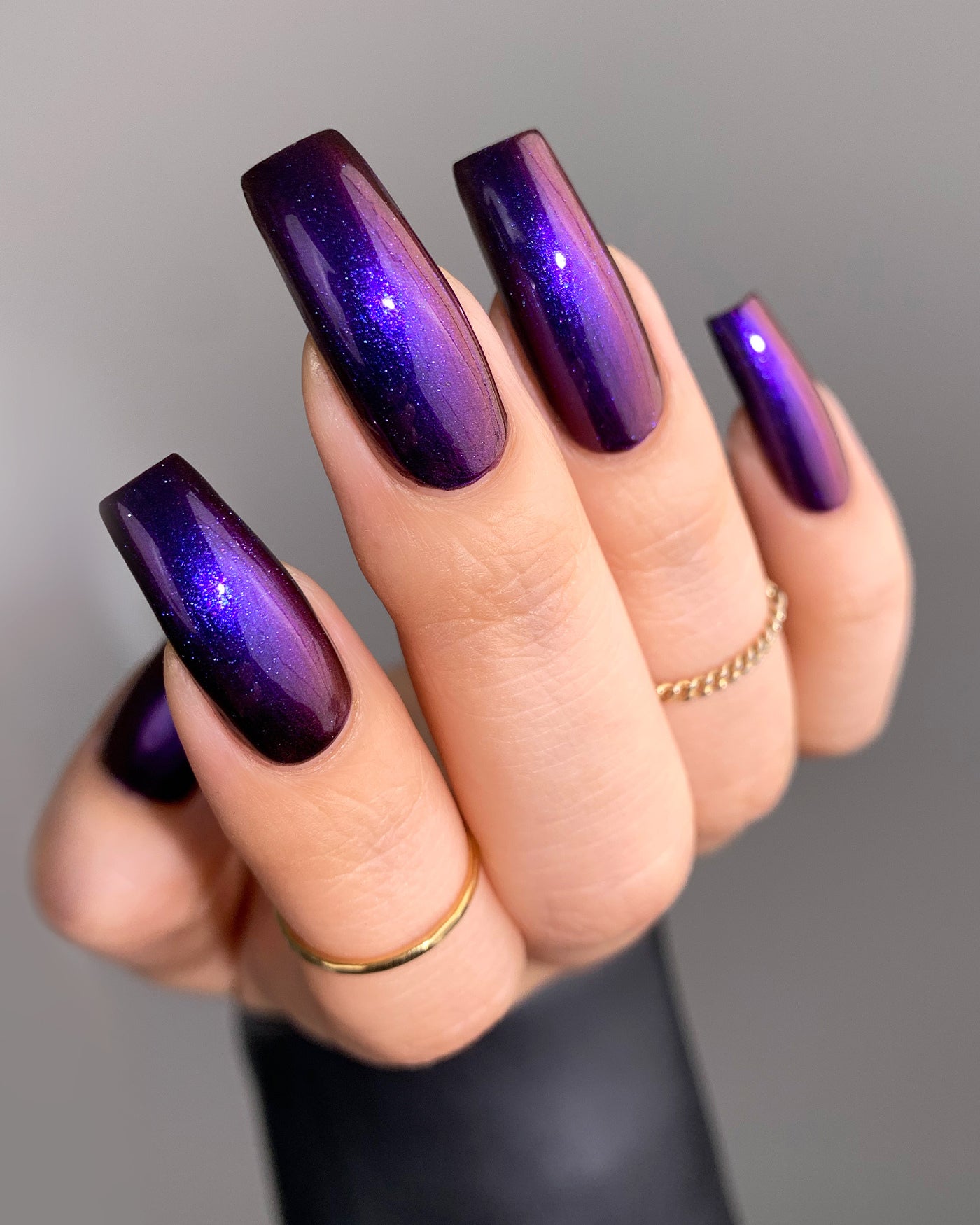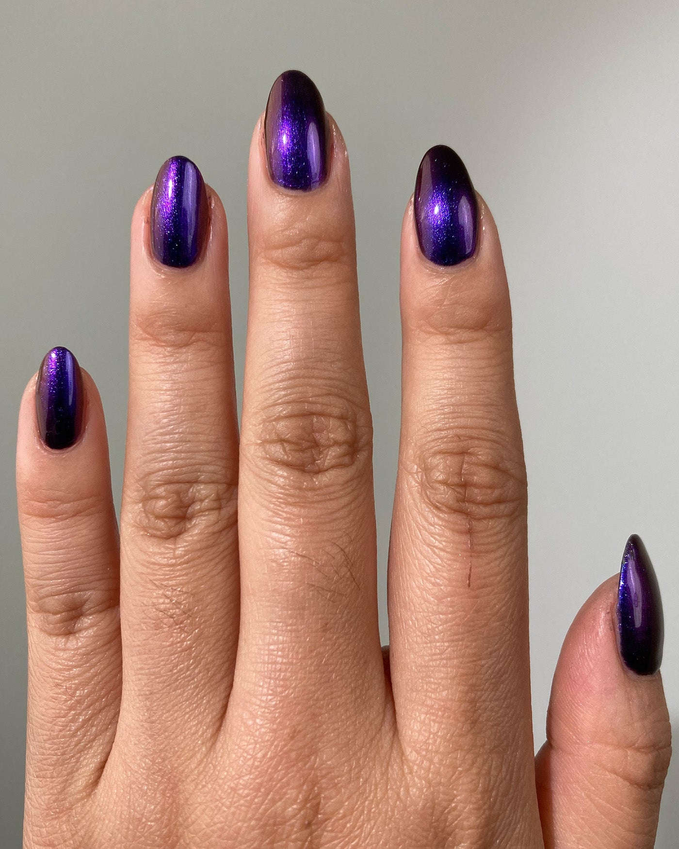 MORTALS BE WARNED is a multichrome lacquer that shifts between shades of indigo and berry as it’s viewed from different angles.
