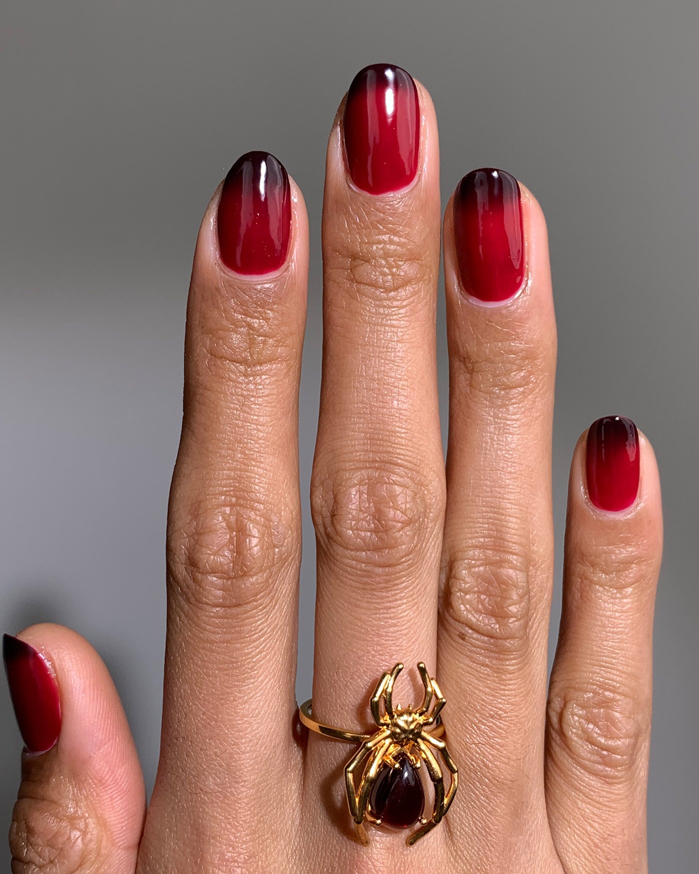 QUEEN OF THE DEAD is a dark red thermal lacquer that transitions from a shade of deep wine red when cold to a shade of raspberry red when warm. from the SEASONS OF PERSEPHONE SET.