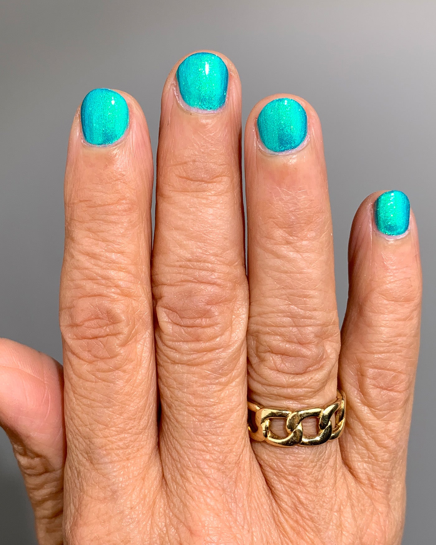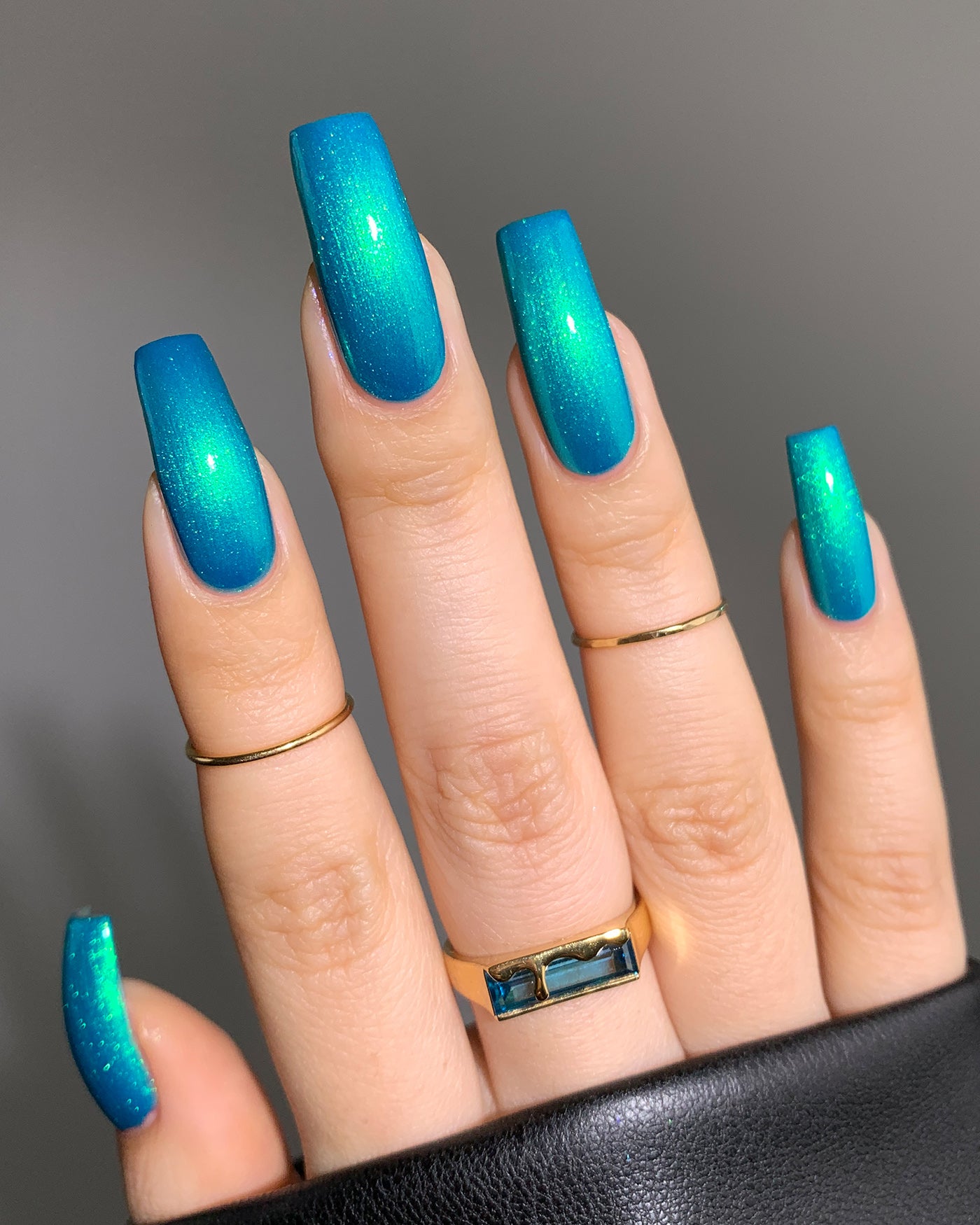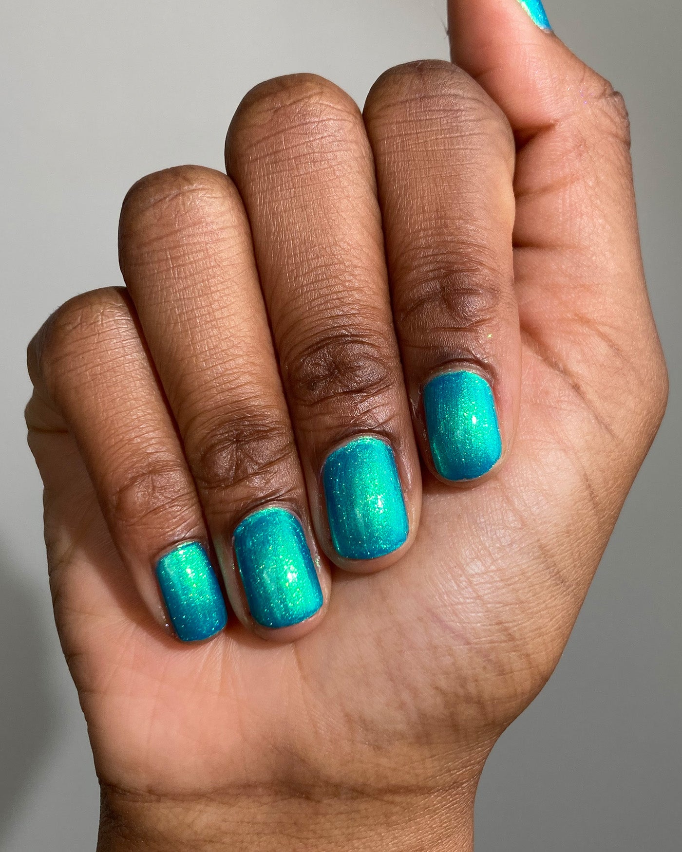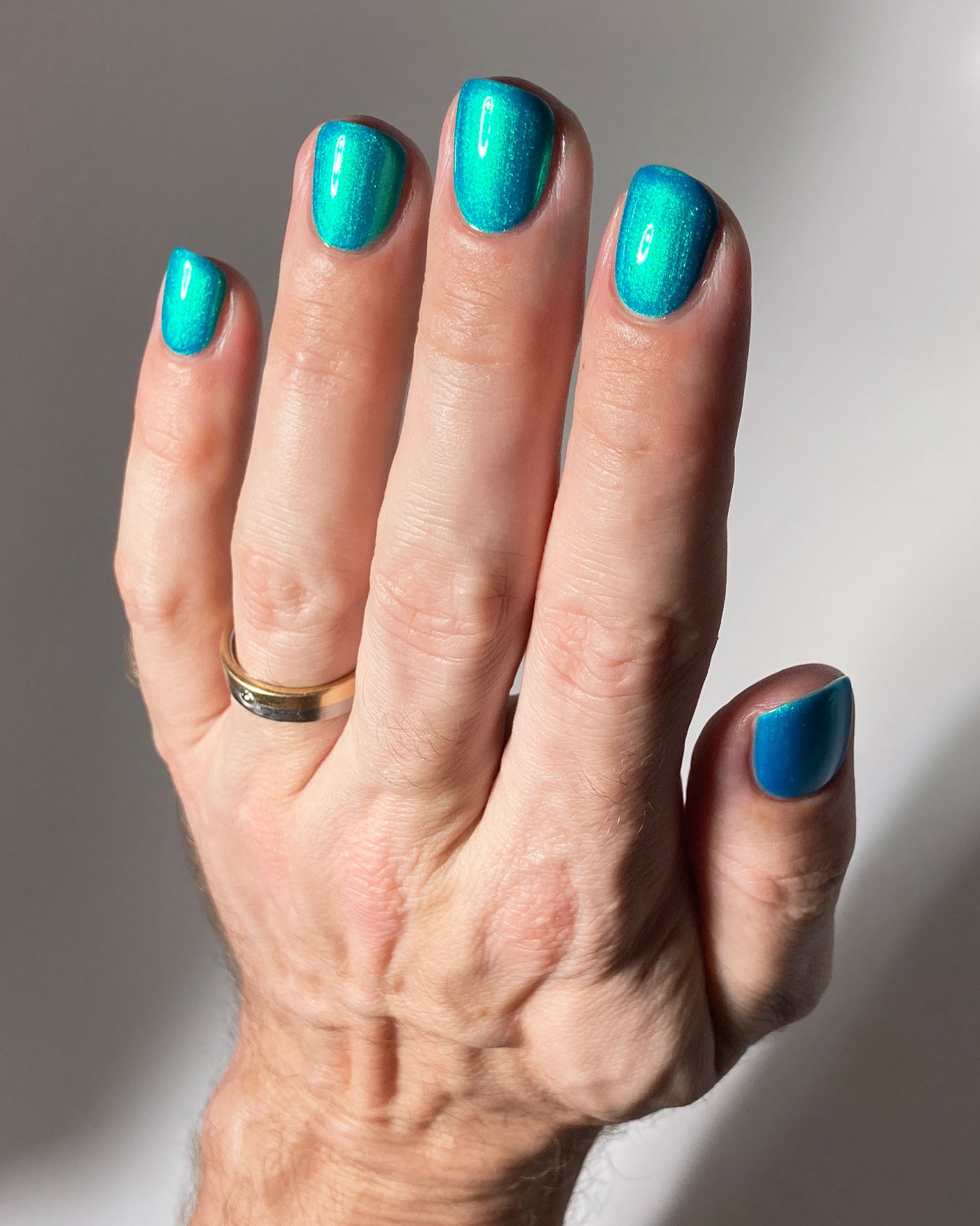 If you're looking for a bright Teal color, this is definitely it. The formula is super smooth and the color leans much more teal in person with hints of a green shimmer at more extreme angles.