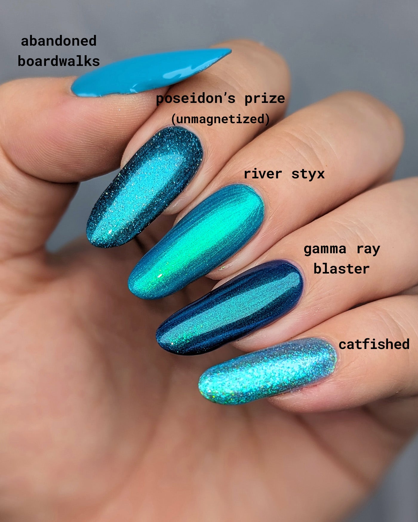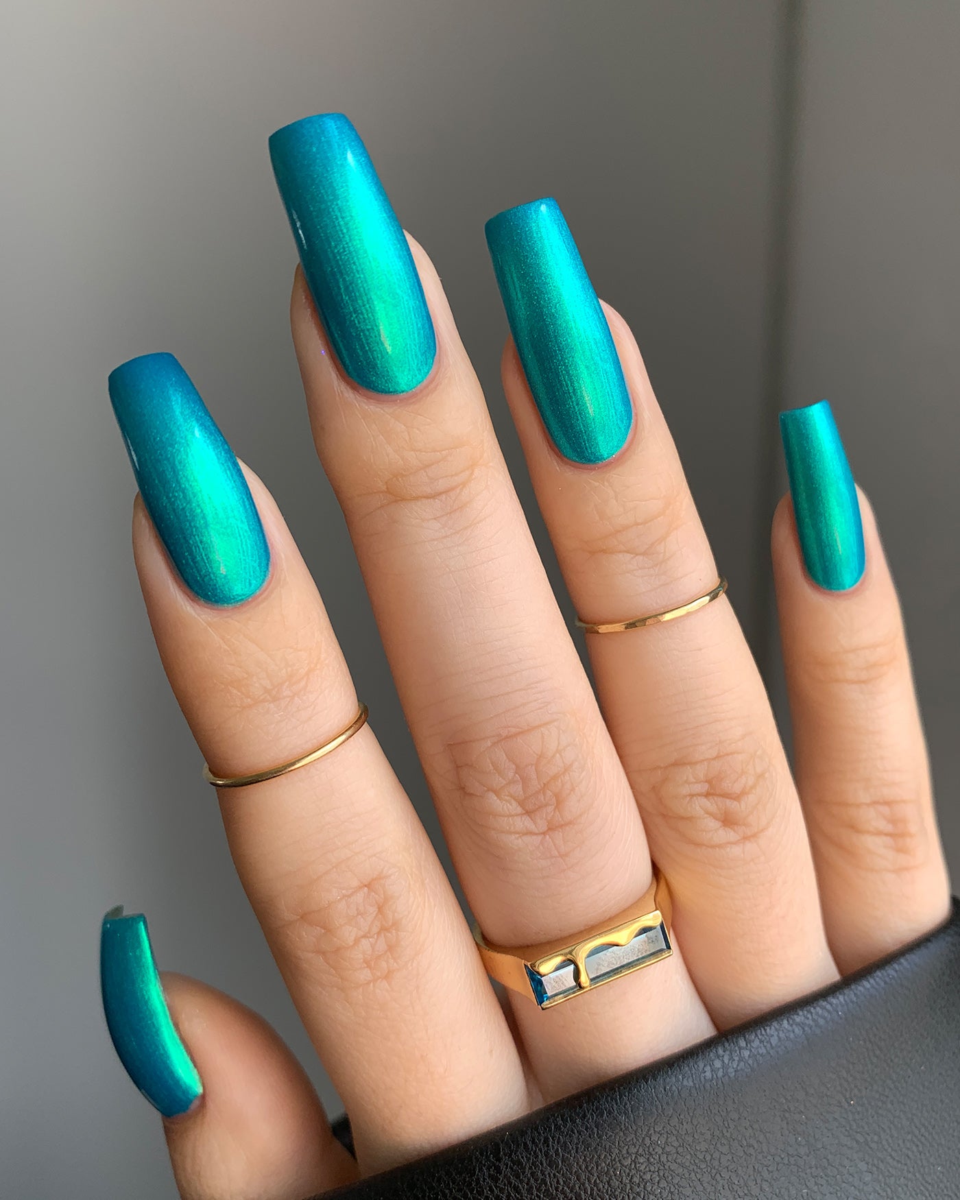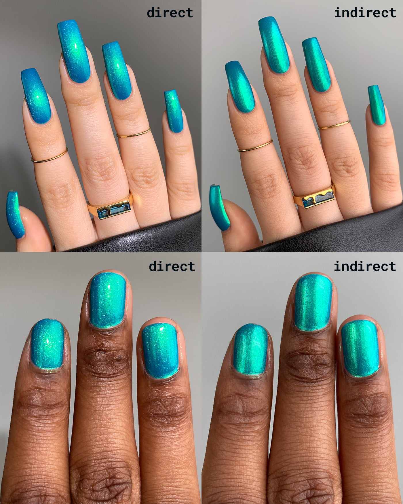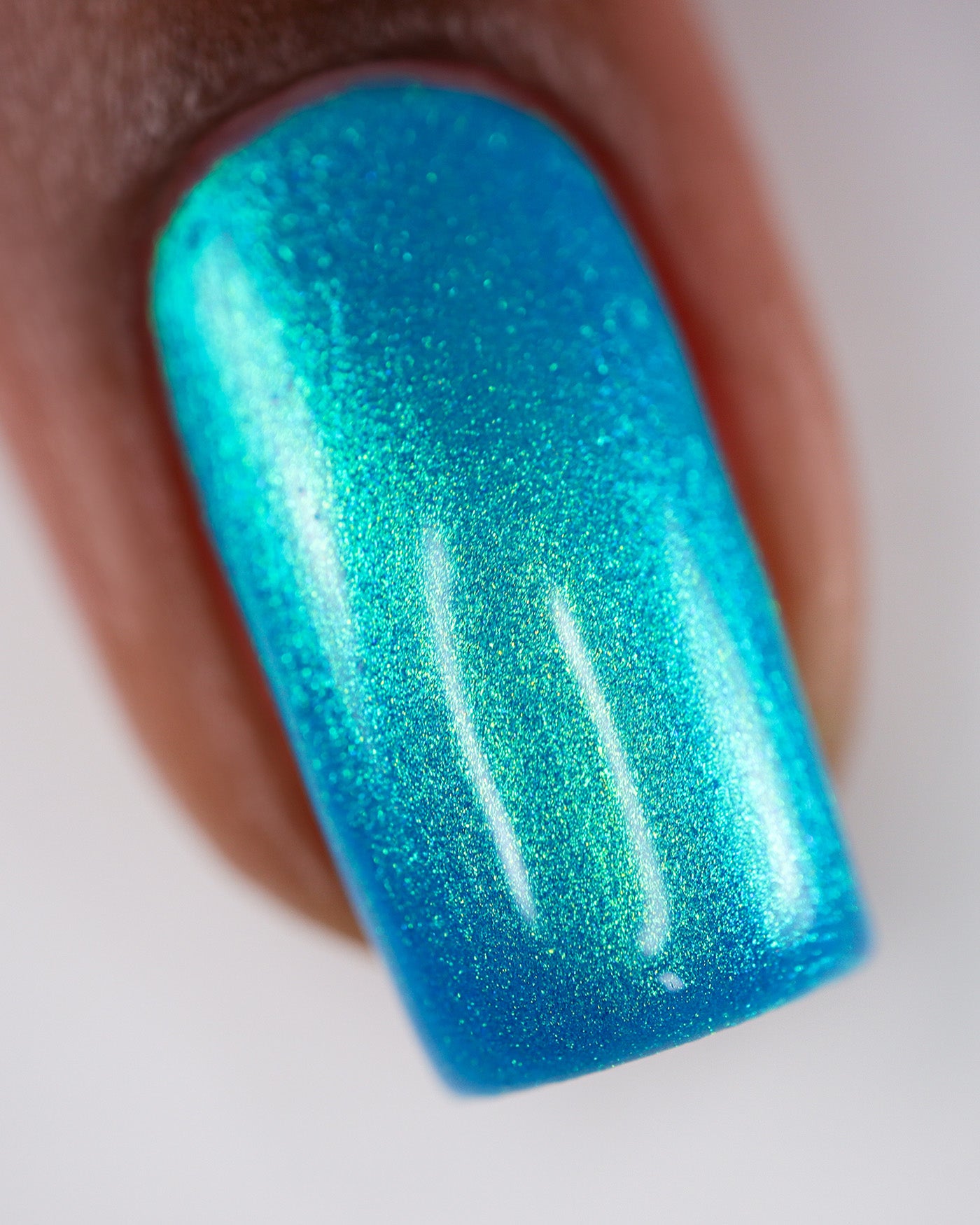If you're looking for a bright Teal color, this is definitely it. The formula is super smooth and the color leans much more teal in person with hints of a green shimmer at more extreme angles.