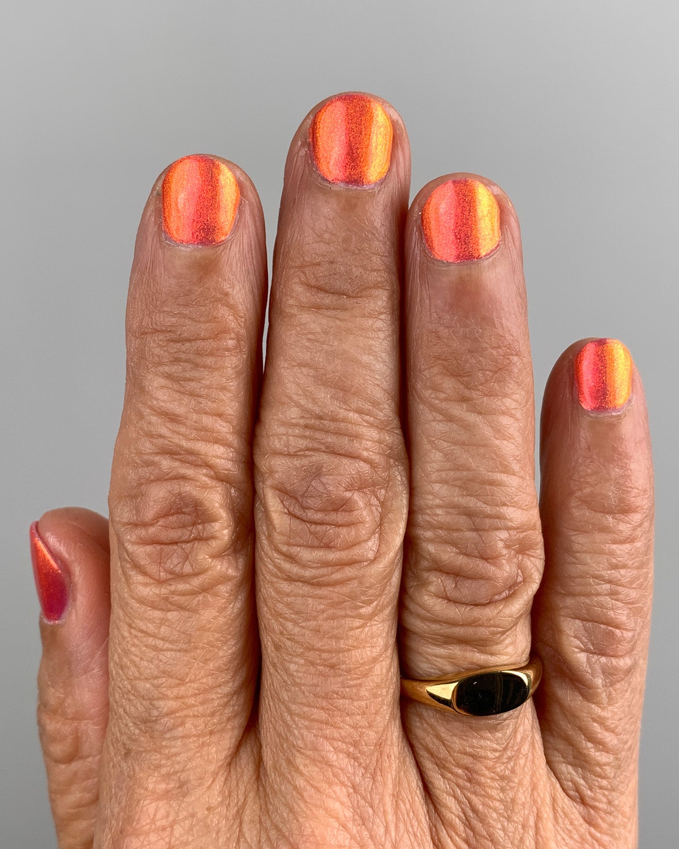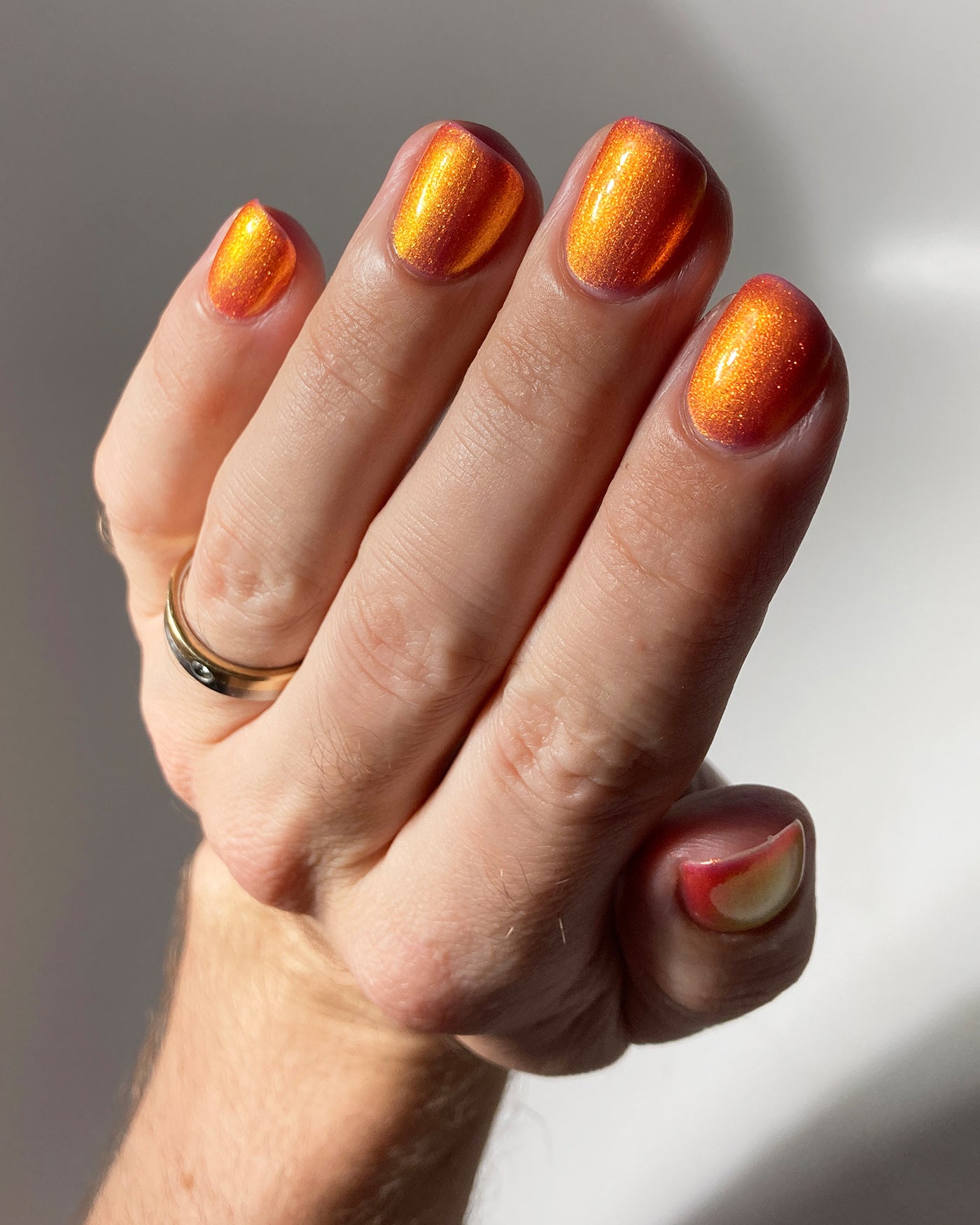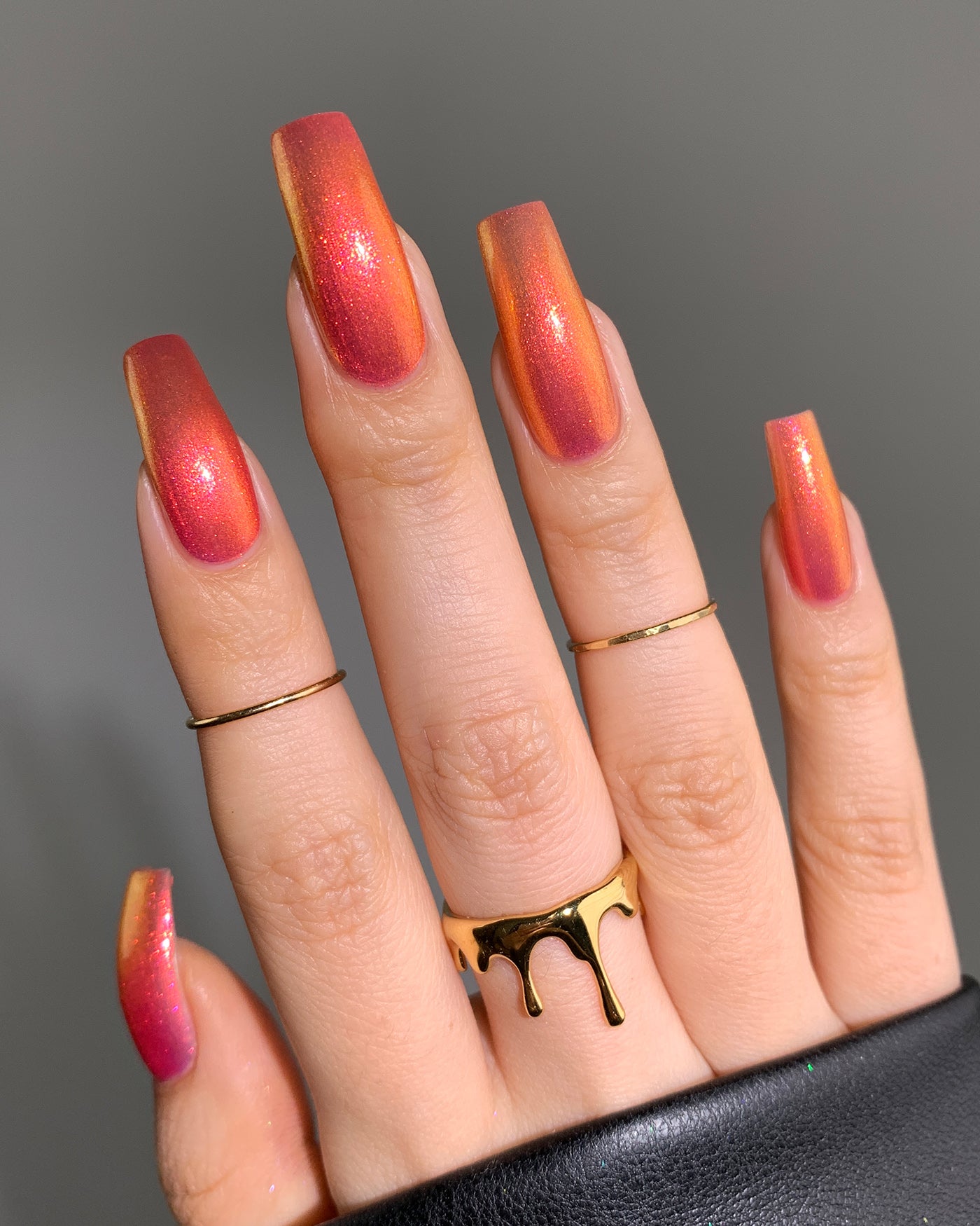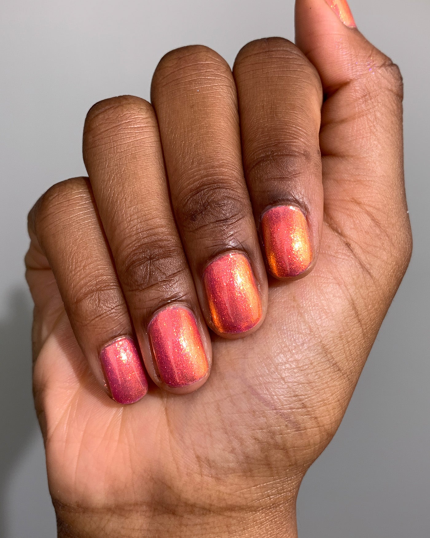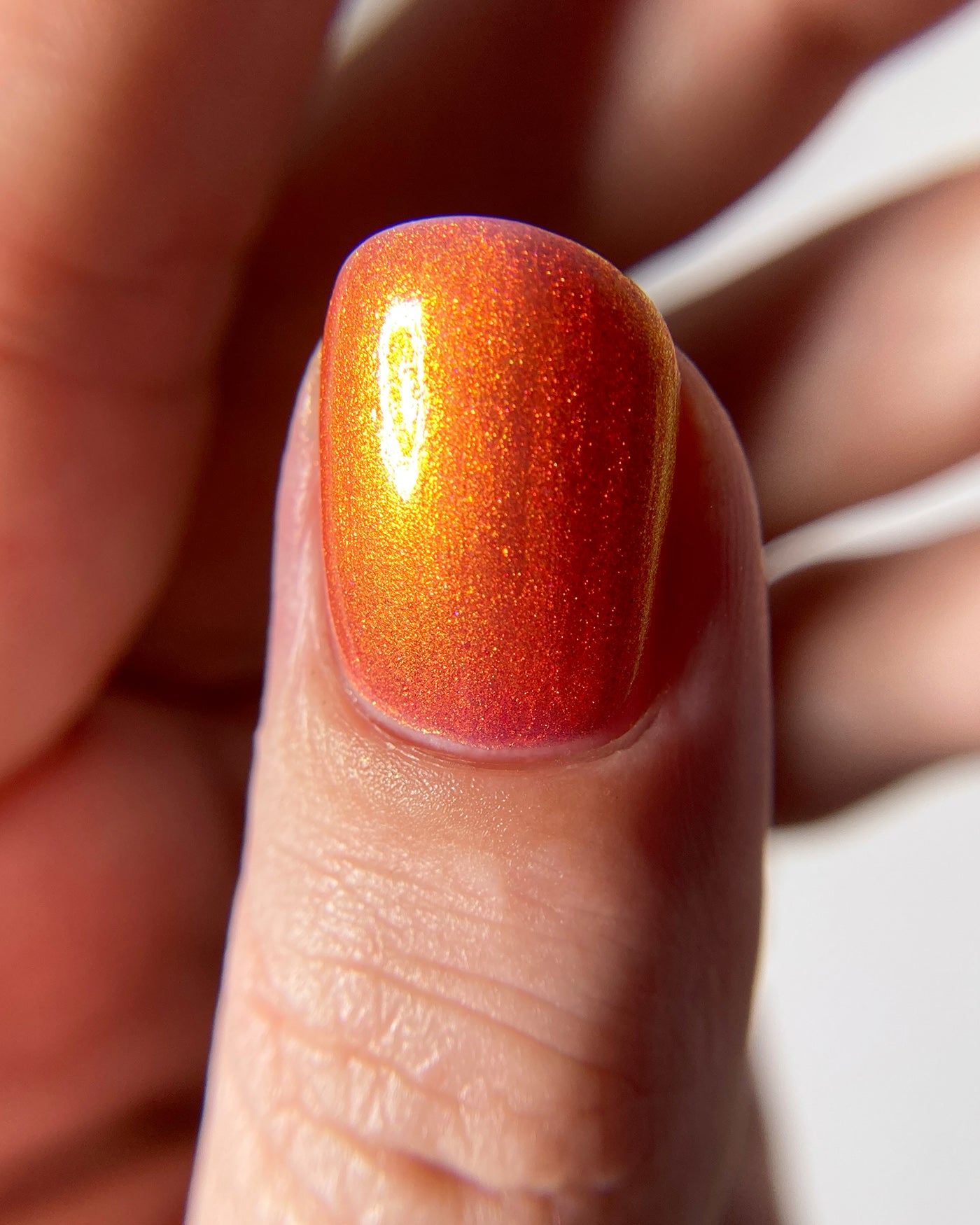 STOLEN AMBROSIA is a coral lacquer filled with orange and yellow shimmer. from the UNDERWORLD SET.