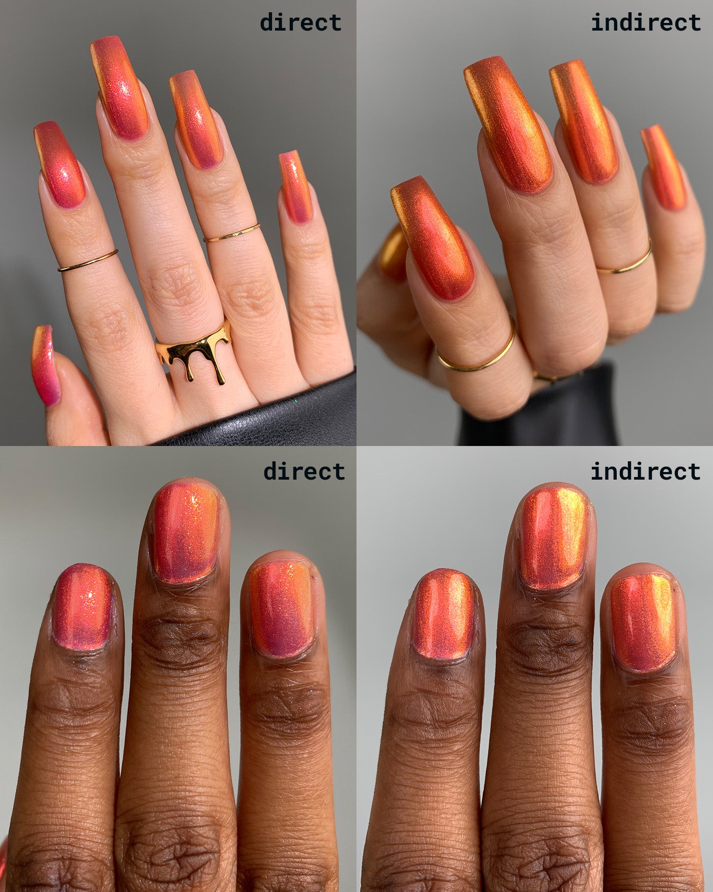 dabble in the sinful and anoint your mortal claws with this luxe coral meld of gilded orange and shimmering yellow specks - surreptitiously plucked from the dishes of olympus’s finest and bottled in this truly indulgent concoction. tantalus would most definitely approve.