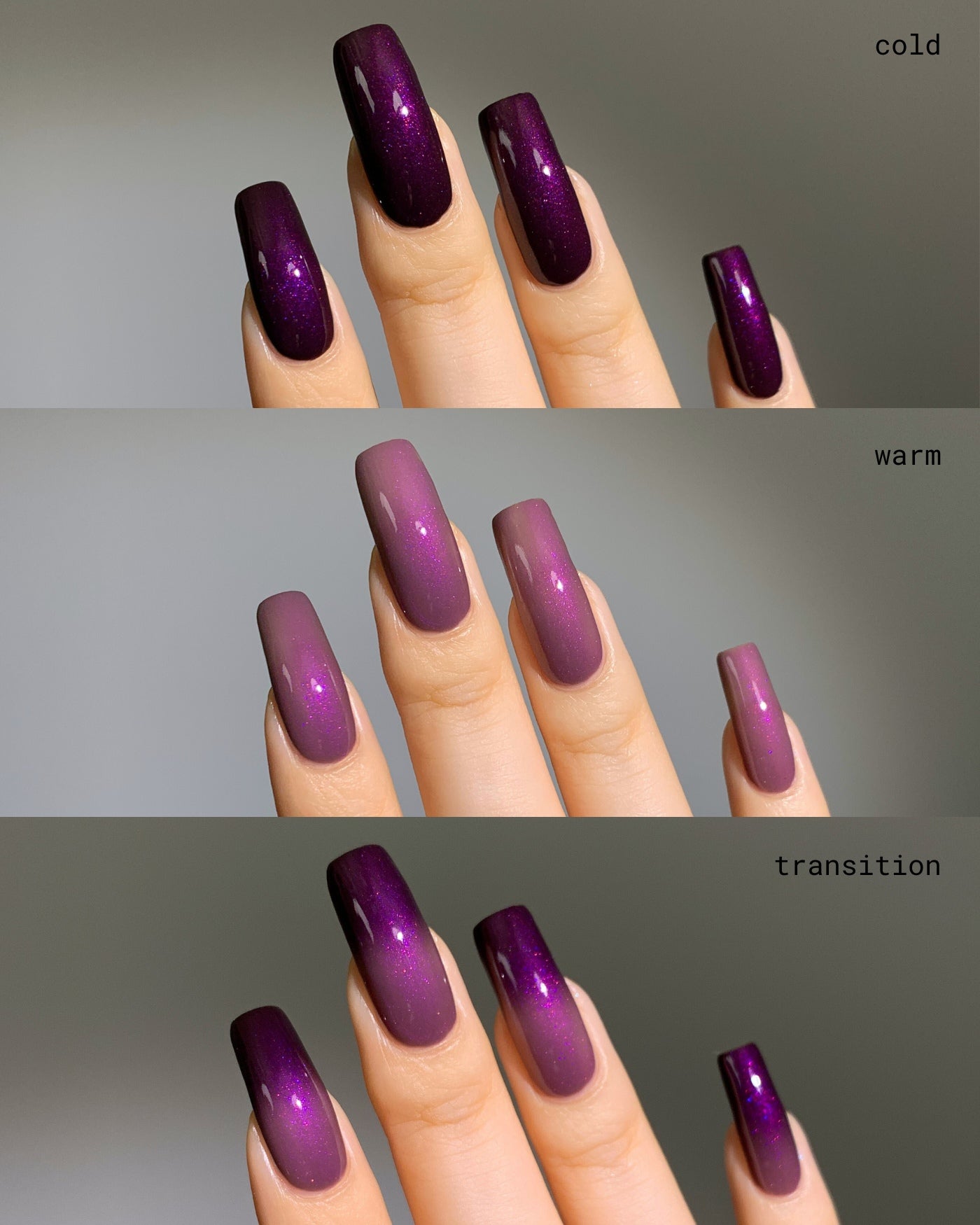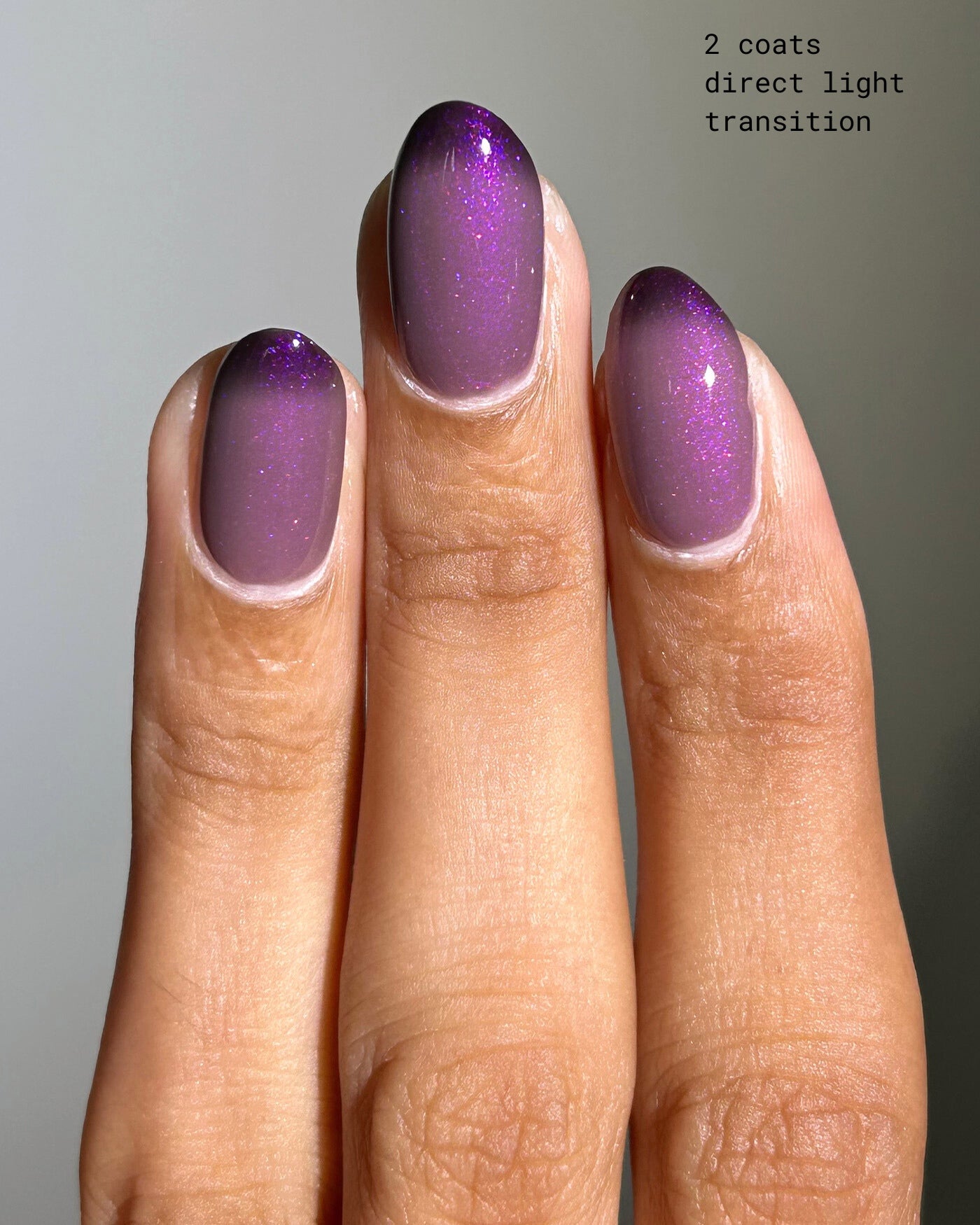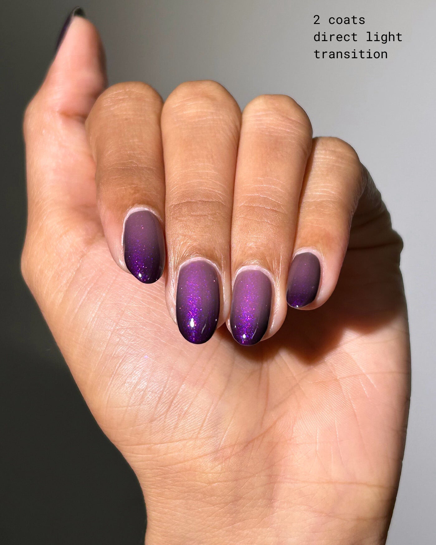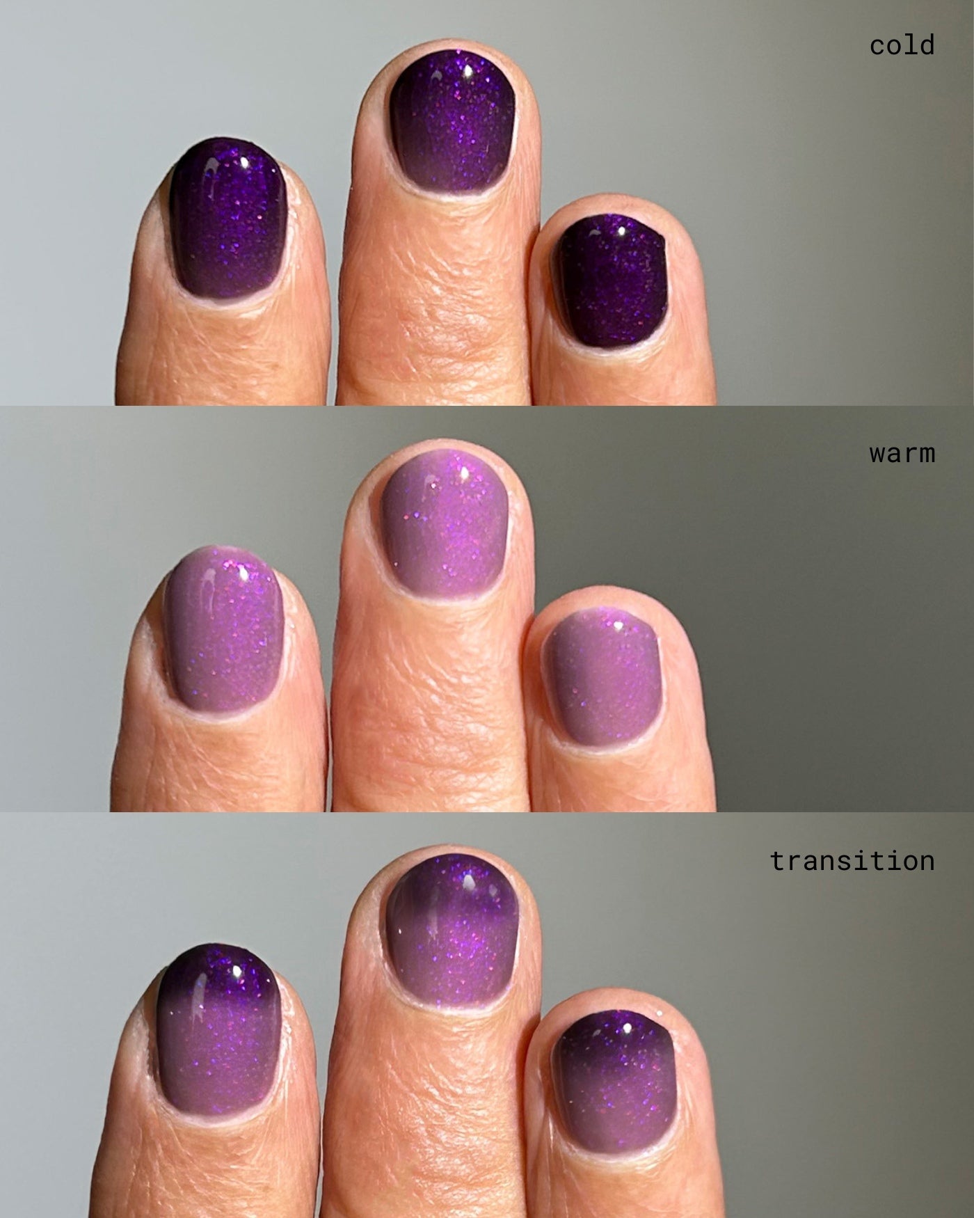 THE DOPPELGANGER is a dark purple to mauve thermal lacquer filled with pink-purple shimmer that transitions from a shade of dark purple when cold to mauve when warm. from the DANSE MACABRE SET.