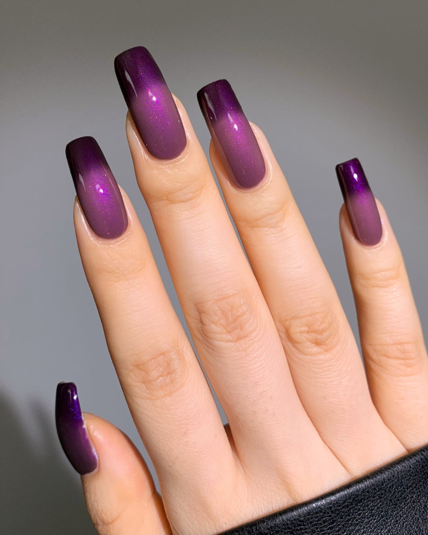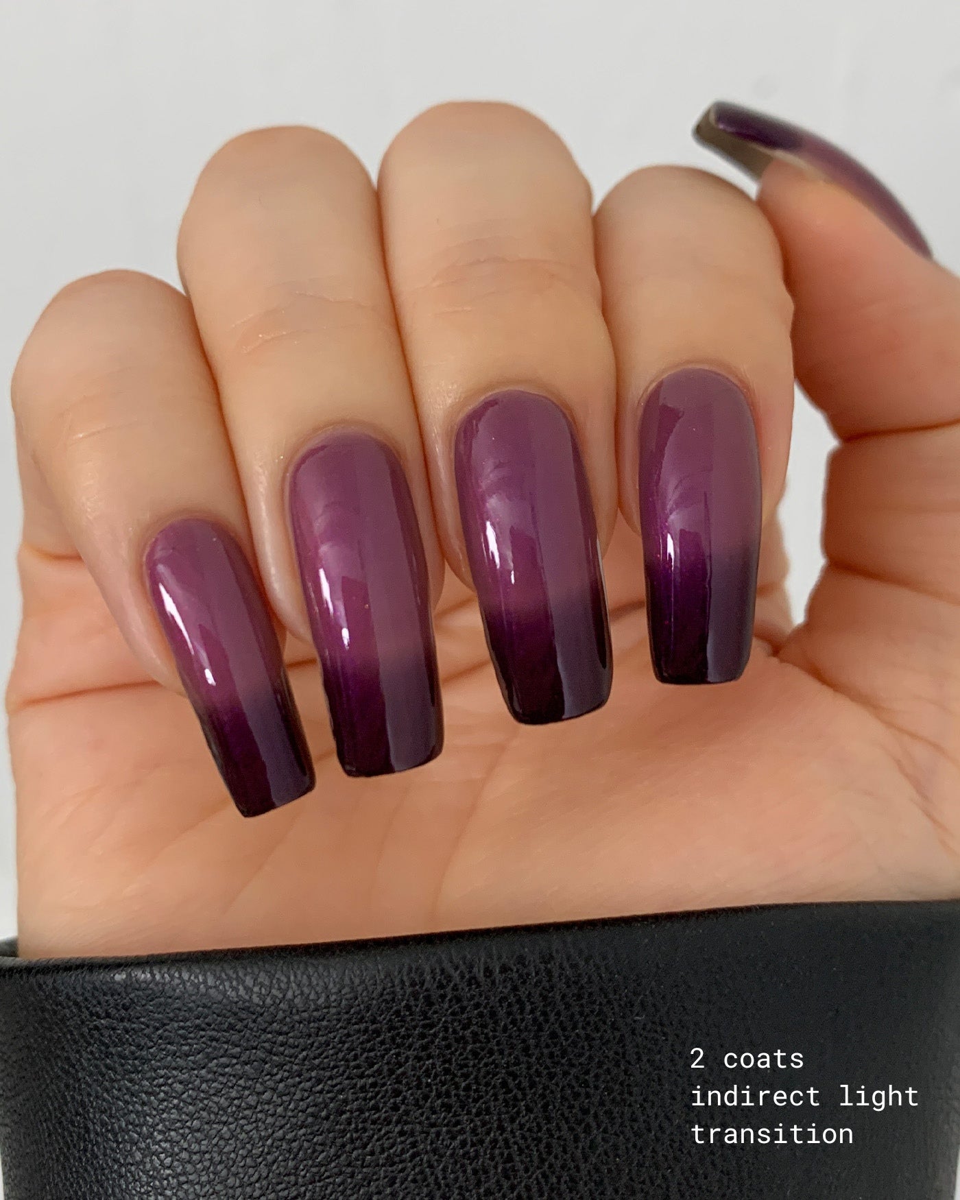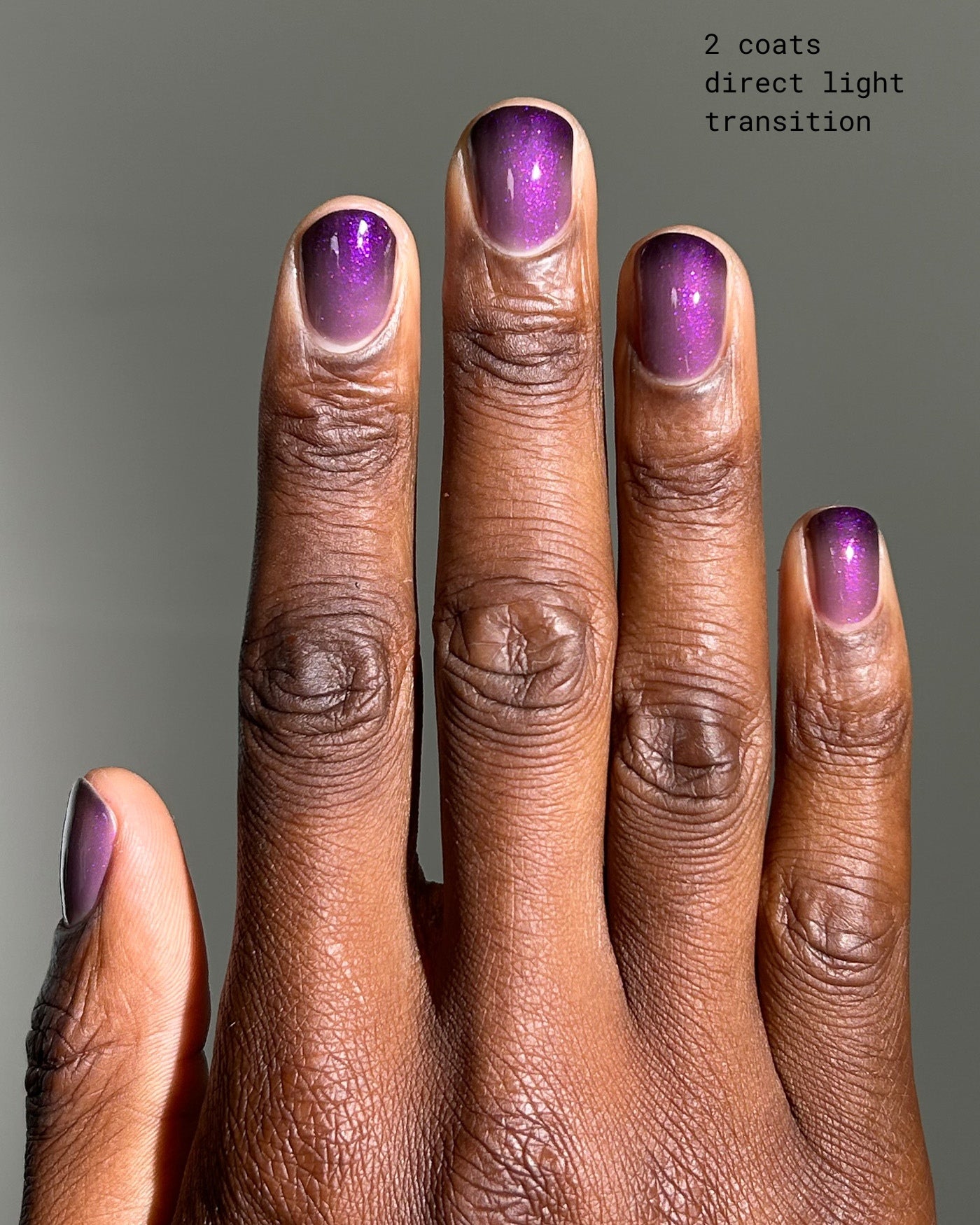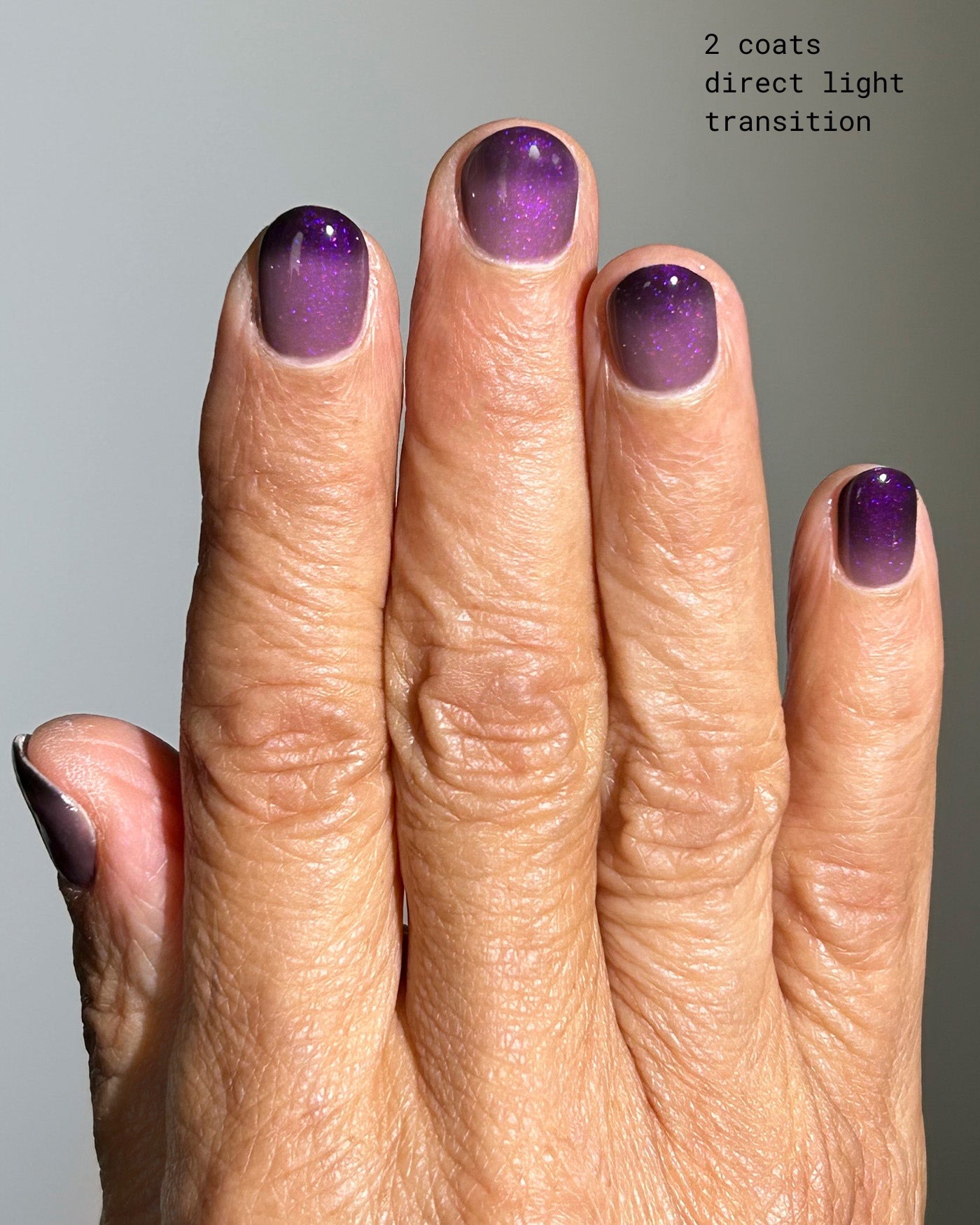 THE DOPPELGANGER is a dark purple to mauve thermal lacquer filled with pink-purple shimmer that transitions from a shade of dark purple when cold to mauve when warm. from the DANSE MACABRE SET.