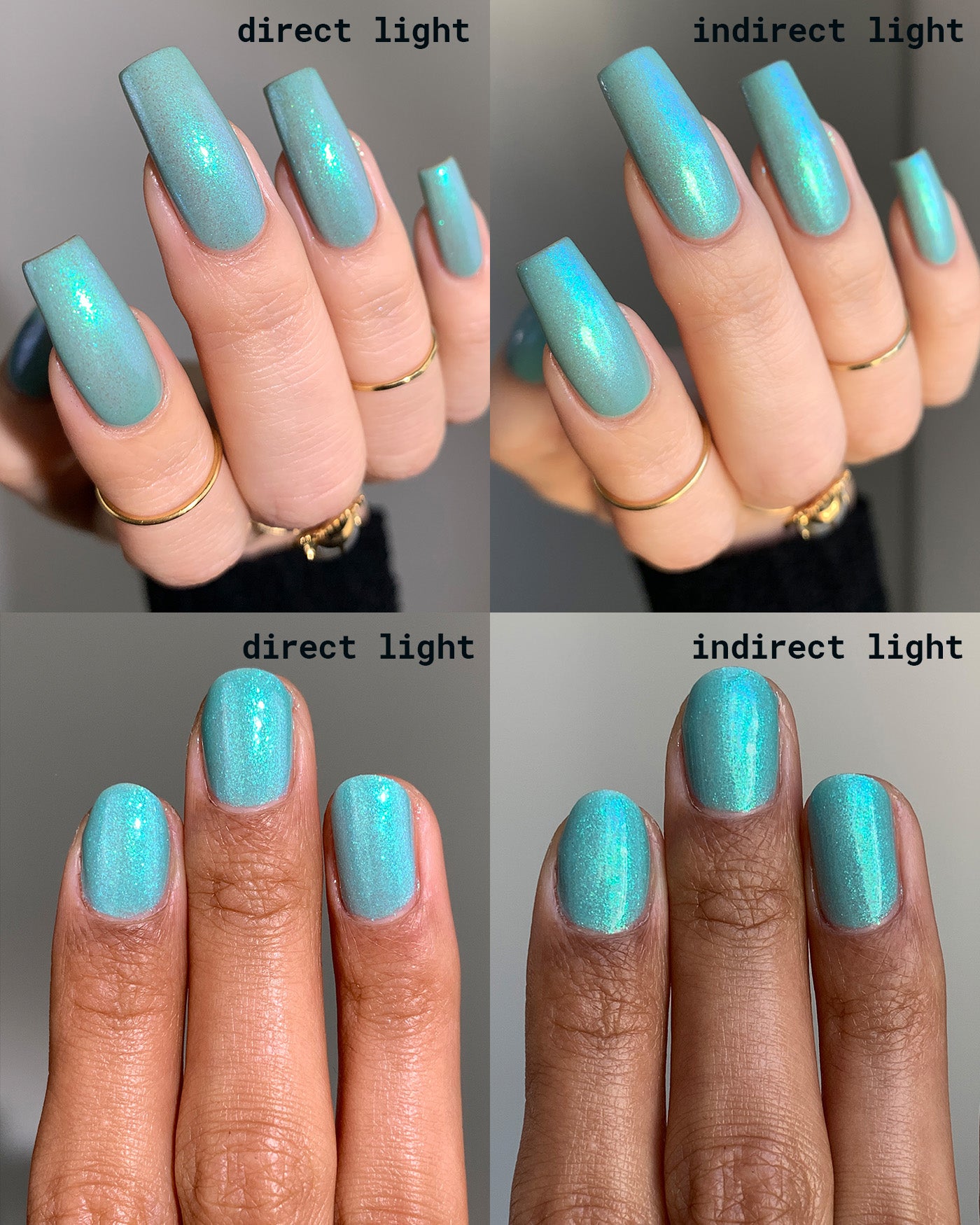 send your claws into a tailspin. surging through its seemingly serene seafoam surface, like an invasive bloom of kelp or a cascade of encroaching seaweed, this minty brew is quickly overcome with a deceptively potent punch of blue-green shimmer. as it shifts back and forth from iridescent glimmers of blue to green, it may feel like you're tracking the ethereal shift of scaly wings on a flock of flightless birds or perhaps, more accurately, being tracked by a thousand beady eyes strategically plotting their next move…
