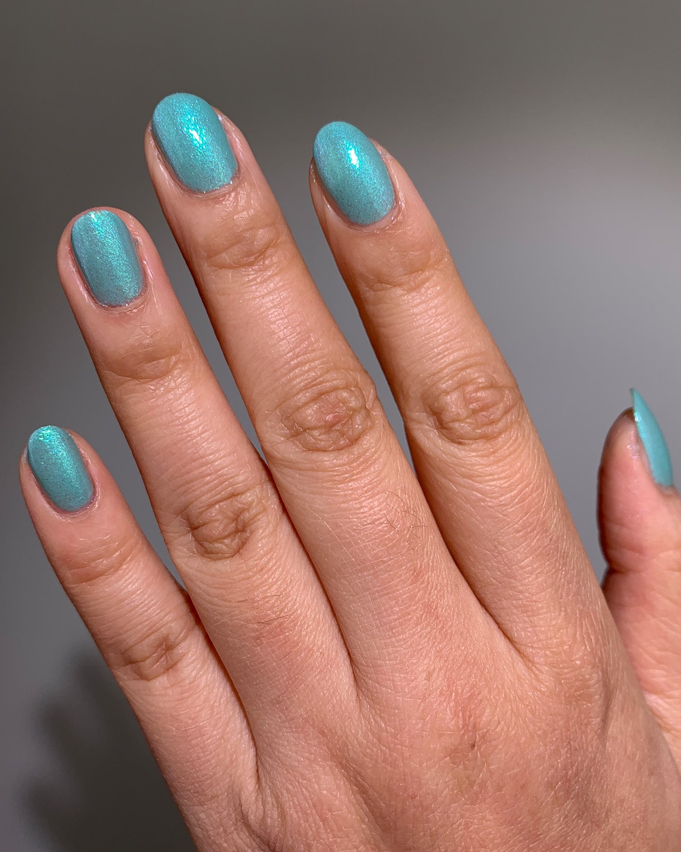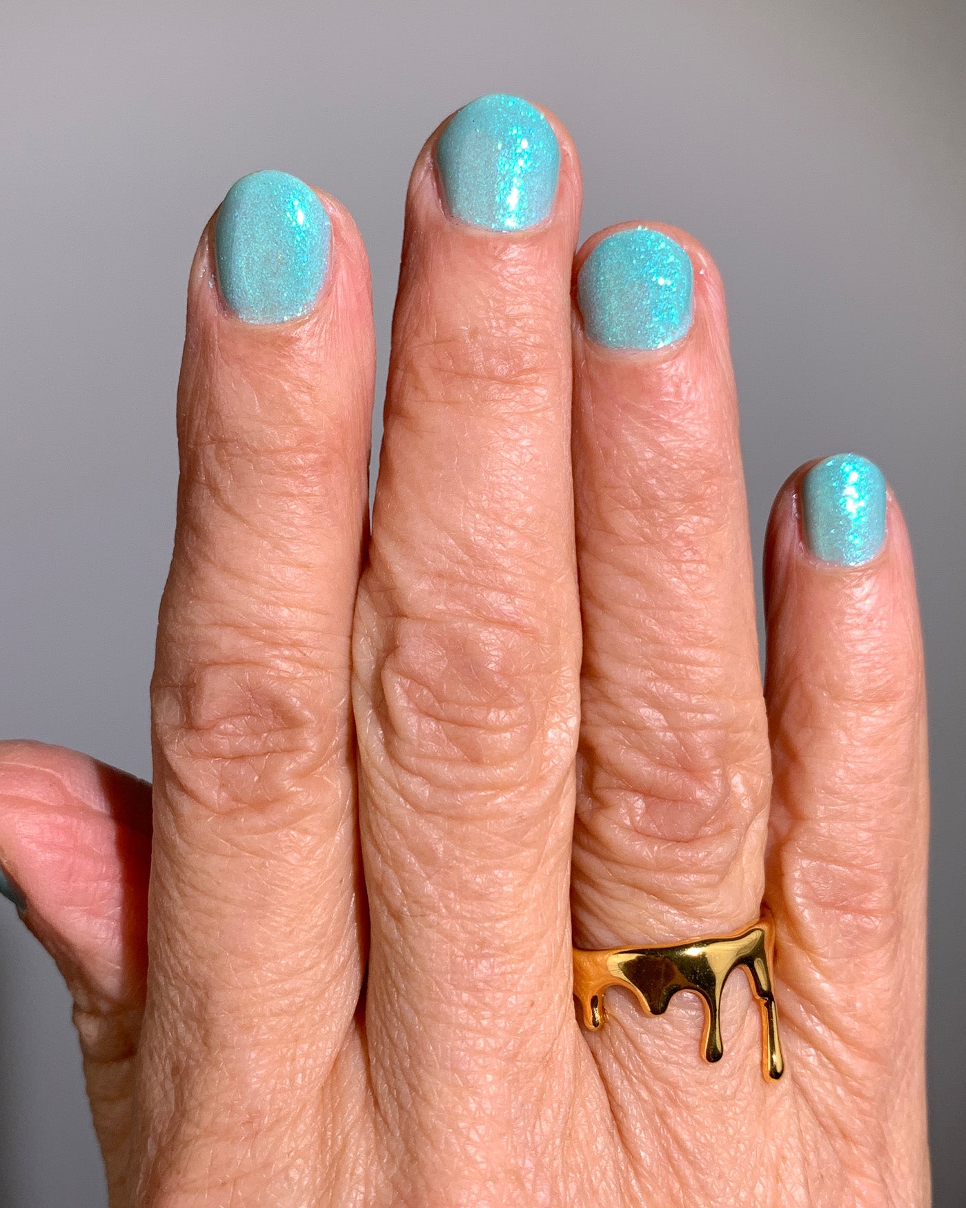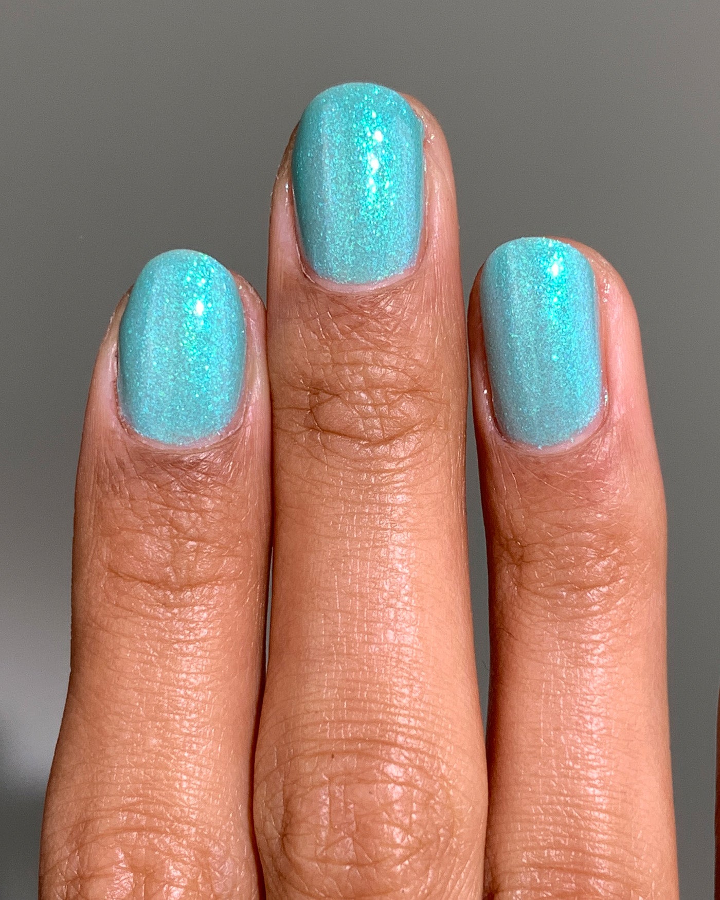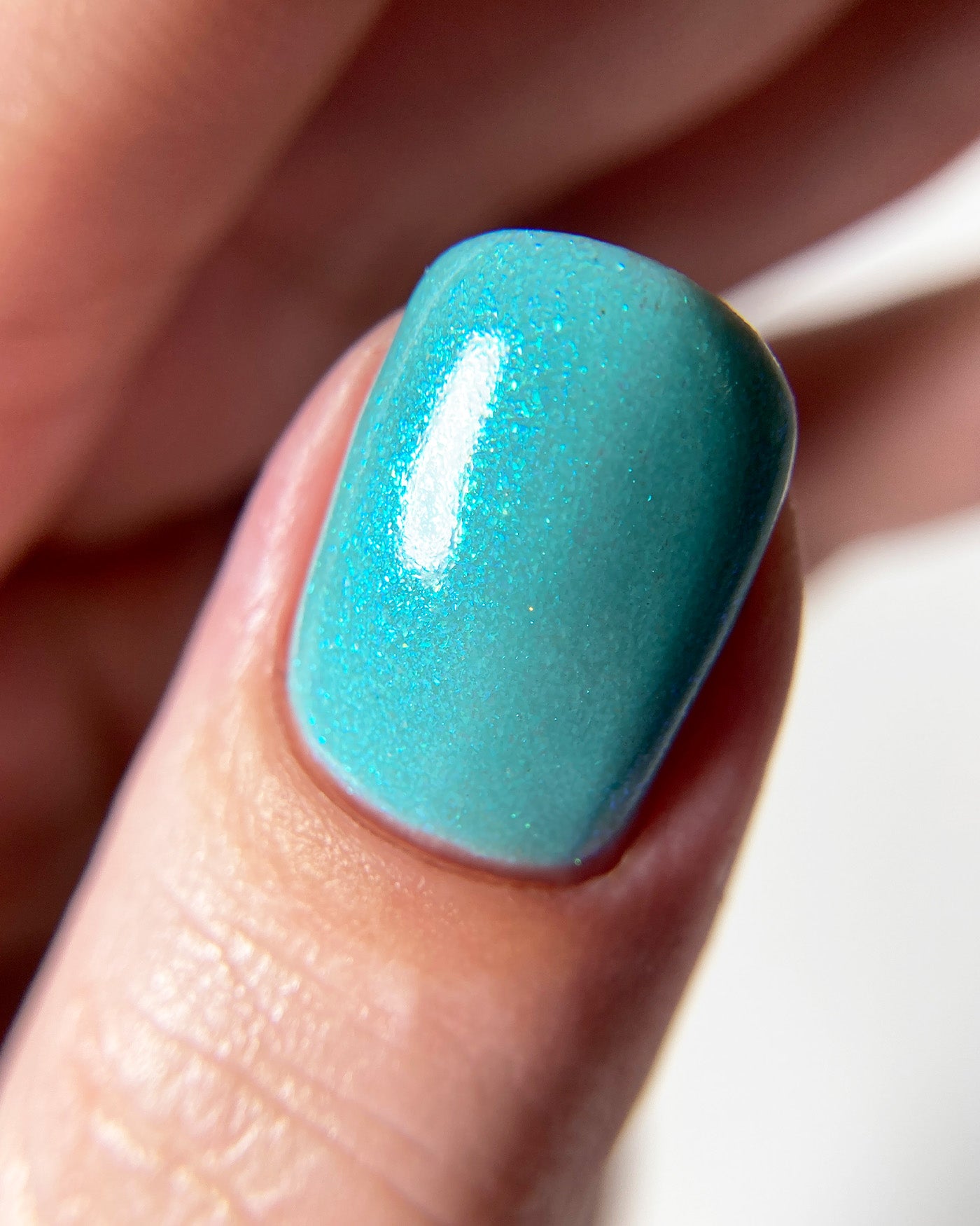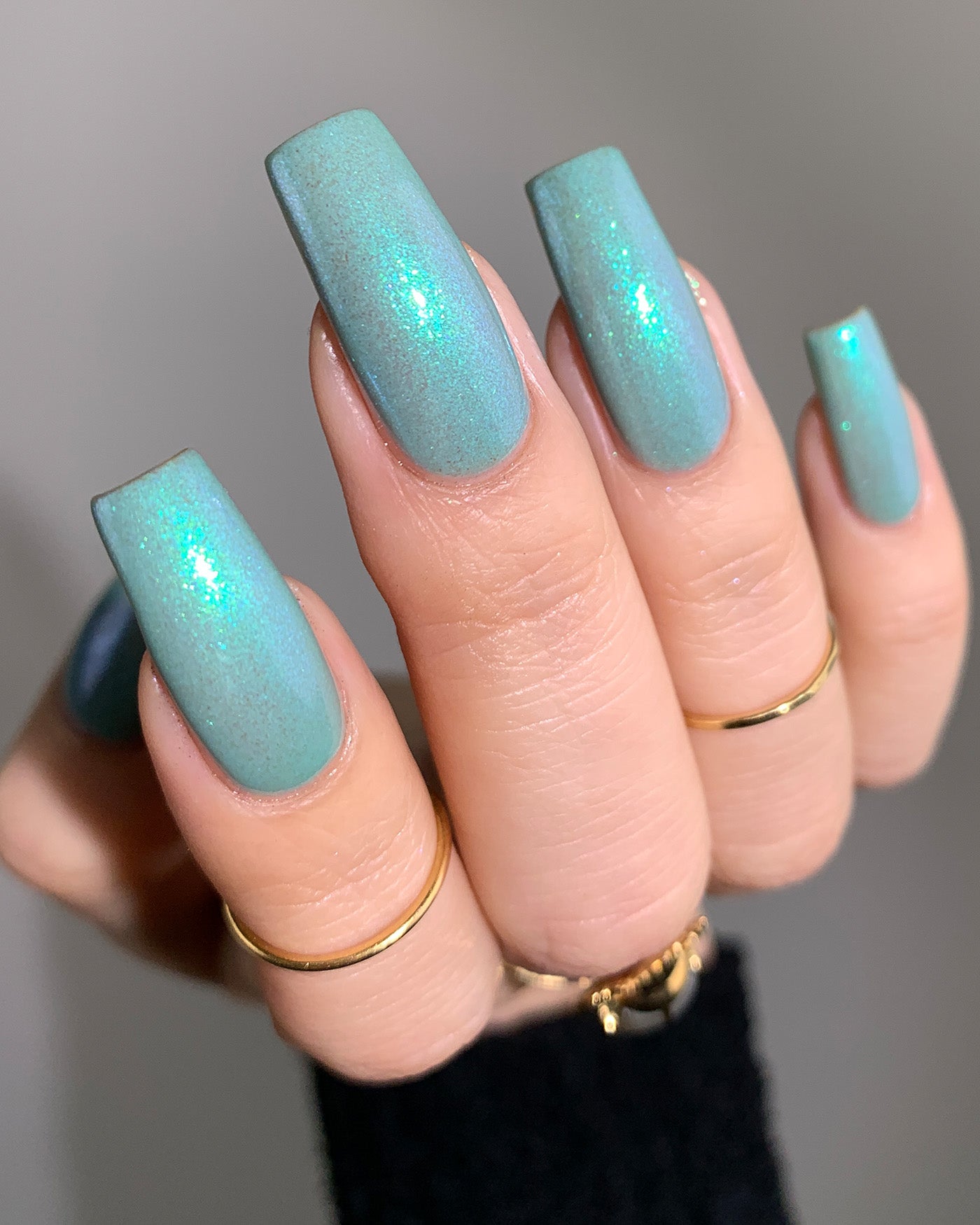 THE SIRENS’ REVENGE is a mint green lacquer filled with color-shifting blue-to-green shimmer. from the SONGS OF SIRENS SET.