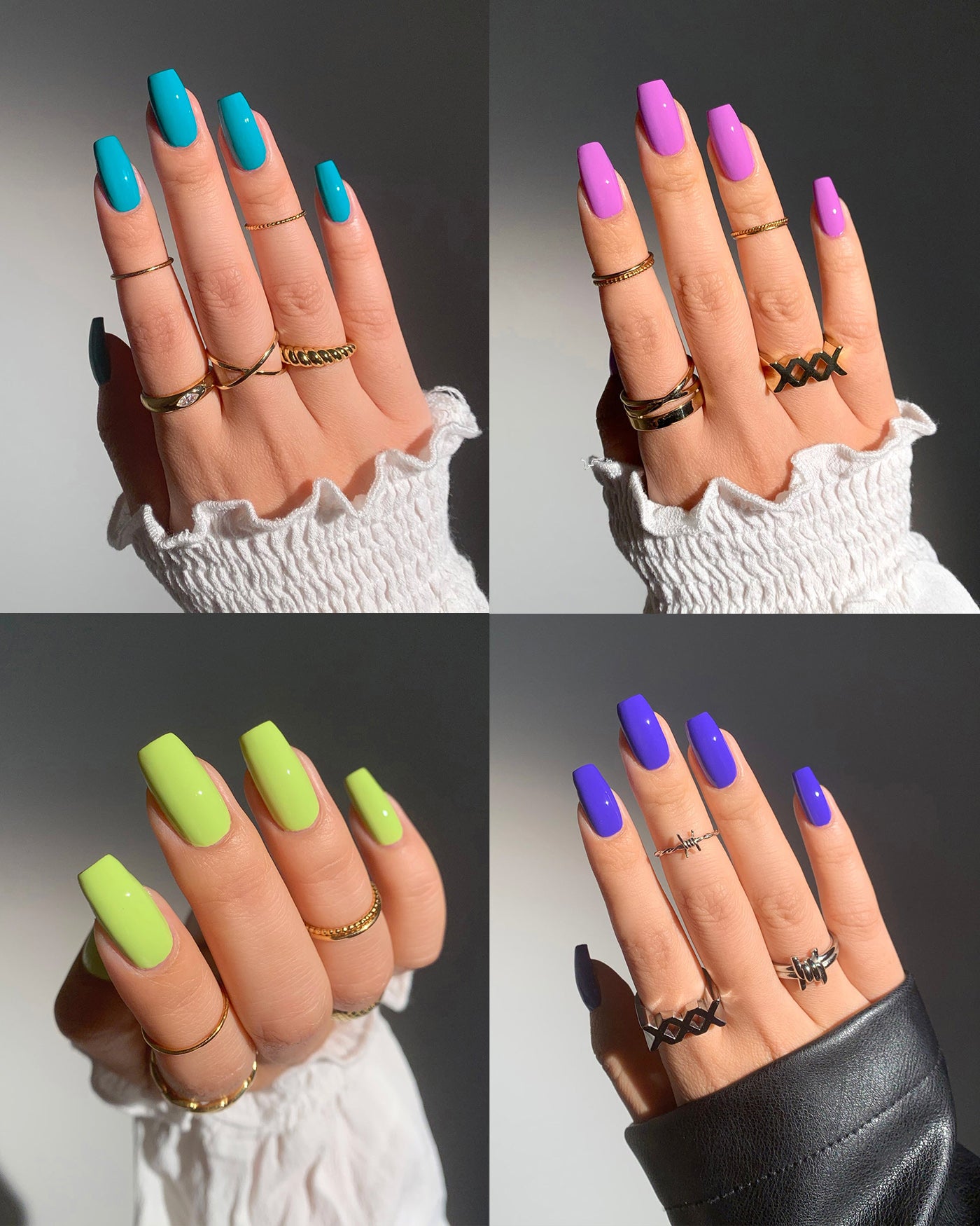the ULTRA VIBRANCE SET includes four cremes: ABANDONED BOARDWALKS, a vivid aqua lacquer, LOST POLAROIDS, a bright fuchsia lacquer, HIGHWAY GLOW, a luminous chartreuse lacquer, and MIDNIGHT DRIVE, a bold violet lacquer.