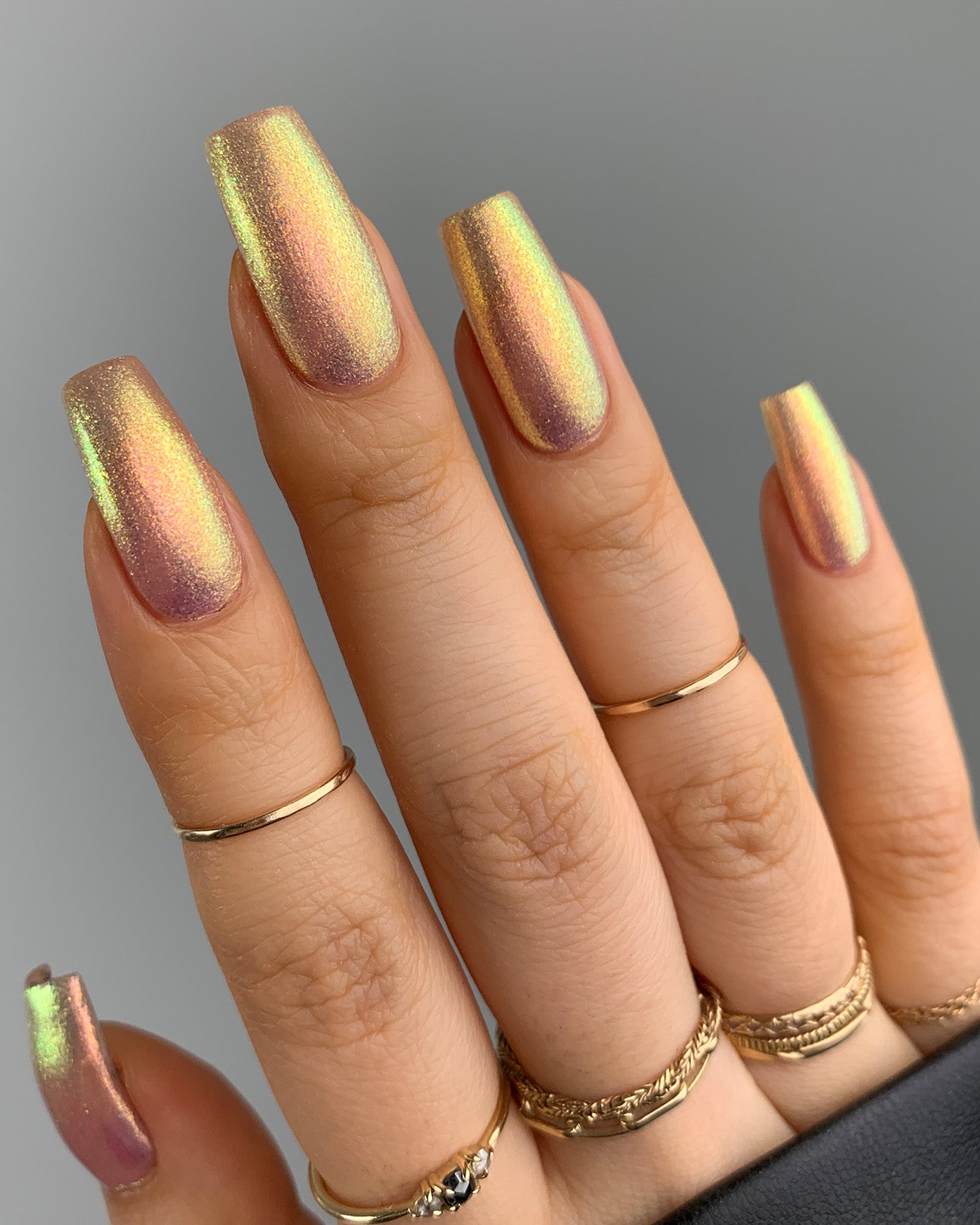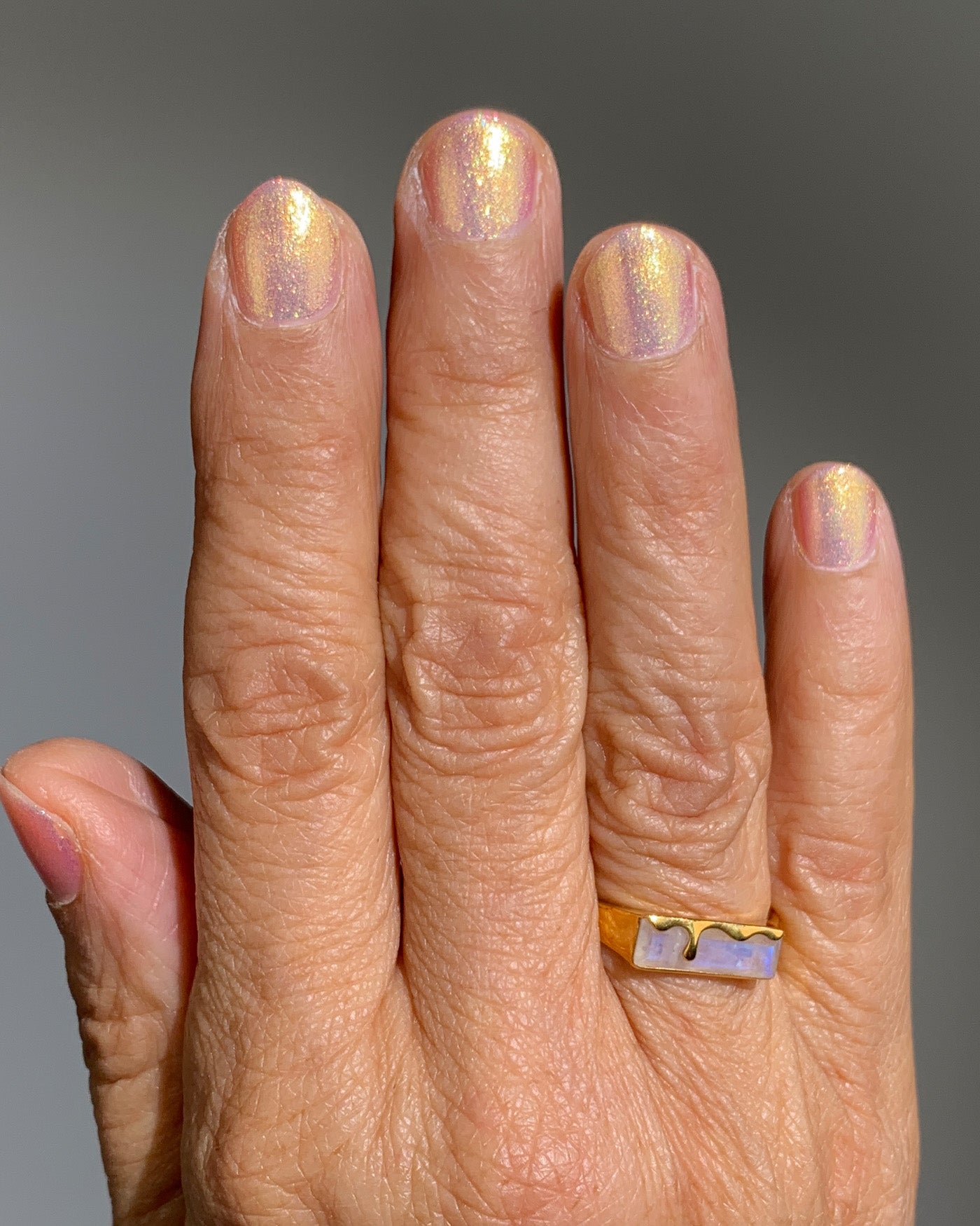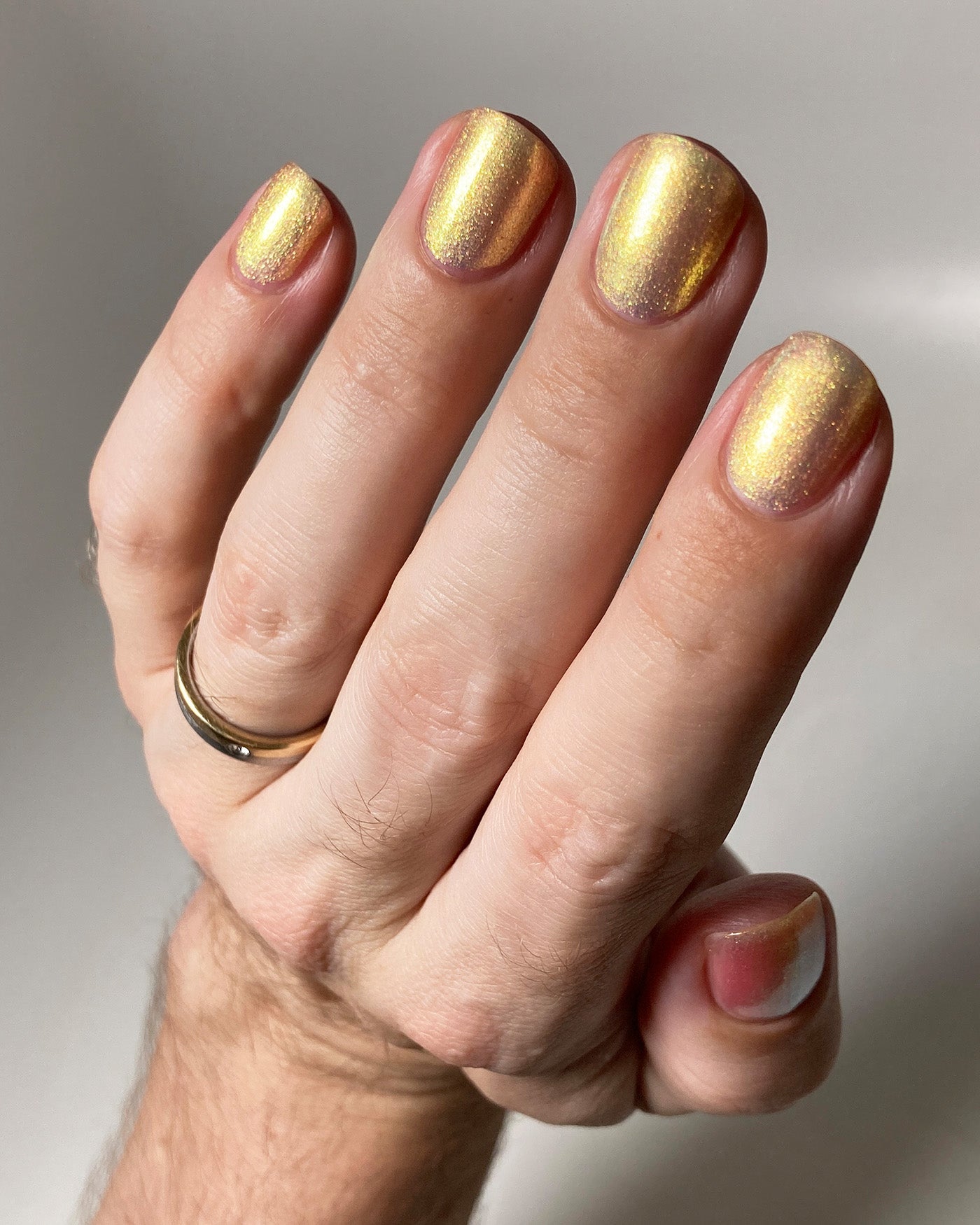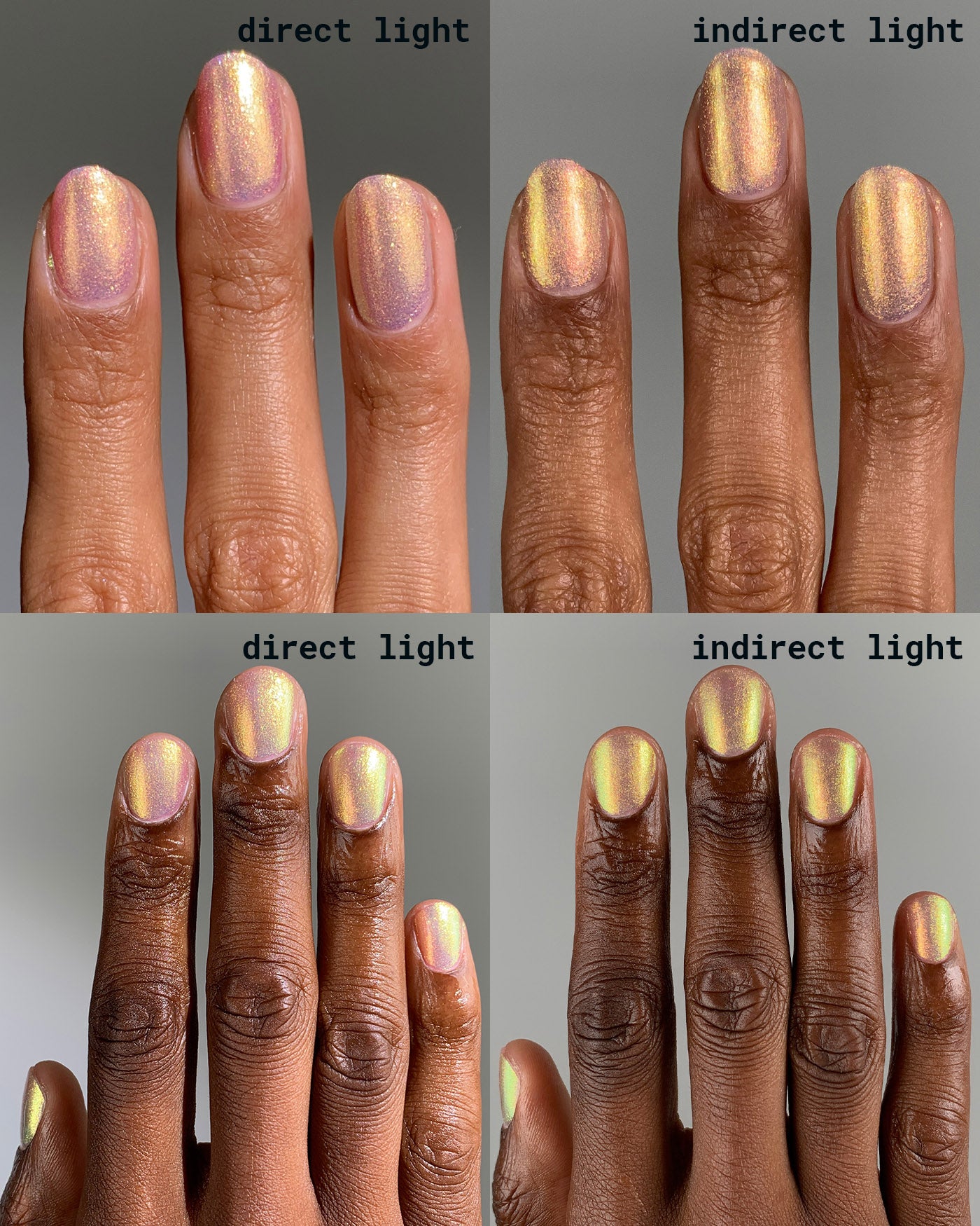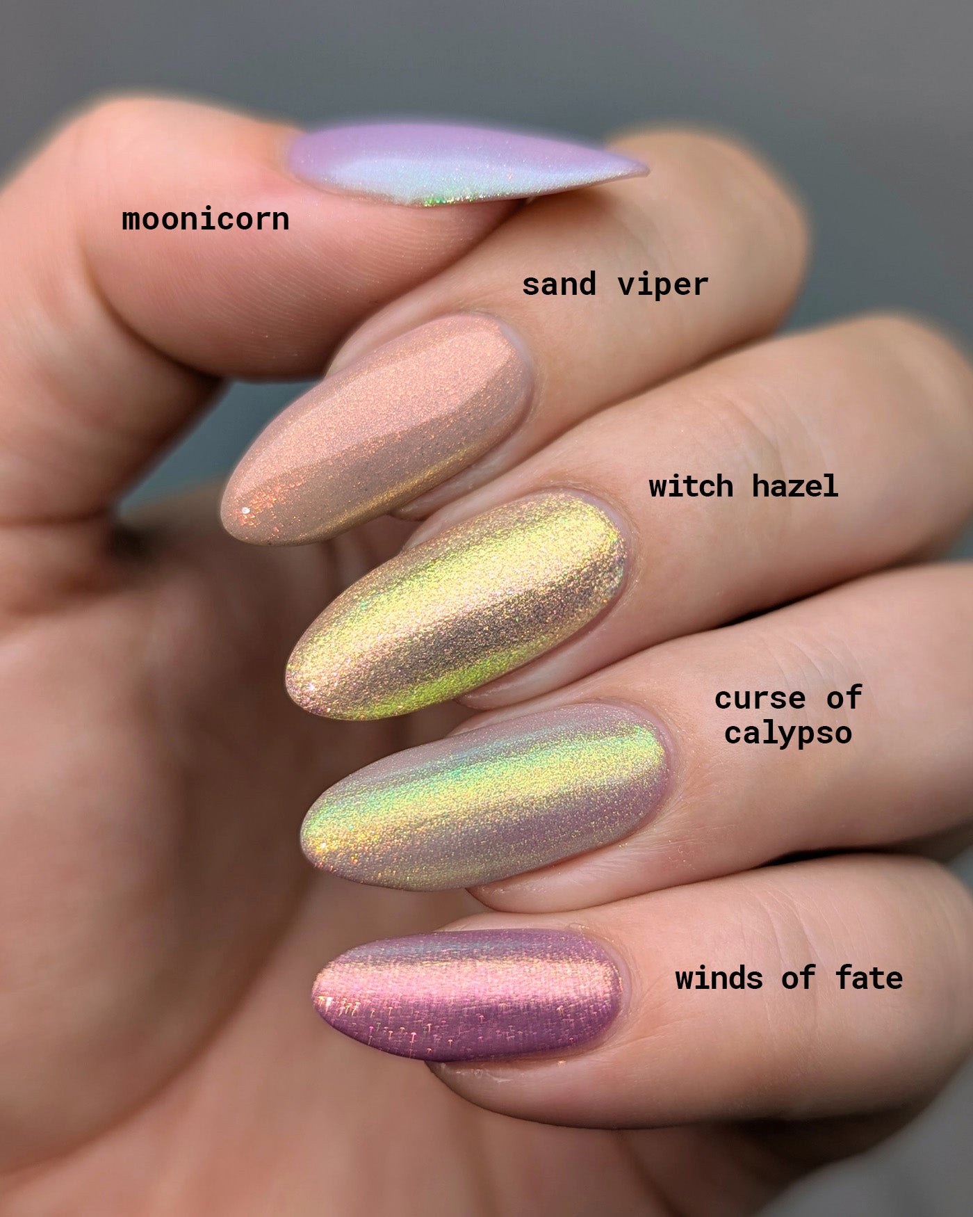 some may call this forever form-shifting peach-yellow shimmer “pure witchcraft.” and with this endlessly-shifty tincture’s ability to distract from nearly any affliction, that might not be far off. cursed with claw blah-ness? in need of inspiration? as it soothingly shimmers between golden and peach and subtly green hues, this otherworldly yellow has been known to instantly mellow any everyday woes brave enough to cross its path.