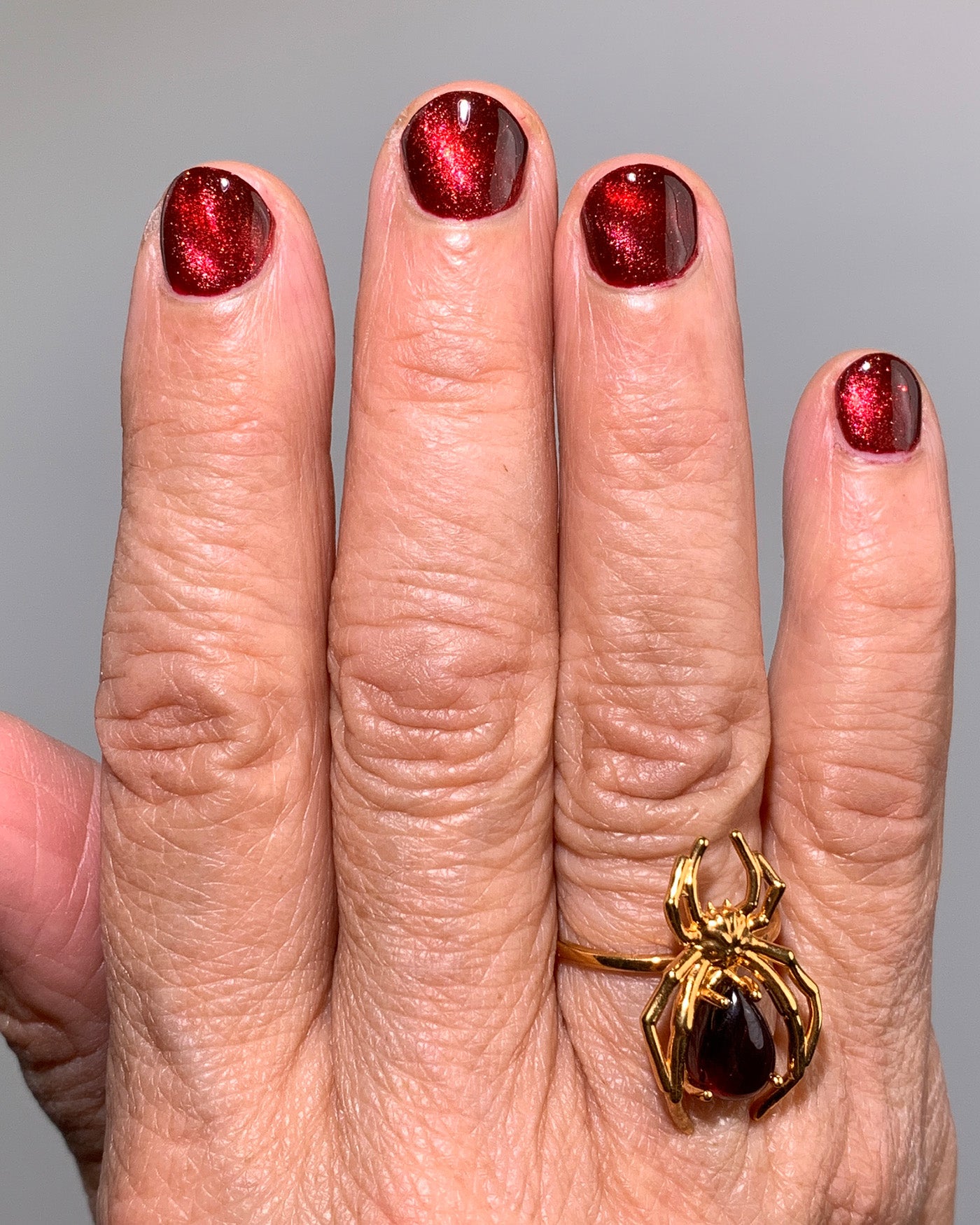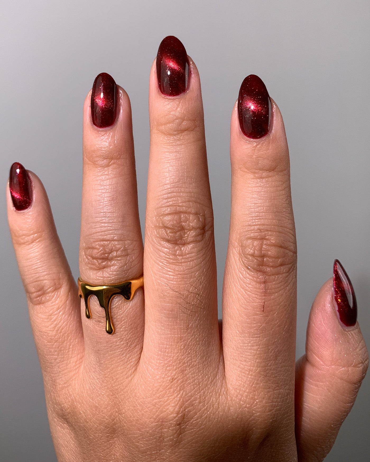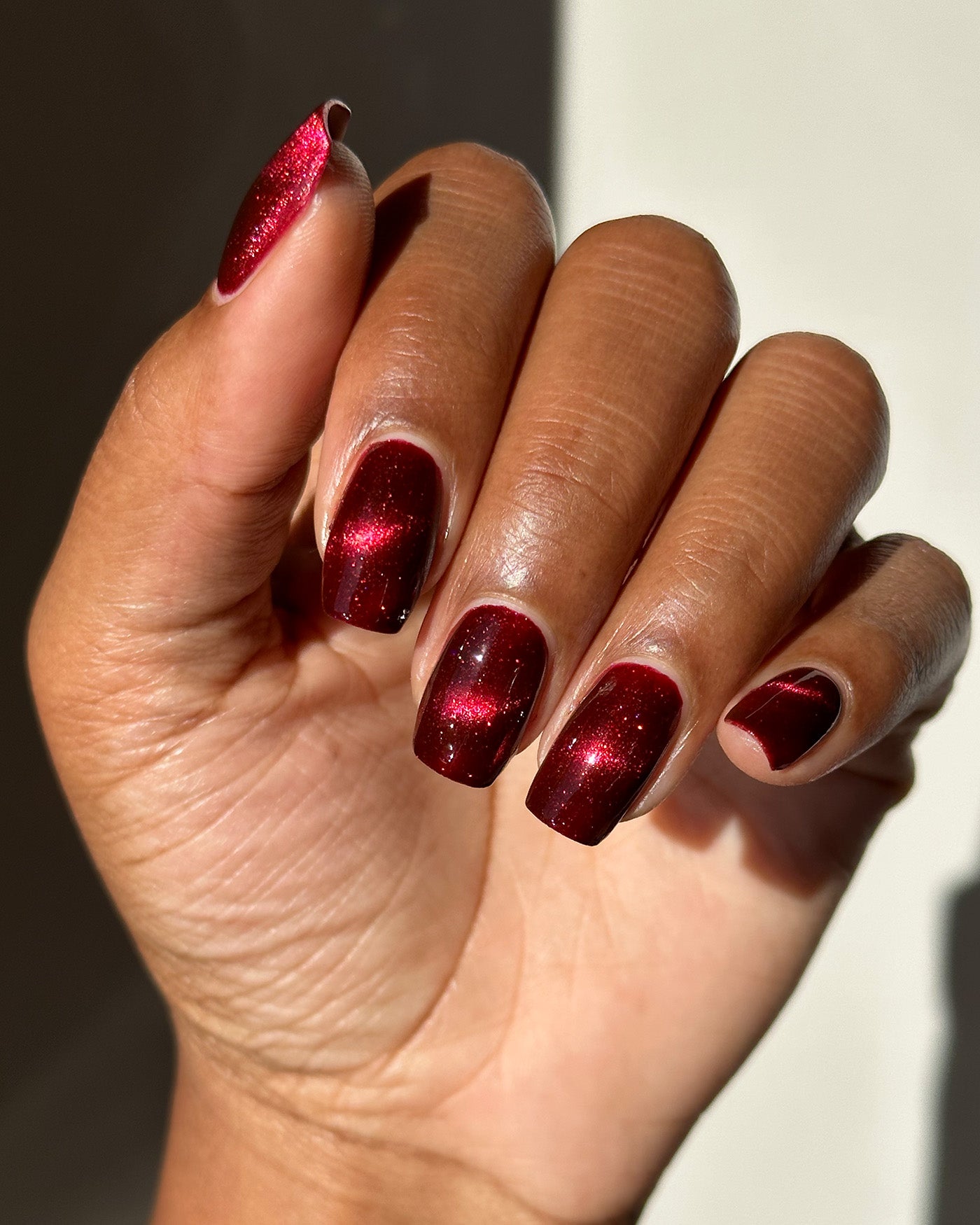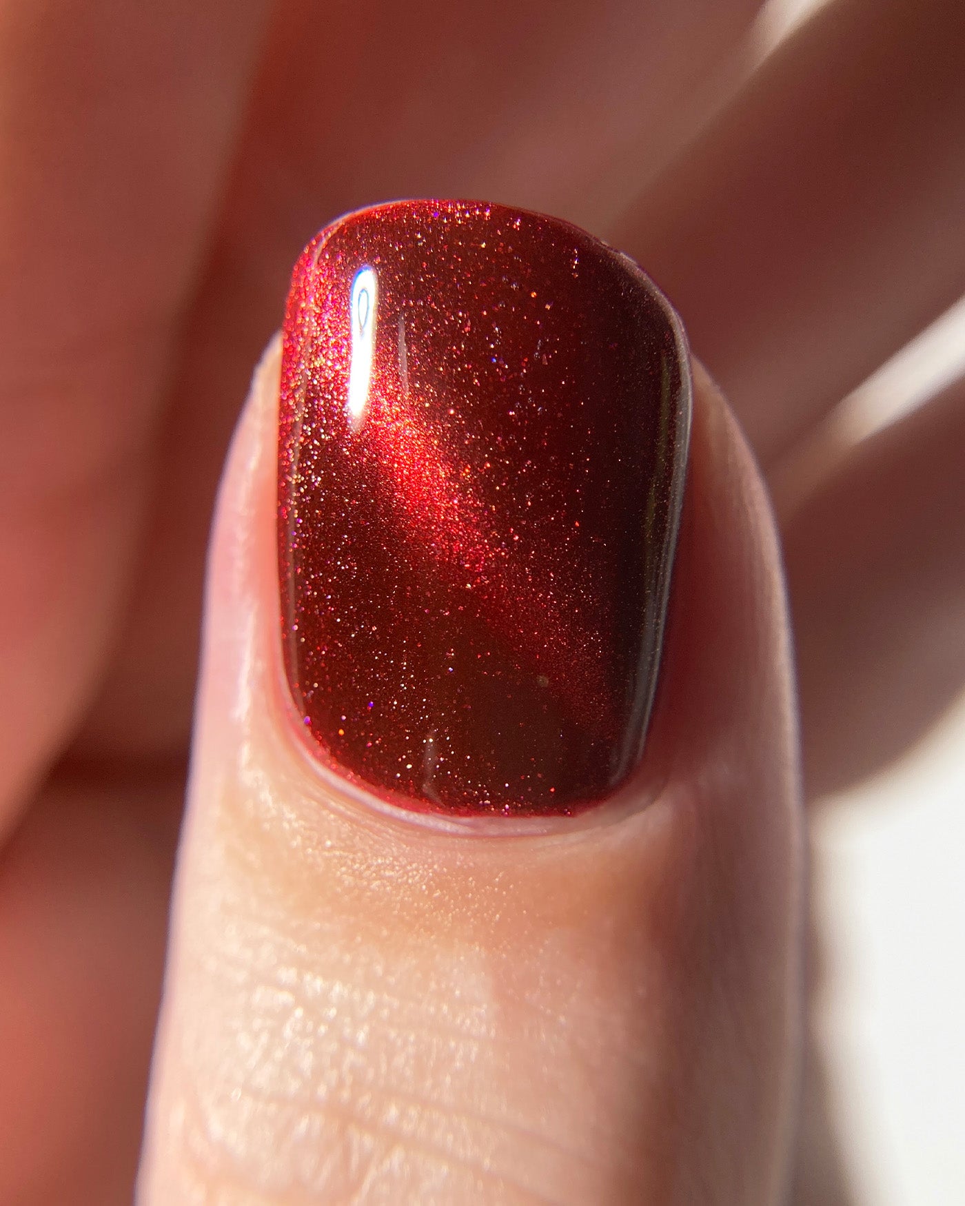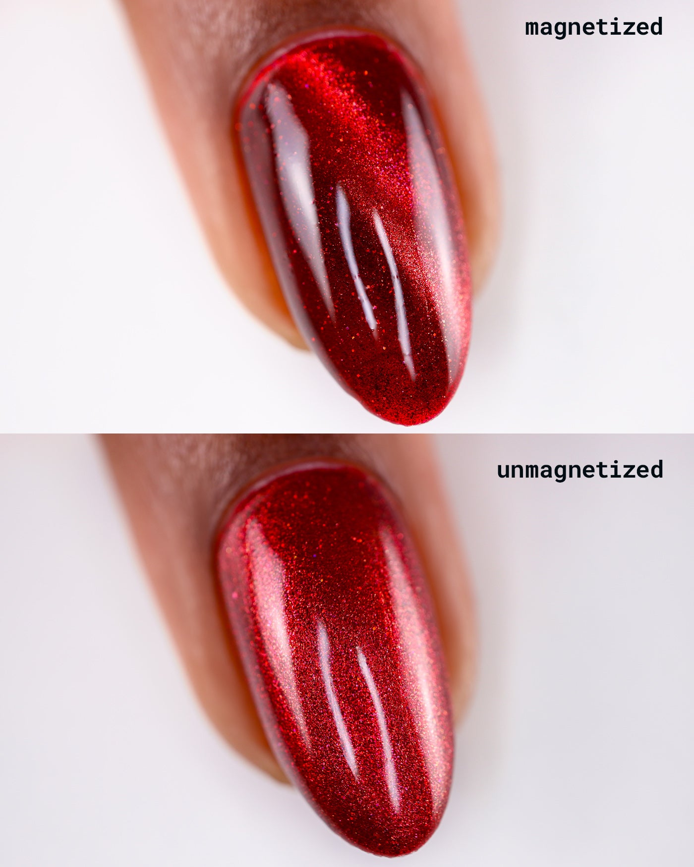 YOUR HEART’S A BLACK HOLE is a deep red magnetic lacquer filled with micro holo glitter that reveals a light red magnetic stripe.