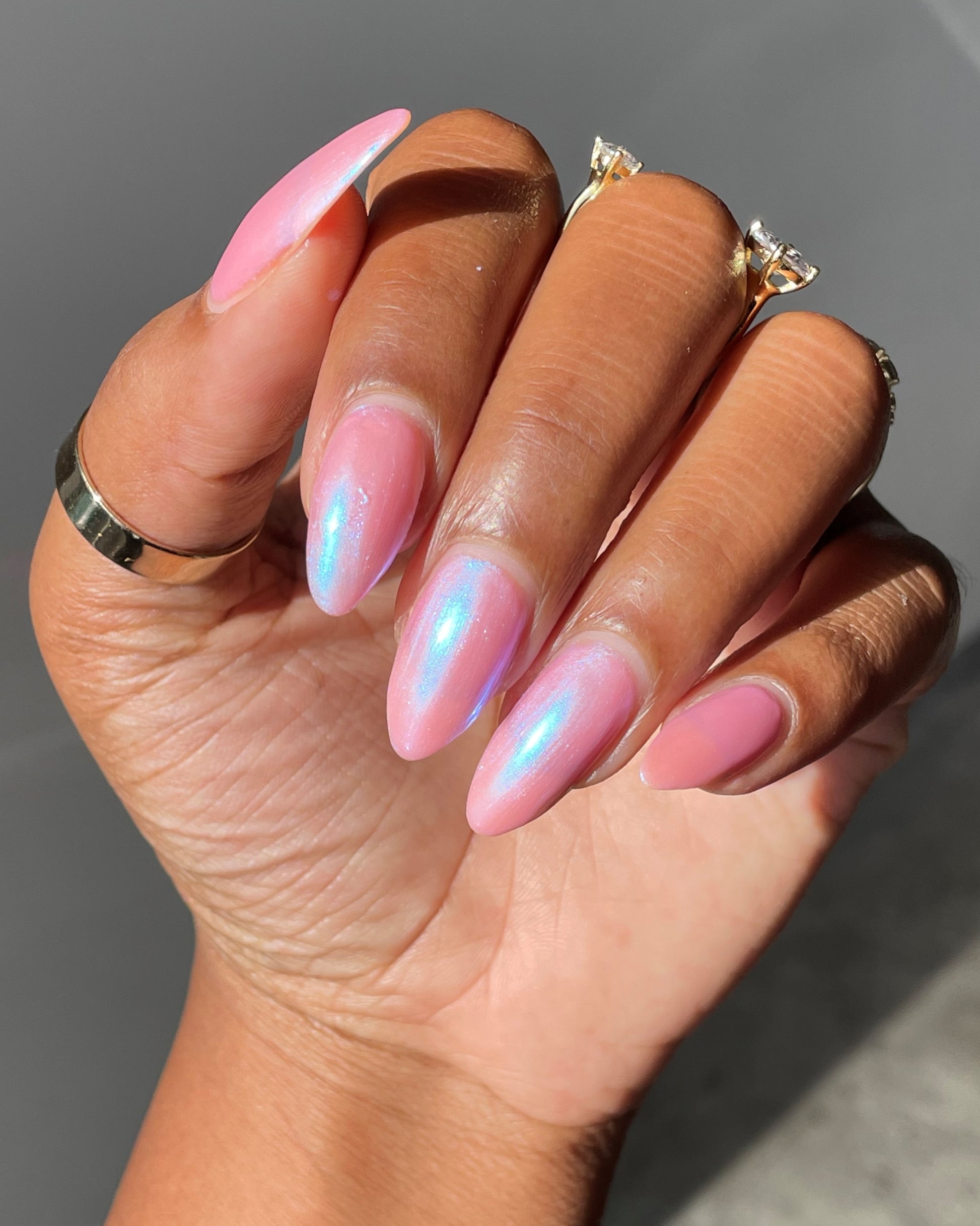 you’ve been hit by cupid’s arrow. fan the moonbeams from your sleeping eyes, as you coast through a romantic, rose-colored haze that’s shimmering with a blushing blue wink of midday magic. though this lacquer be but little, it is fierce, with an intoxicating iridescent sheen that’ll leave you utterly lovestruck.
