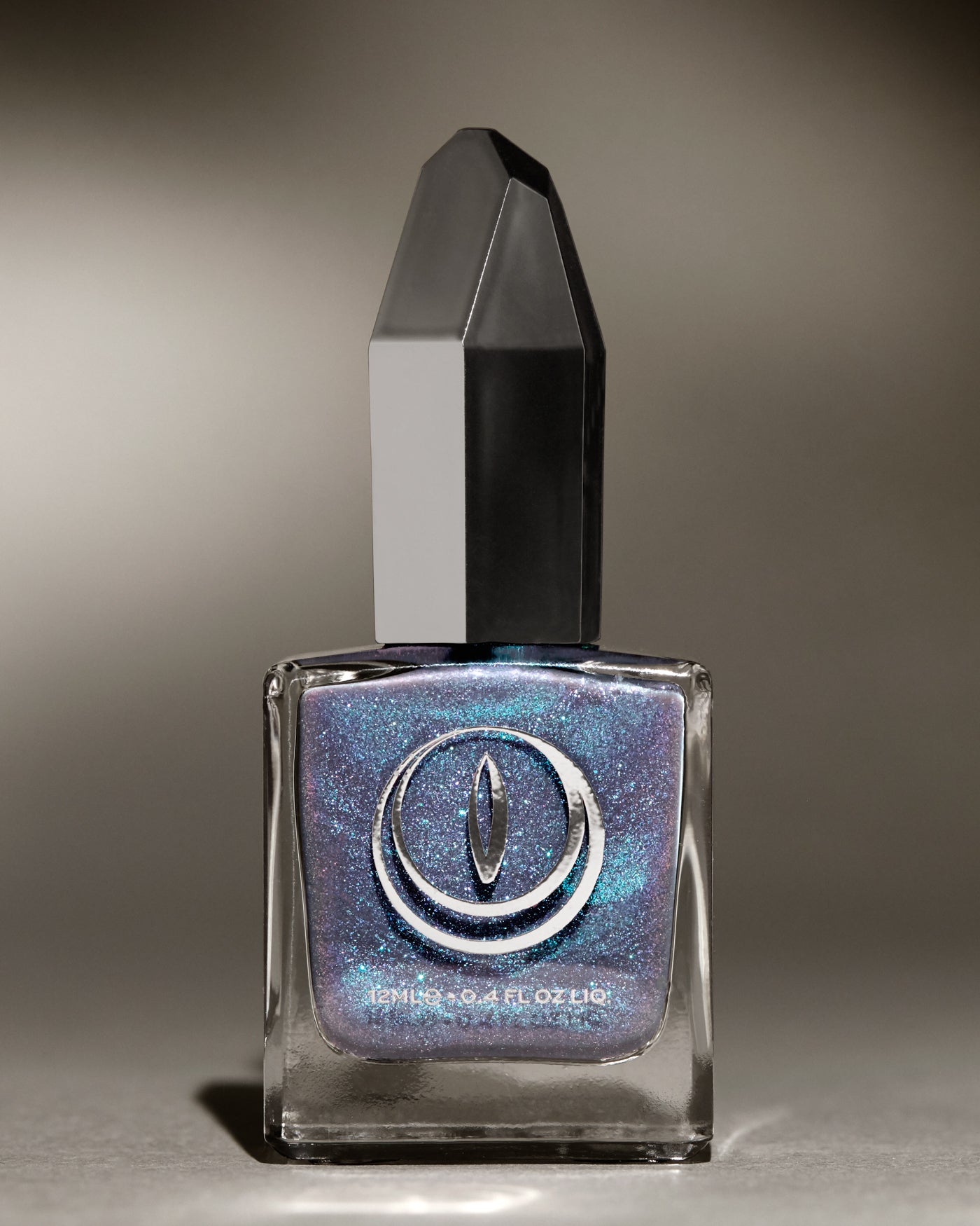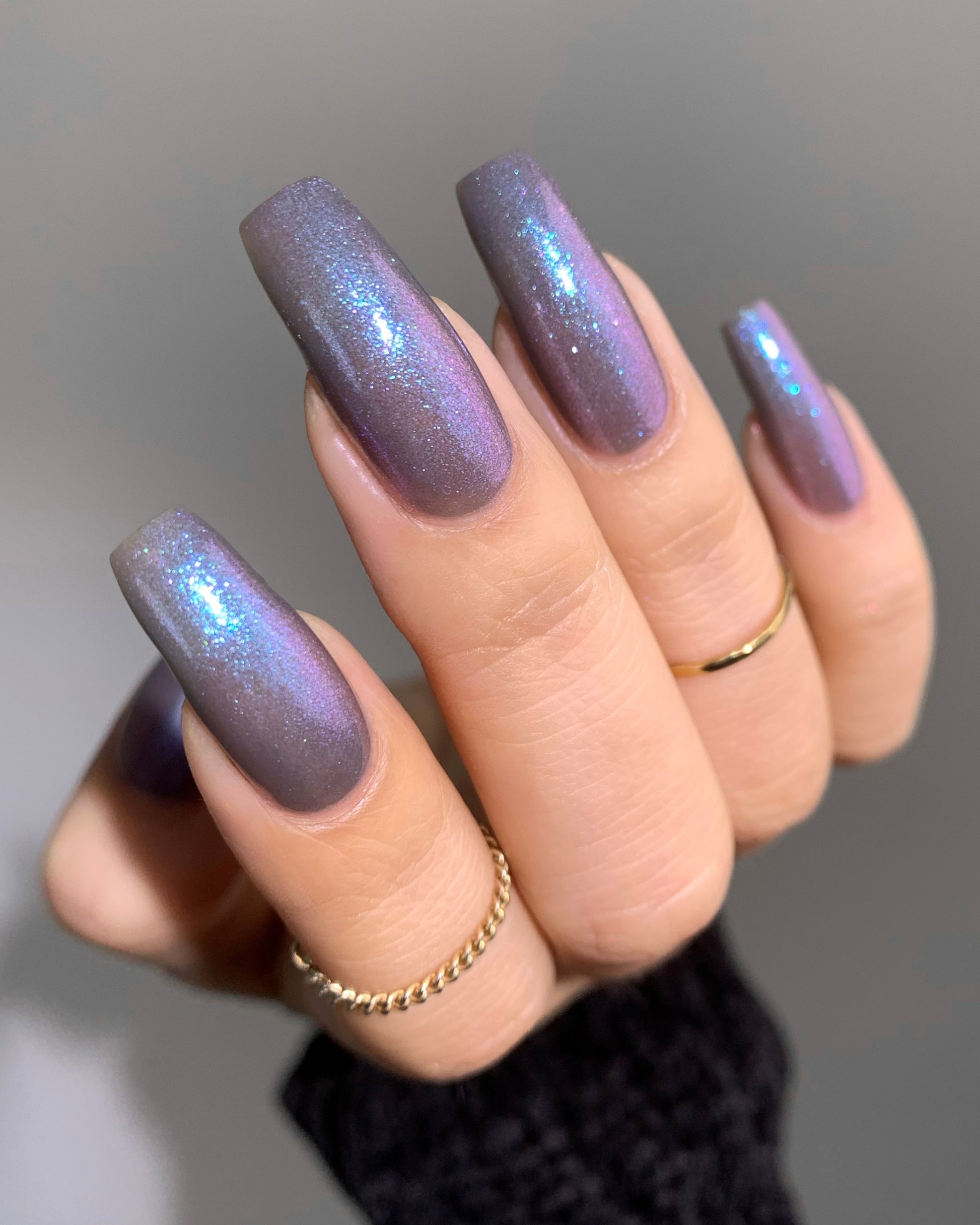 FALLEN ANGELS is a smokey gray lacquer filled with blue and purple shimmer.