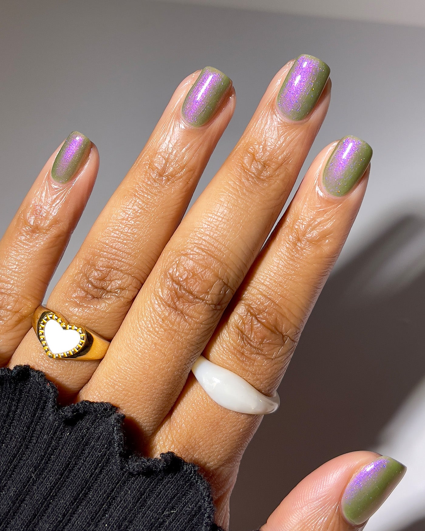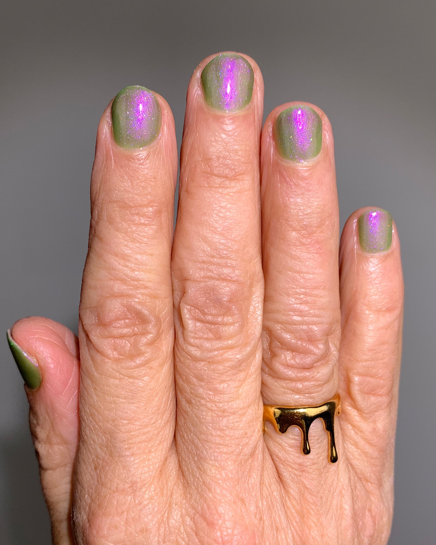 I think of this as a quintessential Mooncat lacquer: unexpected color combination and a beautiful mesmerizing effect! What a gorgeous addition for our collections!! Love the purple shimmer and fresh green color.