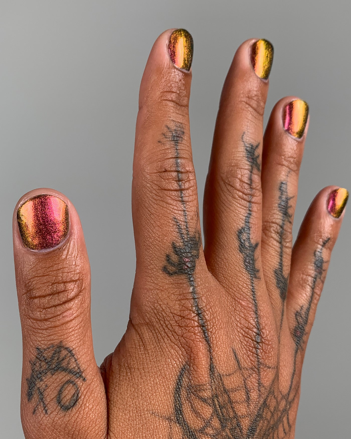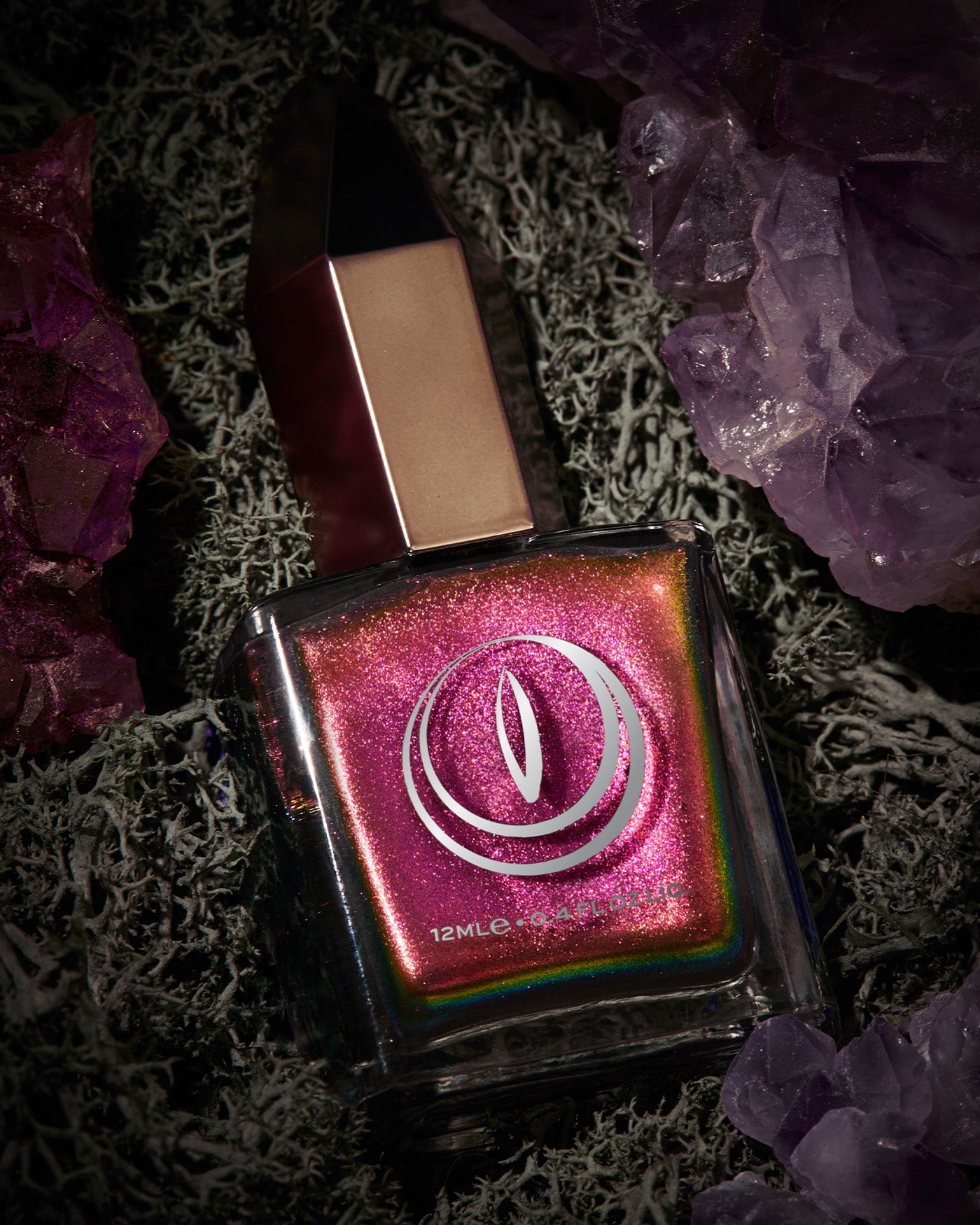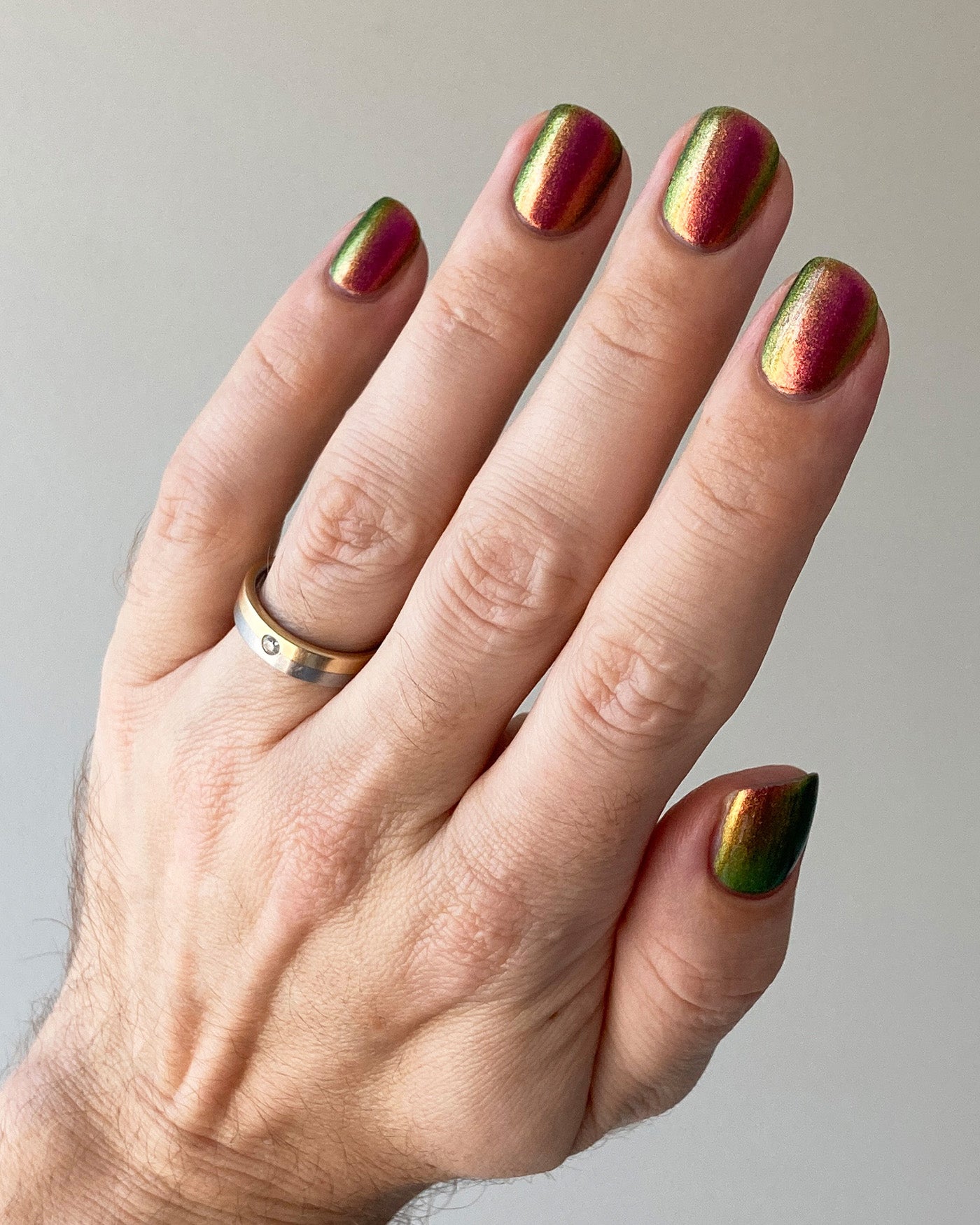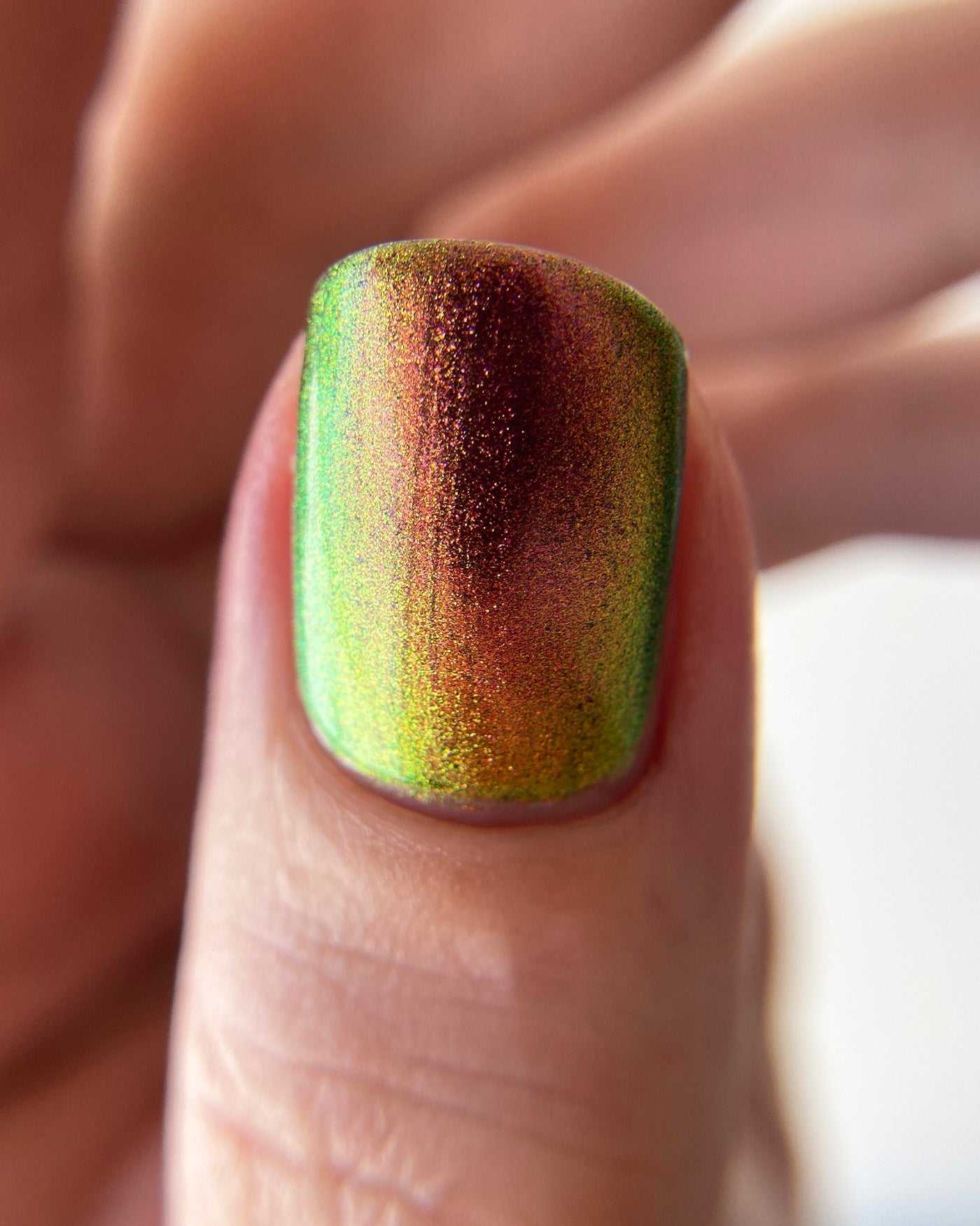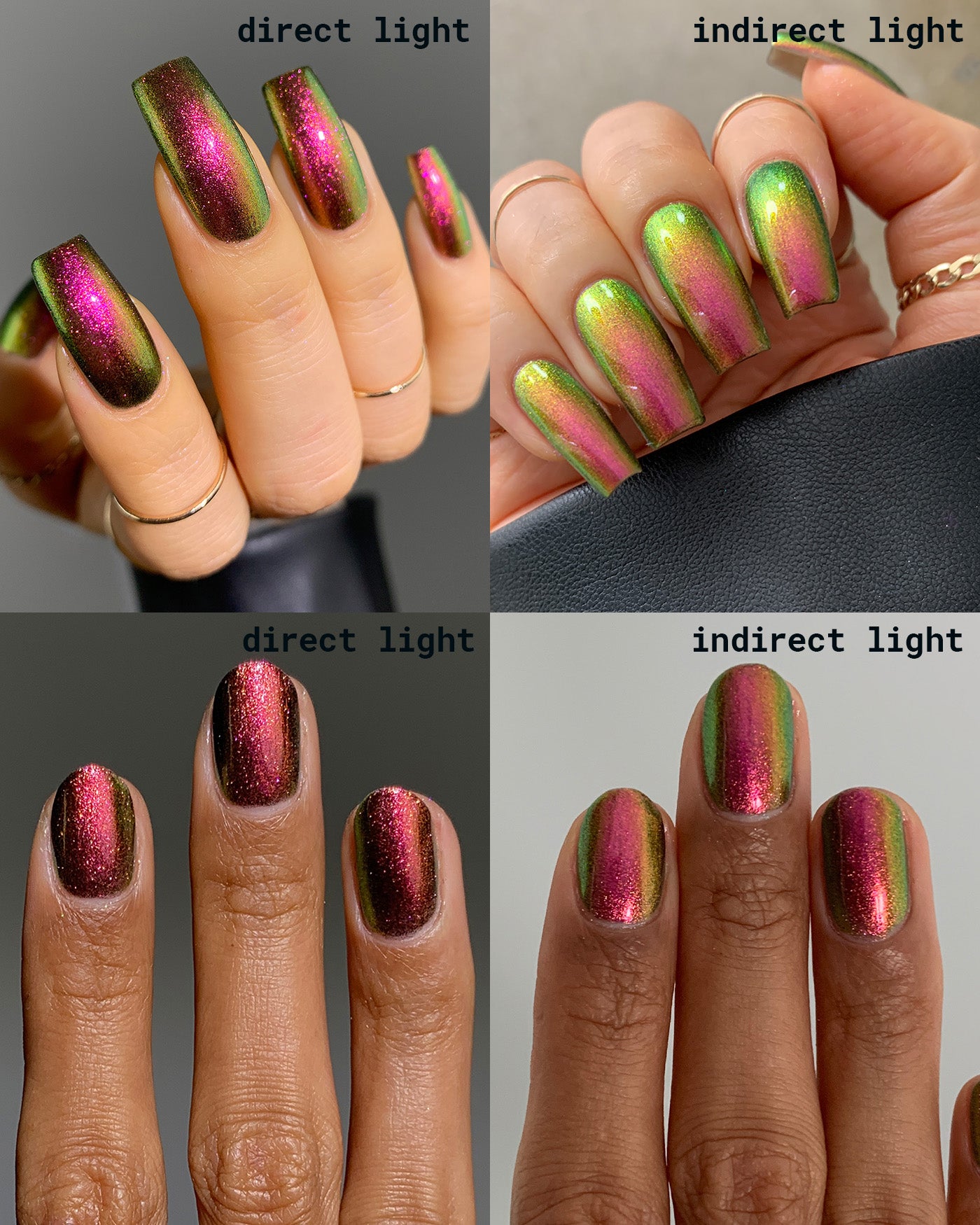 JEWEL BEETLE is a multichrome lacquer that shifts between shades of pink, gold, and green as it’s viewed from different angles. from the FALLEN SET.