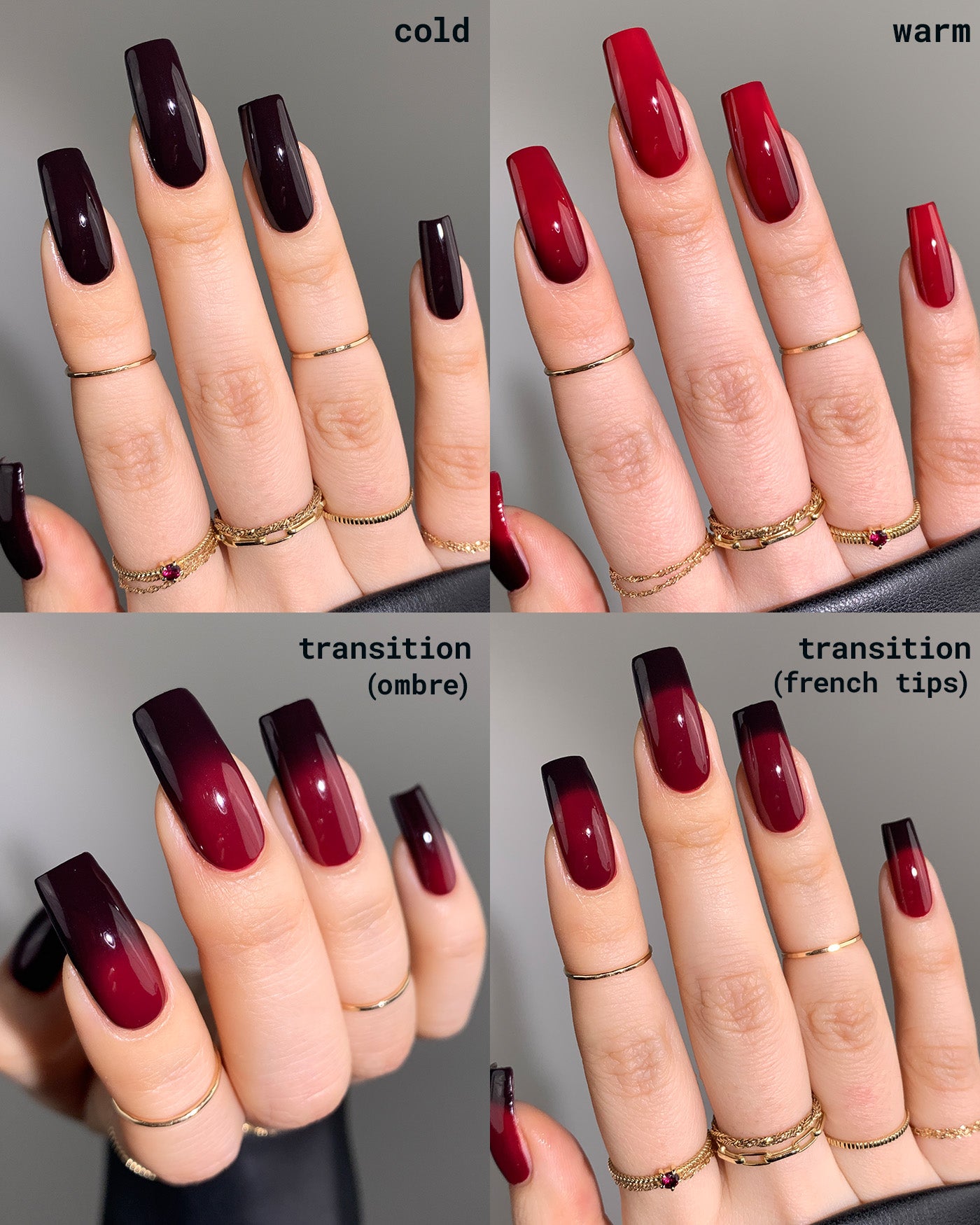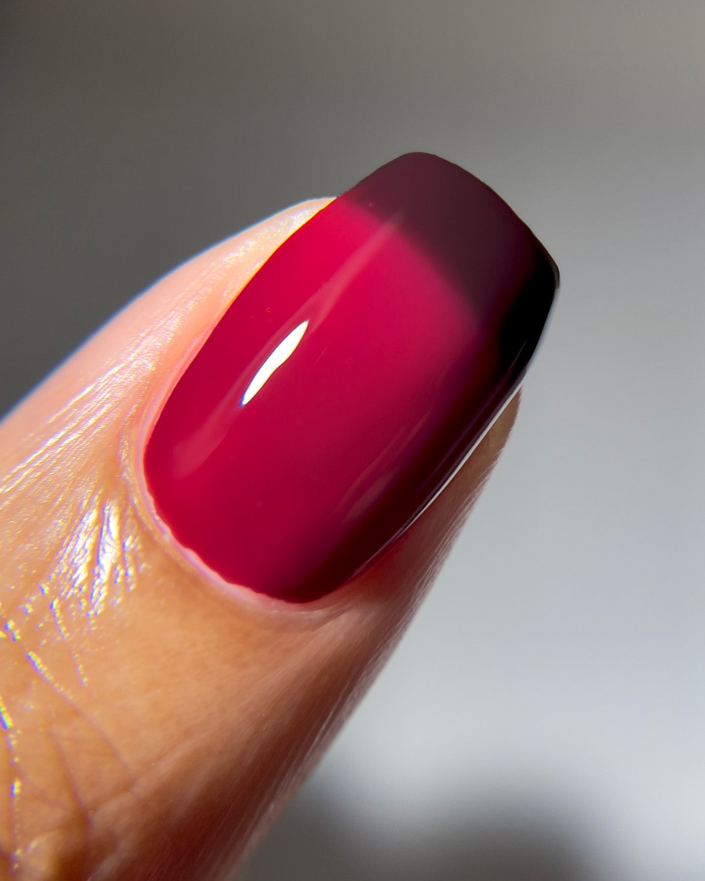 welcome to limbo. cycle through every shade of desire with a fiery thermal lacquer prone to shift with your every fluctuation in fahrenheit. as your temperature rises, and your claws thaw, you’ll see them transition from a deep shade of wine red to a shade of raspberry red. as your feelings chill, you’ll watch as they cycle right back to a deep wine red yet again. occupy the tricky inbetween? and your claws will meld into an ombre-like purgatory. it’s a true study of heat.