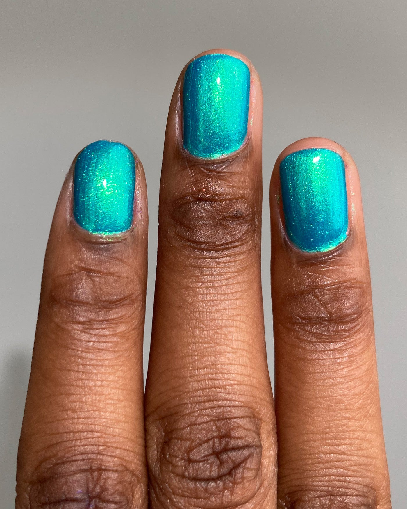 If you're looking for a bright Teal color, this is definitely it. The formula is super smooth and the color leans much more teal in person with hints of a green shimmer at more extreme angles.