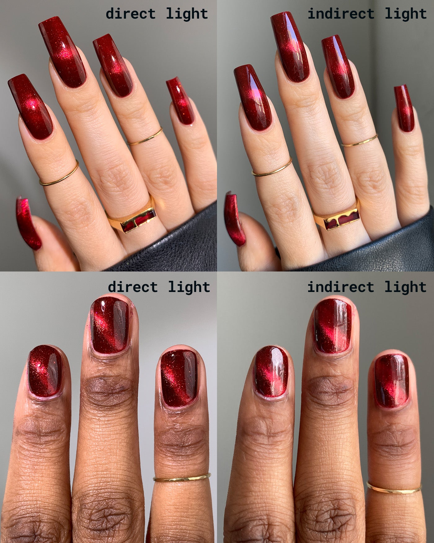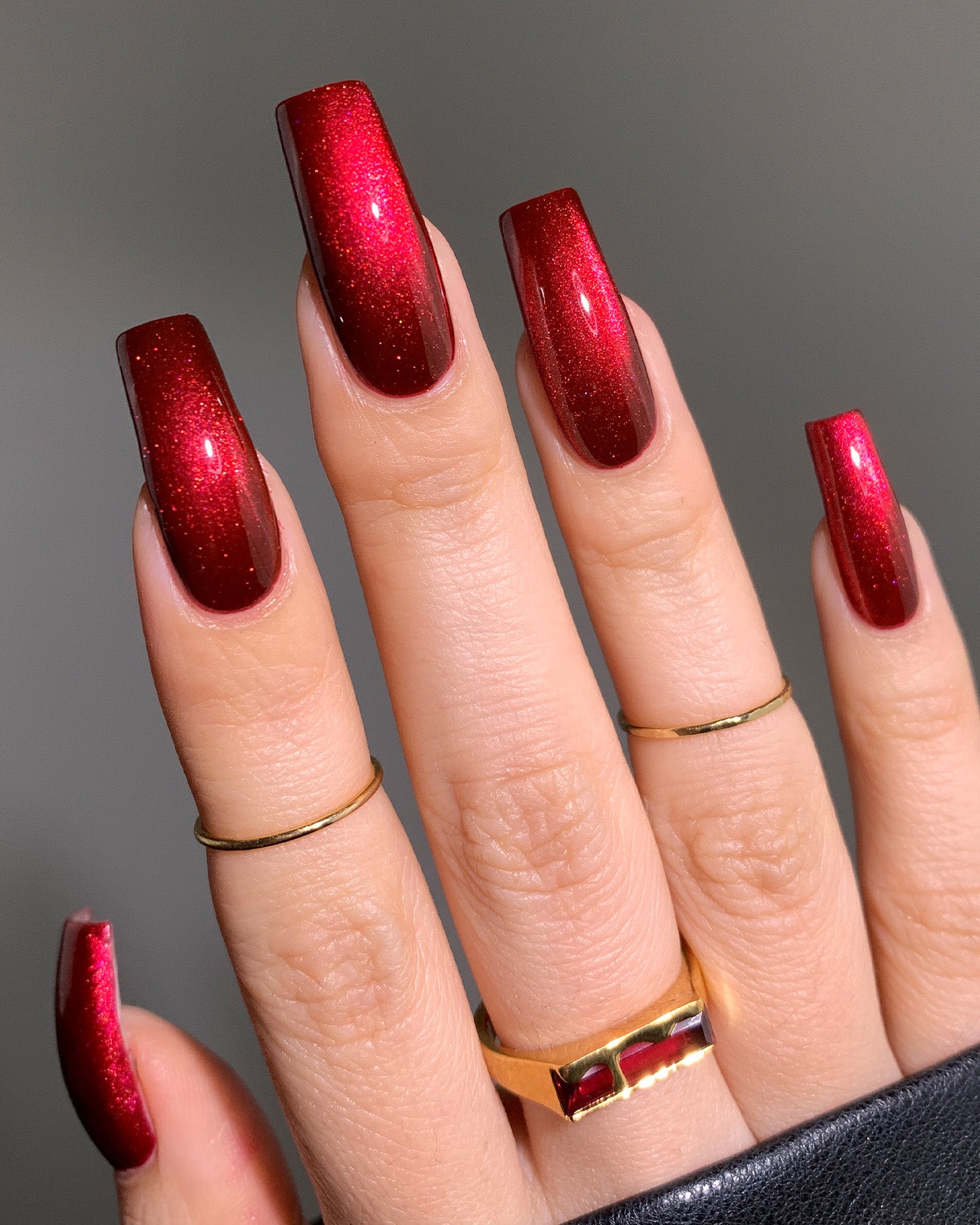 YOUR HEART’S A BLACK HOLE is a deep red magnetic lacquer filled with micro holo glitter that reveals a light red magnetic stripe.